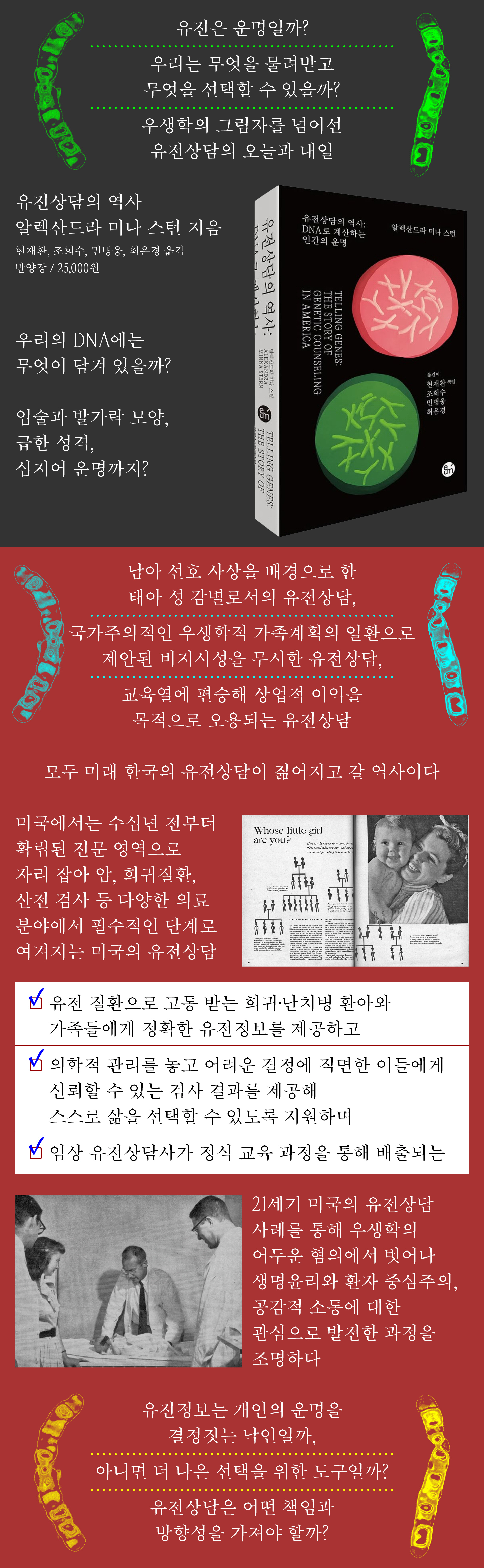 ¡ºÀ¯Àü»ó´ãÀÇ ¿ª»ç¡»´Â ¿ì¸®³ª¶ó¿¡¼´Â ºñ±³Àû »ý¼ÒÇÑ À¯Àü»ó´ã(genetic counseling) ºÐ¾ßÀÇ ¿ª»ç¸¦ ¼Ò°³Çϴ åÀÌ´Ù. ÀÌ ºÐ¾ß°¡ ¹ß´ÞÇÑ ¹Ì±¹ÀÇ »ç·Ê¸¦ ÃÖÃÊÀÇ °³Ã´ÀÚµé°ú ½Ç¹«ÀÚµéÀ» ´ë»óÀ¸·Î ½ÉÃþ ÀÎÅͺ並 ÁøÇàÇÏ°í ¾ÆÄ«ÀÌºê ¿¬±¸¸¦ º´ÇàÇØ¼ ¿¬±¸ÇÑ °á°ú¸¦ ´ã¾Ò´Ù. ¿ì¸®³ª¶ó¿¡´Â ¼ÕÀ¸·Î ²ÅÀ» ¸¸ÇÑ ¼ýÀÚÀÇ Àü¹®°úÁ¤ÀÌ ÃÖ±Ù¿¡¾ß ´ëÇп¡ ¼³¸³µÇ¾ú°í À¯Àü»ó´ã»ç°¡ 100¸íÀÌ ¾ÈµÉ Á¤µµÀÌÁö¸¸ ¹Ì±¹¿¡´Â 28°³ ´ëÇп¡ °úÁ¤ÀÌ ¼³Ä¡µÇ¾ú°í 7000 ¸íÀÇ À¯Àü»ó´ã»ç°¡ Ȱµ¿Çϰí ÀÖ´Ù. ÀúÀÚ´Â ºÏ¹Ì Áö¿ª ´ëÇÐ °úÁ¤À» À̲ö ´Ùä·Î¿î Àι°µéÀÇ °³ÀÎÀû, Á¤Ä¡Àû µ¿±â¸¦ Ž»öÇß´Ù. ±× °á°ú À¯Àü»ó´ãÀÌ 20¼¼±â ÃʹÝÀÇ ¿ì»ýÇÐ ¿îµ¿¿¡ °ÇÏ°Ô ¿µÇâÀ» ¹Þ¾Æ ½ÃÀ۵Ǿú°í ¿À´Ã³¯ÀÇ À¯Àü»ó´ã»çµéµµ ±× ¿µÇâÀ» ¹ÞÀº Á¶¾ðÀ» Çϰí ÀÖ´Ù´Â °ÍÀ» ¹àÇû´Ù. ÀÌ Ã¥Àº ÀÌ·± °æÇâ¿¡ ´ëÇÑ °·ÂÇÑ ºñÆÇÀ» ´ã°í ÀÖ´Ù.