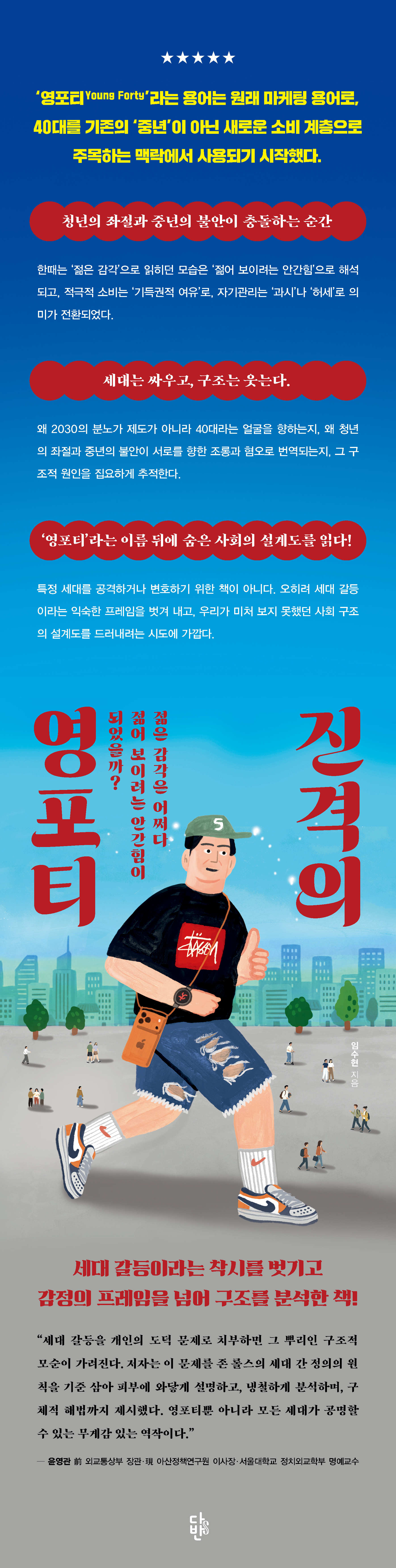 ±×¸®°í ±× °úÁ¤¿¡¼ ¾î´À ÇÑÂÊÀÇ ¸ñ¼Ò¸®¸¸ ÁõÆøµÇÁö ¾Ê°í, ¼·Î ´Ù¸¥ ¼¼´ë°¡ °¢ÀÚÀÇ ÀÚ¸®¿¡¼ °í°³¸¦ ²ô´öÀÌ¸ç »ý°¢À» ÀÌ¾î °¥ ¼ö ÀÖ´Â ¼º¼÷ÇÑ ´ëÈÀÇ °ø°£ÀÌ ¿¸± ¼ö ÀÖ´Ù¸é, ±×°ÍÀ¸·Î ÀÌ Ã¥ÀÇ ¿ªÇÒÀº ÃæºÐÇÏ´Ù°í »ý°¢ÇÕ´Ï´Ù. -p.7 ¡®¿µÆ÷ƼYoung Forty¡¯¶ó´Â Ç¥ÇöÀº óÀ½ºÎÅÍ ¼¼´ë °¥µîÀ» ¼³¸íÇϱâ À§ÇØ ¸¸µé¾îÁø ´Ü¾î°¡ ¾Æ´Ï´Ù. ÀÌ ¿ë¾î´Â ¿ø·¡ ¸¶ÄÉÆÃ ¿ë¾î·Î, 40´ë¸¦ ±âÁ¸ÀÇ ¡®Á߳⡯ÀÌ ¾Æ´Ñ »õ·Î¿î ¼Òºñ °èÃþÀ¸·Î ÁÖ¸ñÇÏ´Â ¸Æ¶ô¿¡¼ »ç¿ëµÇ±â ½ÃÀÛÇß´Ù. ÀÌ ¿ë¾î°¡ µîÀåÇÑ 2010³â´ë Áß¹Ý, ƯÈ÷ 2015³â ÀüÈÄÀÇ ¸Æ¶ô¿¡¼ ¿µÆ÷Ƽ´Â ¡®ÀÚ±â°ü¸®¿Í ¼Òºñ °¨°¢À» À¯ÁöÇÏ´Â 40´ë¡¯¸¦ ÁöĪÇÏ´Â ºñ±³Àû ±àÁ¤Àû Ç¥ÇöÀ̾ú´Ù. -p.15 ÇѶ§´Â ¡®ÀþÀº °¨°¢¡¯À¸·Î ÀÐÈ÷´ø ¸ð½ÀÀº ¡®Àþ¾î º¸ÀÌ·Á´Â ¾È°£Èû¡¯À¸·Î ÇØ¼®µÇ°í, Àû±ØÀû ¼Òºñ´Â ¡®±âµæ±ÇÀû ¿©À¯¡¯·Î, ÀÚ±â°ü¸®´Â ¡®°ú½Ã¡¯³ª ¡®Çã¼¼¡¯·Î Àǹ̰¡ ÀüȯµÇ¾ú´Ù. ÀÌ·¯ÇÑ ºÎÁ¤Àû ÇØ¼®Àº °³ÀÎÀÇ ÃëÇâÀ̳ª ¼ºÇâÀ» ³Ñ¾î Çൿ ¾ç½Ä°ú ŵµ Àü¹ÝÀ¸·Î È®ÀåµÇ¾î, °á±¹ ¿µÆ÷Ƽ´Â ¡®¾ðÇàºÒÀÏÄ¡¡¯, ¡®³»·Î³²ºÒ¡¯, ¡®²Á´ë¡¯¿Í °°Àº µµ´öÀû ºñ³ÀÇ Ç¥ÀûÀ¸·Î±îÁö È£ÃâµÇ°í ÀÖ´Ù. -p.17 2030¼¼´ëÀÇ ÁÂÀýÀº ½ÇÆÐÀÇ °á°ú¶ó±âº¸´Ù, °æ·Î°¡ ´ÝÇû´Ù´Â °¨°¢¿¡¼ ºñ·ÔµÇ¾ú´Ù. °°Àº ½Ã°£, °°Àº Á¦µµ ¾Æ·¡¿¡¼ ´©±º°¡´Â ÀÚ»ê °æ·Î ¾È¿¡ ³²¾Ò°í ´©±º°¡´Â ¹Ð·Á³µ´Ù. ±× Â÷ÀÌ´Â °³ÀÎÀÇ Åµµ³ª ³ë·ÂÀ¸·Î ¼³¸íµÇÁö ¾Ê¾Ò´Ù. ¼³¸íµÇÁö ¾Ê´Â °ÝÂ÷´Â ºÒ°øÁ¤ÇÏ´Ù´Â °¨°¢À» ³º¾Ò°í, ±× °¨°¢Àº Ãß»óÀûÀÎ ±¸Á¶°¡ ¾Æ´Ï¶ó °¡Àå °¡±î¿î ºñ±³ ´ë»óÀÎ 40´ë¸¦ ÇâÇß´Ù. ±×·¸°Ô ¿µÆ÷Ƽ´Â ±¸Á¶Àû ¹®Á¦ÀÇ ¿øÀÎÀÌ ¾Æ´Ï¶ó, ±¸Á¶Àû ¹®Á¦¸¦ °¨Á¤ÀûÀ¸·Î ¹ø¿ªÇÏ´Â Àι°ÇüÀ¸·Î È£ÃâµÇ¾ú´Ù. -p.27 ¹®Á¦´Â ¡®ºÒȤ¡¯À̶ó´Â »ó¡ÀÌ ¿©ÀüÈ÷ »çȸÀû ¾ð¾î·Î ³²¾Æ ÀÖ´Ù´Â µ¥ ÀÖ´Ù. »çȸ´Â 40´ë¿¡°Ô Èçµé¸®Áö ¾Ê´Â ¾î¸¥ÀÇ ÀÚ¸®¸¦ ±â´ëÇÏÁö¸¸, Çö½ÇÀÇ 40´ë´Â ¿ÀÈ÷·Á °¡Àå ¸¹Àº ºÒ¾ÈÀ» µ¿½Ã¿¡ °¨´çÇÏ´Â ½Ã±â¿¡ ¼ ÀÖ´Ù. Ã¥ÀÓÀº ´Ã¾î³µ°í, ¾ÈÁ¤Àº º¸ÀåµÇÁö ¾ÊÀ¸¸ç, ÀþÀ½À» À¯ÁöÇØ¾ß °æÀï¿¡¼ ¹Ð¸®Áö ¾Ê´Â´Ù´Â ¾Ð¹Ú±îÁö °ãÄ£´Ù. ±× °á°ú ¿À´ÃÀÇ 40´ë´Â ÀÌÀü ¼¼´ëº¸´Ù ÈξÀ Àþ¾î º¸ÀÌÁö¸¸, µ¿½Ã¿¡ ÈξÀ ´õ ºÒ¾ÈÇÏ´Ù. -p.40 ±×·¯³ª ±×·¸´Ù°í ÇØ¼ ¸ðµç Æ÷Ƽ°¡ °ð ¡®¿µÆ÷Ƽ¡¯ÀÎ °ÍÀº ¾Æ´Ï´Ù. ¡®¿µÆ÷Ƽ¡¯¶ó´Â ¸í¸íÀº ¿¬·É ÀÚü°¡ ¾Æ´Ï¶ó ƯÁ¤ÇÑ ÇàŸ¦ ÁöĪÇÏ´Â »ó¡¿¡ °¡±õ´Ù. ¸ð¼øµÈ ¾ðÇà, ³»·Î³²ºÒ½Ä ŵµ, °ú½ÃÀû ¼Òºñ, ±ÇÇÑÀº Çà»çÇÏ¸é¼ Ã¥ÀÓÀº ȸÇÇÇÏ´Â ¸ð½ÀÀÌ ¹Ýº¹µÉ ¶§ ±× °³ÀÎÀº ¡®¿µÆ÷Ƽ¡¯¶ó´Â À̸§À¸·Î È£ÃâµÈ´Ù. ´Ù½Ã ¸»ÇØ ºñ³ÀÇ Ç¥ÀûÀÌ µÇ´Â ±âÁØÀº ´Ü¼øÈ÷ ³ªÀ̰¡ ¾Æ´Ï¶ó, ±ÇÇѰú ŵµ »çÀÌÀÇ ºÒÀÏÄ¡´Ù. -p.177 ÃâÆÇ»ç ¼Æò¼¼´ë °¥µîÀ̶ó´Â Âø½Ã¸¦ ¹þ±â°í