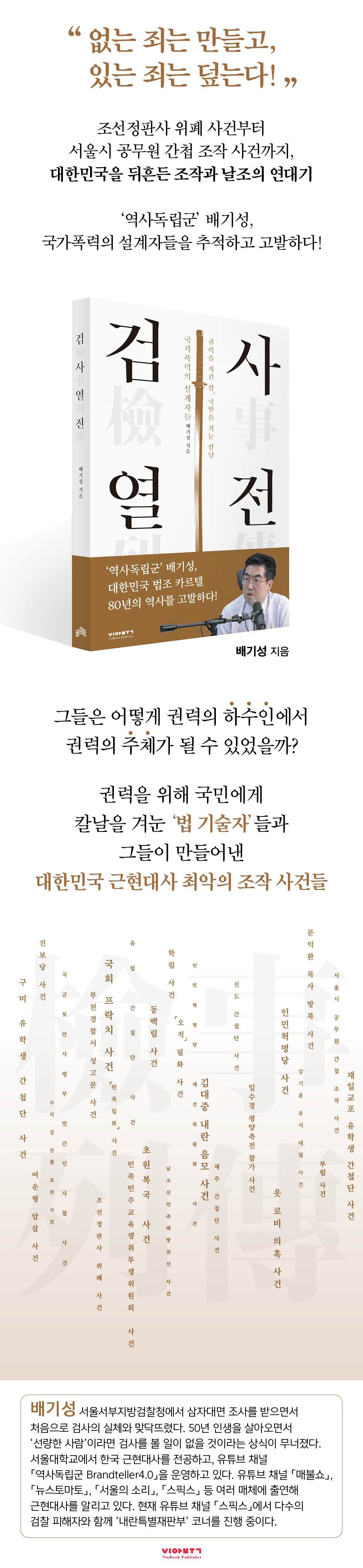 ÀÌ Ã¥ÀÇ 1ºÎ ¡®¾ß¸¸ÀÇ ½Ã´ë¡¯´Â ¸ñÀû ¾ø´Â Á¶ÀÛ°ú ¾ï¾ÐÀ¸·Î Á¡Ã¶µÇ¾ú´ø À̽¸¸°ú ¹ÚÁ¤Èñ Á¤±ÇÀÇ ±¹°¡Æø·Â ½Ã´ë ¶§ ÀÖ¾ú´ø ¿ë°ø Á¶ÀÛ »ç°ÇµéÀ» ´Ù·é´Ù. 2ºÎ ¡®Á¦¹°ÀÇ ½Ã´ë¡¯¿¡¼´Â µ¶Àç üÁ¦¸¦ ±»°ÇÈ÷ ´ÙÁö±â À§ÇØ ¼ö¸¹Àº »ý¸íÀ» Èñ»ýÇÑ ÀüµÎȯ Á¤±Ç°ú °ø¾È°Ë»çµéÀÇ ¸¸ÇàÀ», 3ºÎ ¡®°øÆ÷ÀÇ ½Ã´ë¡¯¿¡¼´Â ³ëÅ¿ì Á¤±Ç¿¡¼ºÎÅÍ ¿À´Ã³¯¿¡ À̸£±â±îÁö °ËÂûÀÌ ³ª¼¼ ÁÖµµÇÑ Á¶ÀÛ »ç°ÇµéÀ» »ìÆìº»´Ù. »ç°ÇÀº ½Ã´ëº°·Î Á¤·ÄÇÏ¿© °ËÂûÀÌ ¾î¶»°Ô ±Ç·ÂÀÇ µµ±¸¿¡¼ ±Ç·ÂÀÇ ÁÖü·Î º¯ÈÇØ¿Ô´ÂÁö¸¦ Ã¥À» Àо¸ç ÀÚ¿¬½º·´°Ô Á¶¸ÁÇÒ ¼ö ÀÖµµ·Ï ±¸¼ºÇß´Ù. °Ë»çÀÇ ¿ªÇÒ°ú ±× º¯Áú °úÁ¤¿¡ ÁýÁßÇϱâ À§ÇØ º»¹®¿¡¼´Â ´Ù·çÁö ¾Ê¾ÒÁö¸¸, ÇØ¹æ ÀÌÈÄ ¹Ì±ºÁ¤ ½Ã±â¿¡ ÀÖ¾ú´ø ´ëÇ¥ÀûÀÎ ¿ë°ø Á¶ÀÛ »ç°Ç µÎ °Çµµ ºÎ·ÏÀ¸·Î ÇÔ²² ¼ö·ÏÇß´Ù.