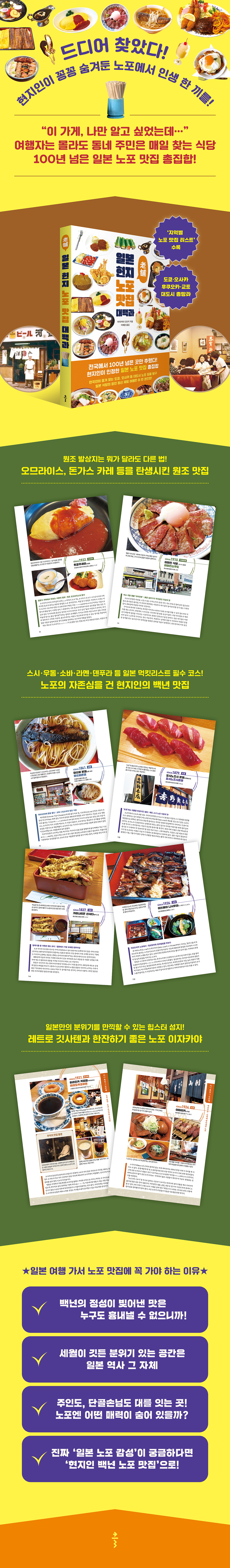 ¡¸ÀϺ» ÇöÁö »§ ´ë¹é°ú¡¹ ¡¸ÀϺ» ÇöÁö ¾ÆÀ̽ºÅ©¸² ´ë¹é°ú¡¹ ¡¸ÀϺ» ÇöÁö °£½Ä ´ë¹é°ú¡¹ ¡¸ÀϺ» ÇöÁö ¸ÀÁý üÀÎ ´ë¹é°ú¡¹ ¡¸ÀϺ» ÇöÁö ¹ÝÂù ´ë¹é°ú¡¹ µîÀ¸·Î ÀϺ» ¿©ÇàÀÚÀÇ ÀÔ¸ÀÀ» Ã¥ÀÓÁ®¿Â ¡®ÀϺ» ÇöÁö ´ë¹é°ú¡¯ ½Ã¸®Áî°¡ À̹ø¿¡´Â ÀϺ»ÀÇ ¿À·¡µÈ ½Ä´ç¸¸À» ¸ðÀº ¡¸ÀϺ» ÇöÁö ³ëÆ÷ ¸ÀÁý ´ë¹é°ú¡¹¸¦ ¼±º¸ÀδÙ. ÀϺ» Àü¿ªÀÇ ¼ö¸¹Àº ½Ä´ç Áß¿¡¼ 100³âÀÌ ³ÑÀº ³ëÆ÷¸¸À» ¾ö¼±ÇÑ ÀÌ Ã¥¿¡´Â ¿©ÇàÀÚ°¡ °¡Àå ±Ã±ÝÇØÇÏ´Â ÇöÁöÀÎ ´Ü°ñ½Ä´ç Á¤º¸°¡ ÃѸÁ¶óµÇ¾î ÀÖ´Ù.