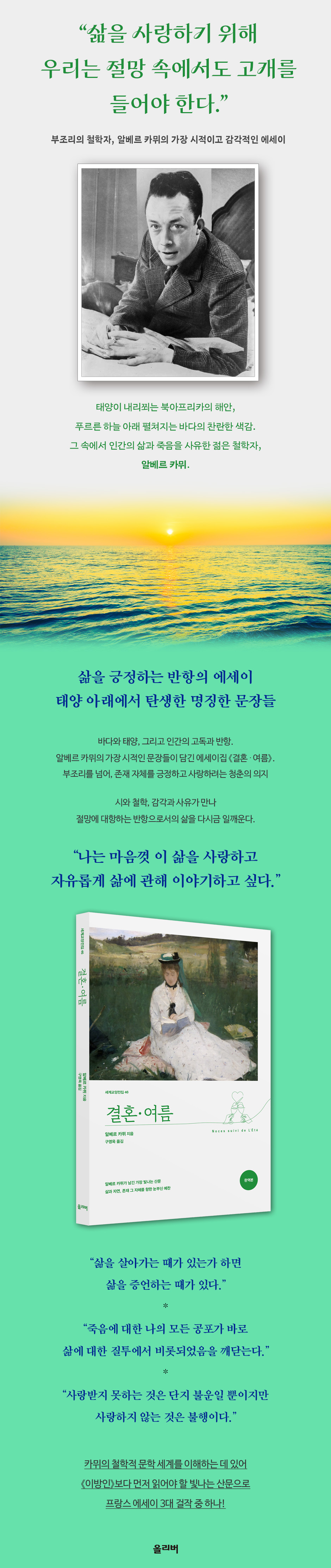 ¾Ëº£¸£ Ä«¹¿ÀÇ ¡¶°áÈ¥¡¤¿©¸§¡·Àº ±×°¡ ÀþÀº ½ÃÀý¿¡ ¾´ ¿¡¼¼À̵éÀ» ¹Àº »ê¹®ÁýÀ¸·Î, ±×ÀÇ Ã¶ÇÐÀû »çÀ¯¿Í °¨°¢Àû ¹®Ã¼°¡ ÀýÁ¤¿¡ ´ÞÇÑ ÀÛǰÀÌ´Ù. ¡´°áÈ¥¡µ°ú ¡´¿©¸§¡µÀ̶ó´Â µÎ ¿¬ÀÛÀ¸·Î ±¸¼ºµÈ ÀÌ Ã¥Àº ¾ËÁ¦¸®ÀÇ °·ÄÇÑ Å¾ç°ú ¹Ù´Ù, ÀÚ¿¬ÀÇ À̹ÌÁö ¼Ó¿¡¼ »îÀÇ ¾Æ¸§´Ù¿ò°ú À¯ÇÑÇÔÀ» ÇÔ²² ¹Ù¶óº»´Ù. À̸¥¹Ù ¡®ºÎÁ¶¸®ÀÇ Ã¶ÇÐÀÚ¡¯·Î ºÒ¸®´Â Ä«¹¿´Â ÀÌ ÀÛǰ¿¡¼ Á×À½°ú ¹«ÀǹÌÀÇ ÀÎ½Ä À§¿¡¼µµ »îÀ» ±àÁ¤ÇÏ·Á´Â ŵµ¸¦ º¸¿©ÁØ´Ù. ½Å ¾ø´Â ¼¼°è¿¡¼ ±¸¿øÀ» ã°íÀÚ Çß´ø ±×´Â, Àΰ£ÀÇ À°Ã¼¼º°ú °¨°¢À» ÅëÇØ Á¸ÀçÀÇ ±â»ÝÀ» ³ë·¡Çϸç, ÀÏ»ó ¼ÓÀÇ Âû³ªµéÀÌ Áö´Ñ ¼ÒÁßÇÔÀ» °Á¶ÇÑ´Ù.