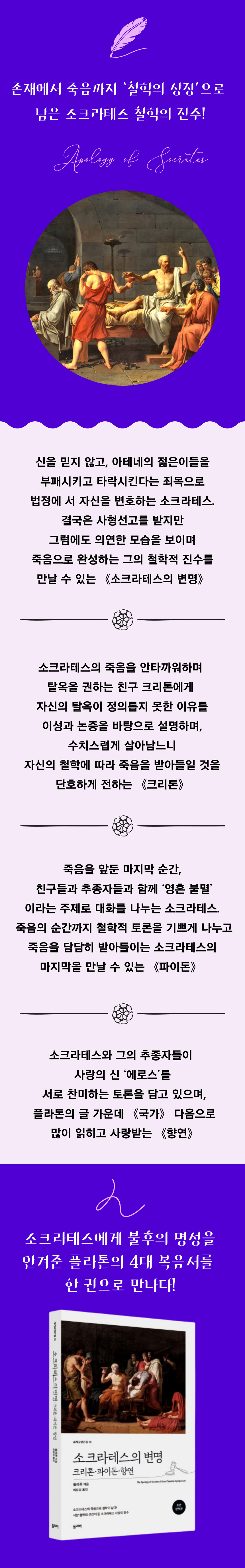 ¼ÒÅ©¶óÅ×½ºÀÇ Á×À½À» ¾ÕµÎ°í ¼ÒÅ©¶óÅ×½º¿Í ±×ÀÇ Ä£±¸, Á¦ÀÚ, ÃßÁ¾ÀÚµéÀÌ ¸ð¿© ¡®¿µÈ¥ ºÒ¸ê¡¯À̶ó´Â ÁÖÁ¦·Î ´ëȸ¦ ³ª´« ³»¿ëÀ» ´ã°í ÀÖ´Ù. ´ëȸ¦ ÅëÇØ ¼ÒÅ©¶óÅ×½º´Â Á×À½ÀÌ ³¡ÀÌ ¾Æ´Ï¸ç, ÀÚ½ÅÀÇ Á×À½ ³Ê¸ÓÀÇ Ãູ¹ÞÀº ¼¼»óÀ¸·Î °¡¼ ±â»ÝÀ» ´©¸®¸ç »ì °ÍÀ̶ó°í ÀüÇϰí ÀÖ´Ù.