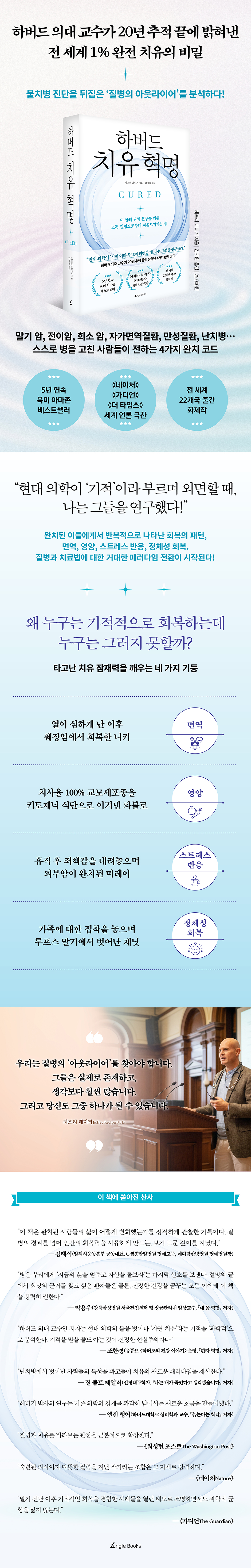 ³»°¡ ÀÚ¿¬ °üÇØ¿¡ ´ëÇØ óÀ½À¸·Î °¿¬ÇÒ ¶§¿´´Ù. ³ª´Â ¿ì¼± ÀÇ»çµé¿¡°Ô ÀÌ·± Áú¹®À» ´øÁ³´Ù. ¡°ÀÇÇÐÀûÀ¸·Î ¼³¸íÇÒ ¼ö ¾ø´Â ȸº¹ »ç·Ê¸¦ Á÷Á¢ ¸ñ°ÝÇÑ ÀûÀÌ ÀÖ´Â ºÐ °è½Å°¡¿ä?¡± °÷°÷¿¡¼ ¼ÕÀ» µé¾ú´Ù. À̹ø¿¡´Â ´Ù¸¥ Áú¹®À» Çß´Ù. ¡°±× »ç·Ê¸¦ ±â·ÏÇϰųª ³í¹®À¸·Î ¹ßÇ¥ÇϽŠºÐÀº¿ä?¡± À̹ø¿¡´Â ¸ðµÎ°¡ ¼ÕÀ» ³»·È´Ù. ÀÚ¿¬ °üÇØ´Â µå¹°Áö ¾Ê´Ù. ±×°ÍÀ» Á÷½ÃÇÏÁö ¸øÇÏ°Ô ¸¸µå´Â µÎ·Á¿ò°ú ºñ³ÀÇ ¹®È°¡ ´«À» °¡¸± »ÓÀÌ´Ù. ÇаèÀÇ Á¶·ÕÀÌ µÎ·Á¿ö ¹®Çå¿¡Á¶Â÷ ½Ç¸®Áö ¸øÇÑ »ç·Ê°¡ ¾ó¸¶³ª ¸¹À»±î? p.31~32 Á¶Á÷°Ë»ç¸¦ ÅëÇØ °ø°ÝÀûÀÎ À¯ÇüÀÇ ³úÁ¾¾çÀ̶ó Áø´Ü¹ÞÀº ¸ÅÆ©´Â ¹Ù·Î ºê¶óÁúÀ» ã¾Ò´Ù. óÀ½¿¡´Â ¸î ÁÖ¸¸ ¸Ó¹«¸£·Á ÇßÀ¸³ª ¸î ´ÞÀÌ Èê·¶°í, »õ·Î¿î »ç¶û¿¡ ºüÁö±â±îÁö Çß´Ù. ÀÌÈÄ ³úÁ¾¾çÀÌ »ç¶óÁ³À¸¸ç ¾ÏÀÌ ÀÖ´ø ºÎºÐ¿¡´Â ÀÛÀº ÈäÅ͸¸ ³²¾Ò´Ù. ÀÇÇÐÀûÀ¸·Î´Â ºÒ°¡´ÉÇÑ ÀÏÀÌ´Ù. ¸»±â ·çǪ½º·Î ´Ù¹ß¼º Àå±âºÎÀü Á÷ÀüÀ̾ú´ø ÀéÀº, ¿©ÇàÀ» ¹öÆ¿ ¼ö ¾øÀ» °Å¶ó°í È®½ÅÇß´ø ÀÇ»ç¿Í ÇÔ²² ºê¶óÁú ¾Æ¹Ùµð¾Æ´Ï¾Æ¿¡ µµÂøÇß´Ù. ±×¸®°í Áö±Ý ³» ¾Õ¿¡ °Ç°ÇÏ°í ºû³ª´Â ¾ó±¼·Î ¾É¾Æ ¸¸¸é¿¡ ¹Ì¼Ò¸¦ ¶ì°í ÀÖ´Ù. ¸°Àº À¯¹æ¾Ï¿¡¼ Ä¡À¯µÇ¾ú´Ù°í ¸»Çß°í, »ùÀº ôÃß¿¡ ÀÖ´ø Á¾¾çÀÌ »ç¶óÁ³´Ù°í Çß´Ù. ÀÌ·± ȸº¹ »ç·ÊµéÀÌ °è¼Ó µîÀåÇß´Ù. ´©°¡ ºÁµµ ºÒ°¡´ÉÇÑ È¸º¹À̾ú´Ù. p.60~61 2011³â, ´º¿åÁÖ ¹öÆÞ·ÎÀÇ ·Î½ºÀ£ ÆÄÅ© ¾Ï ¿¬±¸¼ÒRoswell Park Cancer Institute ¸é¿ªÇÐ ¿¬±¸ÆÀÀº ¿ÀÌ ¾î¶² ¿ªÇÒÀ» ÇÏ´ÂÁö Á¶»çÇϱâ·Î Çß´Ù. ±×µéÀº ¿ÀÌ ³ª´Â µ¿¹°ÀÇ Çൿ¿¡ ÁÖ¸ñÇߴµ¥, ¿ÀÌ ³ª´Â µ¿¹°µéÀº ¿ÀÈ÷·Á µû¶æÇÑ Àå¼Ò·Î À̵¿ÇØ ÇѲ¯ ¿À¸¥ ¿À» À¯ÁöÇÏ·Á ³ë·ÂÇß´Ù. ¿Ö ±×·²±î? ¿¬±¸ÆÀÀº ½ÇÇè¿ë Á㸦 µÎ ±×·ìÀ¸·Î ³ª´©¾î ÇÑÂÊ¿¡´Â ¿À» À¯µµÇÏ°í ´Ù¸¥ ÇÑÂÊÀº ±×´ë·Î µÎ¾ú´Ù. ±× °á°ú, ¿ÀÌ ³ ±×·ì¿¡¼´Â º´¿øÃ¼¸¦ °ø°ÝÇÏ´Â T¼¼Æ÷°¡ ÈξÀ ´õ ¸¹ÀÌ »ý¼ºµÇ¾ú°í, ¸é¿ª¼¼Æ÷ÀÇ ¹ÝÀÀ ¼Óµµ¿Í Á¤È®µµ°¡ ³ô¾ÆÁ³´Ù. ±âº»ÀûÀ¸·Î T¼¼Æ÷´Â ÀÌ¹Ì Àß ÀÛµ¿Çϰí ÀÖ¾úÁö¸¸, °í¿Â¿¡¼ ÀáÀçµÈ ´É·ÂÀÌ È°¼ºÈµÇ¸ç ´õ¿í °·ÂÇÑ ¸ðµå·Î ÀüȯµÇ´Â µíÇß´Ù. ¿ÀÌ À̵éÀÇ ¡®¼û°ÜÁø Ãʴɷ¡¯À» ²ø¾î³»´Â ¿¼è ¿ªÇÒÀ» ÇÑ °ÍÀÌ´Ù. p.76~77 ¡°¹è°íÇà ƴÀÌ ¾ø¾î¿ä. ¿¹Àü ½Ä½À°üÀ¸·Î´Â Àý´ë µ¹¾Æ°¡Áö ¾ÊÀ» °Ì´Ï´Ù.¡± °¡²û ÄÉÀÌÅ© °°Àº °É ¸Ô°í ½ÍÀ» ¶§´Â ¾øÀ»±î? ¡°°ÅÀÇ ¾ø½À´Ï´Ù. ¼ÖÁ÷È÷ ¸Ô°í ½ÍÀº »ý°¢ÀÌ ¾È µé¾î¿ä. ÇÑ ´Þ Á¤µµ Áö³ª´Ï ¿¹Àü À½½Ä¿¡ ´ëÇÑ °¥¸Áµµ »ç¶óÁö´õ±º¿ä.¡± ½ÇÁ¦·Î ¸¹Àº »ç¶÷µéÀÌ ½Ä´ÜÀ» ¹Ù²Û µÚ ¸ÀÀ» ´À³¢´Â °¨°¢ÀÌ µÇ»ì¾Æ³µ´Ù°í ¸»ÇÑ´Ù. °Ç°ÇÑ ½Ä½À°üÀº ´õ ÀÌ»ó ¡®¾ïÁö·Î °ßµð´Â ÀÏ¡¯ÀÌ ¾Æ´Ï¶ó ¡®»îÀ» ¹Ù²Ù´Â ±â»Ý¡¯À¸·Î ¹Ù²ï´Ù. °úÀϰú ä¼Òµµ Á¶¸®¹ý¸¸ ¾Ë¸é ¾ó¸¶µçÁö ¸ÀÀÖ°Ô Áñ±æ ¼ö ÀÖ°í, ½Ã°£À̳ª µ·µµ Å©°Ô µéÁö ¾Ê´Â´Ù. p.133 ´Ï۰¡ Ä¡À¯ ¼¾Å͸¦ ¶°³¯ ¶§, °ü°èÀÚµéÀº ¾ÕÀ¸·Î ¾î¶»°Ô Áö³»¾ß ÇÏ´ÂÁö Á¶¾ðÇØ ÁÖ¾ú´Ù. ¾î¶°ÇÑ °æ¿ì¿¡µµ 6°³¿ù µ¿¾ÈÀº Áø´Ü °Ë»ç¸¦ ¹ÞÁö ¸»¶ó´Â °ÍÀ̾ú´Ù. ´Ï۰¡ ¶°³ Áö ¸çÄ¥ µÚ, Àç´ÖÀº ´ÏŰ¿¡°Ô¼ ÀüÈ ÇÑ ÅëÀ» ¹Þ¾Ò´Ù. ´ÏŰ´Â »ç½Ç º´¿ø¿¡ ´Ù³à¿Ô´Ù°í °í¹éÇß´Ù. °Ë»ç¸¦ ¹ÞÀ¸·¯ °¬Áö¸¸ ±×³à°¡ ´©¿ö ÀÖ´Â µ¿¾È ±â°è°¡ ¸ØÃç¹ö·È´Ù°í Çß´Ù. ¡°ÀÌ°Ô ¹«½¼ ¶æÀÎ °Å °°¾Æ?¡± ´Ï۰¡ ¹°¾ú´Ù. ¡°³» »ý°¢ÀÌ Áß¿äÇÑ °Ô ¾Æ´Ï¾ß. ³×°¡ ¾î¶»°Ô ¹Þ¾ÆµéÀÌ´À³Ä°¡ Áß¿äÇÏÁö.¡± Àç´ÖÀÌ ´ë´äÇÏÀÚ ´Ù½Ã ´Ï۰¡ ¸»À» À̾ú´Ù. ¡°¾Æ¸¶µµ °Ë»ç¸¦ ¹ÞÁö ¸»¶ó´Â ¶æ °°¾Æ. ÇÏÁö¸¸ ³»°¡ °ßµô ¼ö ÀÖÀ»Áö ¸ð¸£°Ú¾î. ³ª´Â ¾Ï º´µ¿ °£È£»çÀݾÆ!¡± ±×·ÎºÎÅÍ ÀÏÁÖÀϵµ ¾È µÇ¾î Àç´ÖÀº ´Ù½Ã ´ÏŰÀÇ ¼Ò½ÄÀ» µé¾ú´Ù. ´ÏŰ´Â °á±¹ °Ë»ç¸¦ ¹ÞÀ¸·¯ °¬°í, °á°ú´Â ÁÁÁö ¾Ê¾Ò´Ù. ±×³àÀÇ ¸ö¿¡´Â ¿©ÀüÈ÷ ¾ÏÀÌ ÀÖ¾ú´Ù. ¼Ò½ÄÀ» µéÀº ´ÏŰ´Â Å« Ãæ°Ý¿¡ ºüÁ³°í °ð¹Ù·Î ´Ù½Ã ¾ÆÇÁ±â ½ÃÀÛÇß´Ù. »óÅ´ ±Þ¼ÓÈ÷ ¾ÇȵǾú°í È¥¶õ°ú ½ÉÇÑ À°Ã¼Àû °íÅë ¼Ó¿¡¼ ´ÏŰ´Â ¸î ÁÖ ¸¸¿¡ ¼¼»óÀ» ¶°³µ´Ù. ¡°±× ÀÏÀ» ¼ö¾øÀÌ ¶°¿Ã·È¾î¿ä.¡± Àç´ÖÀÌ ¸»Çß´Ù. ¡°³» ¸¶À½ ±íÀº °÷¿¡¼´Â ¸¸¾à ´Ï۰¡ ±× ¿©¼¸ ´Þ¸¸ ´õ±â´Ù·È´Ù¸é ¹º°¡ ´Þ¶óÁ³À» °Å¶ó°í ¹Ï¾î¿ä. ¾Æ¸¶ Ä¡À¯µÇ¾úÀ» °Å¶ó°í¿ä.¡± p.317~318 Çö󼼺¸°¡ Á¤¸» ³î¶ó¿î ÁöÁ¡Àº »ç½Ç µû·Î ÀÖ´Ù. ¹Ù·Î È¿°ú°¡ ÀÖÀ» °Å¶ó ¹ÏÁö ¾ÊÀ» ¶§Á¶Â÷ È¿°ú°¡ ÀÖ´Ù´Â °ÍÀÌ´Ù. º¸Åë Çö󼼺¸ ´ëÁ¶ ½ÇÇè¿¡¼´Â Âü°¡Àڵ鿡°Ô