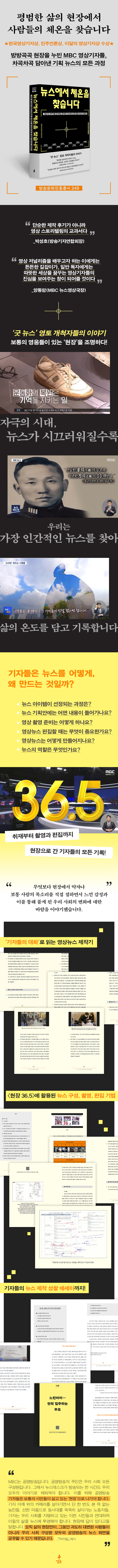 ¡º´º½º¿¡¼ ü¿ÂÀ» ã½À´Ï´Ù¡»´Â Ä«¸Þ¶ó¸¦ ¸Þ°í ±×´ÃÁø ÇöÀåÀ¸·Î ¶Ù¾îµç ±âÀÚµéÀÇ À̾߱⸦ ´ãÀº Ã¥ÀÌ´Ù. ÀÌ Ã¥Àº ¡®º¸Åë »ç¶÷µéÀÇ ´º½º¡¯¸¦ ¸¸µé±â À§ÇØ ÇöÀåÀ» ´©ºó ¡´ÇöÀå 36.5¡µ ¿µ»ó±âÀÚµéÀÇ °í¹Î°ú ½Ãµµ, ½ÃÇàÂø¿À¸¦ °í½º¶õÈ÷ ´ã°í ÀÖ´Ù. ¿Â°® ³ª»Û ´º½º¿Í °¡Â¥ ´º½ºµéÀÌ ÆÇÀ» Ä¡°í SNS°¡ ÀÏ»óÀÇ ÀϺΰ¡ µÈ ½Ã´ë¿¡, È·ÁÇÑ »î¸¸À» Á¶¸íÇÏ´Â ¹Ìµð¾î ȯ°æ ¼Ó¿¡¼ °ø¿µ¹æ¼ÛÀÇ ´º½º´Â ¾î¶² ¸ñ¼Ò¸®¸¦ ´ã¾Æ¾ß Çϴ°¡ ¶ó´Â Áú¹®¿¡¼ Ãâ¹ßÇÑ MBC ´º½ºµ¥½ºÅ© ¡´ÇöÀå 36.5¡µ´Â, ÄÚ³Ê À̸§ ±×´ë·Î ¡®»îÀÇ ¿Âµµ¡¯¸¦ º¸¿©ÁÖ´Â ÇöÀå Áß½ÉÀÇ ÇÇó½ºÅ丮 ´º½º´Ù. Àå¾ÖÀÎ, û³â, ÀÌÁֳ뵿ÀÚ, ´Ù¹®È°¡Á¤ µî »çȸÀû ¾àÀÚµéÀÇ ¸ñ¼Ò¸®¿¡ ÁýÁßÇϸç, °ø¿µ¹æ¼ÛÀÇ ¿ªÇÒ°ú °¡Ä¡¿¡ ´ëÇØ ´Ù½Ã »ý°¢ÇÏ°Ô ÇÑ´Ù.