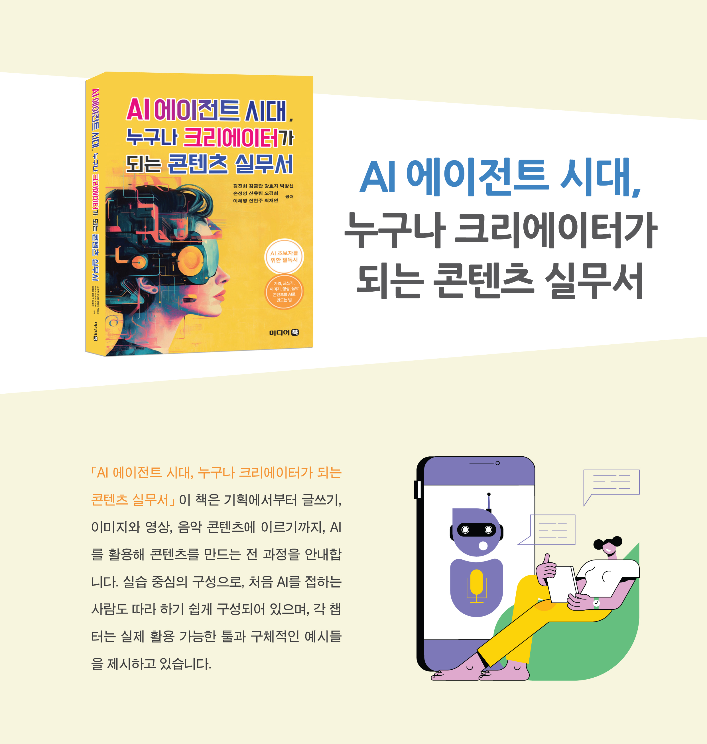 Ã¥¼Ò°³¡¸AI ¿¡ÀÌÀüÆ® ½Ã´ë, ´©±¸³ª Å©¸®¿¡ÀÌÅͰ¡ µÇ´Â ÄÜÅÙÃ÷ ½Ç¹«¼¡¹ ÀÌ Ã¥Àº ±âȹ¿¡¼ºÎÅÍ ±Û¾²±â, À̹ÌÁö¿Í ¿µ»ó, À½¾Ç ÄÜÅÙÃ÷¿¡ À̸£±â±îÁö, AI¸¦ Ȱ¿ëÇØ ÄÜÅÙÃ÷¸¦ ¸¸µå´Â Àü °úÁ¤À» ¾È³»ÇÕ´Ï´Ù. ½Ç½À Áß½ÉÀÇ ±¸¼ºÀ¸·Î, óÀ½ AI¸¦ Á¢ÇÏ´Â »ç¶÷µµ µû¶ó Çϱ⠽±°Ô ±¸¼ºµÇ¾î ÀÖÀ¸¸ç, °¢ éÅÍ´Â ½ÇÁ¦ Ȱ¿ë °¡´ÉÇÑ Åø°ú ±¸Ã¼ÀûÀÎ ¿¹½ÃµéÀ» Á¦½ÃÇϰí ÀÖ½À´Ï´Ù.