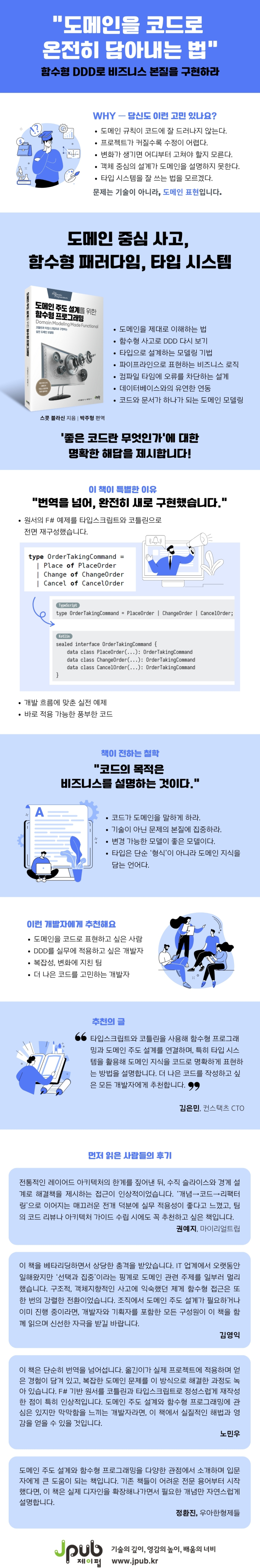 ½ºÄà ºí¶ó½ÅÀÇ ¸íÀú ¡¶Domain Modeling Made Functional¡·Àº F# ±â¹ÝÀÇ ¿¹Á¦¸¦ »ç¿ëÇØ ÀÌ Ã¶ÇÐÀ» Ç®¾î³ÂÁö¸¸, ±¹³» ½Ç¹« ȯ°æ¿¡¼ Ȱ¿ëÇϱ⿡´Â ¾ð¾î À庮ÀÌ Á¸ÀçÇß´Ù. À̹ø¿¡ ¹ø¿ª Ãâ°£µÈ ÀÌ Çѱ¹¾îÆÇ¿¡¼´Â ÀÌ À庮À» ³Ñ¾î ¸ðµç ¿¹Á¦¸¦ ŸÀÔ½ºÅ©¸³Æ®¿Í ÄÚÆ²¸°À¸·Î »õ·Ó°Ô ÀçÀÛ¼ºÇß´Ù. ´Ü¼øÇÑ ¹®¹ý ġȯÀÌ ¾Æ´Ñ, °¢ ¾ð¾îÀÇ Å¸ÀÔ ½Ã½ºÅÛ°ú À̵ð¾ö(idiom)À» Ȱ¿ëÇØ ´Ù½Ã ¼³°èÇÏ°í ±¸ÇöÇÑ °á°ú¹°·Î, ½Ç¹«¿¡¼ ¹Ù·Î Àû¿ëÇÒ ¼ö ÀÖ´Â ÇüÅ·ΠÀçź»ýÇß´Ù´Â Á¡ÀÌ °¡Àå Å« Â÷º°Á¡ÀÌ´Ù.