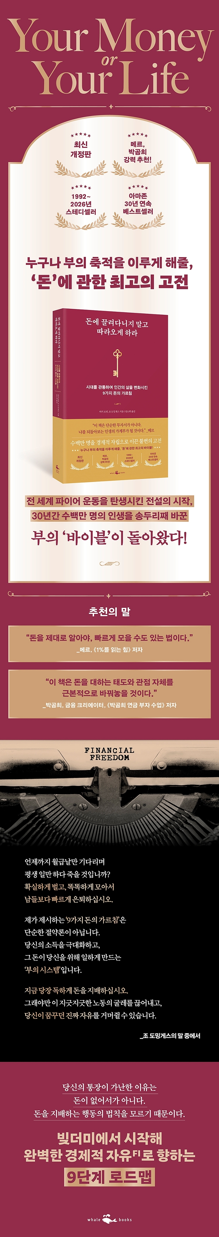 Ã¥¼ÓÀ¸·Î´ç½ÅÀº ÀÌ Ã¥¿¡¼ ¾ÆÈ© ´Ü°èÀÇ ÇÁ·Î±×·¥À» ¸¸³ª°Ô µÉ °ÍÀÌ´Ù. °¢ °úÁ¤¸¶´Ù ¿ì¸®´Â µ·°ú ¸ÎÀº °ü°è¸¦ ¹Ù²Ù°í °æÁ¦Àû µ¶¸³À» ´Þ¼ºÇÏ´Â µ¥ °¡±î¿öÁú °ÍÀÌ´Ù. ¿ì¸®¿¡°Ô ÁÖ¾îÁø °¡Àå ¼ÒÁßÇÑ ÀÚ¿øÀÎ ½Ã°£À» ÀÚÀ¯·Ó°Ô Ȱ¿ëÇØ¼ ´õ Ä¿´Ù¶õ Çູ, ´õ ¸¹Àº ÀÚÀ¯, ´õ ±íÀº Àǹ̸¦ À§ÇÑ °ø°£À» ¸¶·ÃÇÒ ¼ö ÀÖ´Ù. ¿©±â¿¡¼ µ·°ú ¸ÎÀº °ü°è¸¦ ¡®º¯È¡¯½ÃŲ´Ù´Â ¸»Àº ¹«½¼ ÀǹÌÀϱî? µ·À» ´õ ¸¹ÀÌ ¹ú°Å³ª ´õ Àû°Ô ¹ø´Ù´Â ¶æÀÌ ¾Æ´Ï¶ó, ÇöÀç¿Í ¹Ì·¡¿¡ ¿øÇÏ´Â ´ë·Î »ì·Á¸é µ·ÀÌ ¾ó¸¶³ª ÀÖ¾î¾ß ÃæºÐÇÑÁö ¾È´Ù´Â ¶æÀÌ´Ù. ´Ù½Ã ¸»ÇØ, µ·°ú °æÁ¦¿¡ Èñ»ý´çÇÏÁö ¾Ê°í ³» ÀÇÁö´ë·Î ¼±ÅÃÇÑ´Ù´Â Àǹ̴Ù. °ÆÁ¤ÇÏÁö ¸¶¶ó. ´©±¸³ª ÇÒ ¼ö ÀÖ´Ù. _pp.16~17, °æÁ¦Àû µ¶¸³À̶õ ¹«¾ùÀϱî? ¿ì¸®´Â ´ë°³ ´õ ¸¹ÀÌ °¡Áú¼ö·Ï ´õ ÁÁ´Ù´Â ¸¸¿¬ÇÑ ¼Òºñ ½ÅÈ¿¡ »ç·ÎÀâÇô ÀÖ´Ù. ´õ ¸¹ÀÌ °¡Á®¾ß ÇÑ´Ù´Â ½ÅÈ À§¿¡ Á÷¾÷ »ýȰÀ» Áö¾î ¿Ã¸°´Ù. ½Ã°£ÀÌ È带¼ö·Ï µ·À» ´õ ¸¹ÀÌ ¹ú °ÍÀ̶ó°í ±â´ëÇÑ´Ù. ½ÂÁøÇÒ¼ö·Ï ´õ Å« Ã¥ÀÓ°ú ƯÇý¸¦ ¾òÀ» °ÍÀ̶ó°í ¹Ï´Â´Ù. ´õ ¸¹ÀÌ ¼ÒÀ¯Çϰí, À§½ÅÀÌ ´õ ³ô¾ÆÁö°í, Áö¿ª »çȸ¿¡¼ ´õ Å©°Ô Á¸°æ¹Þ±â¸¦ Èñ¸ÁÇÑ´Ù. ¿ì¸® Àڽſ¡°Ô ´õ ¸¹ÀÌ ±â´ëÇÏ°í ¼¼»ó¿¡ ´õ ¸¹ÀÌ ±â´ëÇÏ´Â µ¥ Àͼ÷ÇØÁø´Ù. ÇÏÁö¸¸ ¸¸Á·Àº ½±»ç¸® ã¾Æ¿ÀÁö ¾Ê°í, ´õ ¸¹ÀÌ °¡Áú¼ö·Ï ÇöÀç »óÅ¿¡ Á¡Á¡ ºÒ¸¸½º·¯¿öÁø´Ù. _p57, ´õ ¸¹À»¼ö·Ï ´õ ÁÁÀ»±î? ´©±¸³ª µ·ÀÌ ÇÊ¿äÇÏ´Ù. ´©±¸³ª µ·À» ¾òÀ¸·Á°í ÀÖ´Â ÈûÀ» ´ÙÇÑ´Ù. µ·¿¡ ¼Õ´ëÁö ¾Ê°í ´Ü ÇÏ·ç¶óµµ »ì ¼ö ÀÖ´Â »ç¶÷Àº °ÅÀÇ ¾ø´Ù. ±×·¡¼ ¿ì¸® ¸¶À½Àº ¿ì¸®°¡ °ÔÀÓÆÇ¿¡ ±í¼÷ÀÌ ÆÄ¹¯Èù ä ¾ó¸¶³ª ÀÇÁ¸ÀûÀ¸·Î »ì¾Æ°¡´ÂÁö Á÷½ÃÇϱ⸦ ²¨¸°´Ù. µ·ÀÌ »îÀÇ ¿¡³ÊÁöÀÏÁö¶óµµ, µ·ÀÌ ¾øÀ¸¸é ÀÏ»óÀÌ ¼¼È÷ ¸ØÃá´Ù. µ·ÀÌ ¸ðµÎ°¡ ¾ôÈù °ÔÀÓÀ̶ó´Â »ç½ÇÀ» ÀÌÇØÇϸé, °ÔÀÓÆÇ¿¡¼ ¾ðÁ¦ µ·À» »ç¿ëÇÒÁö, ¶Ç ¾ðÁ¦ ´Ù¸¥ ÈÆó¸¦ »ç¿ëÇÒÁö ÀǽÄÀûÀ¸·Î ¼±ÅÃÇÒ ¼ö ÀÖ´Ù. µ·À̶ó´Â °ÔÀÓÀÌ ¿ì¸®¸¦ °¡Áö°í ³î±âµµ ÇÑ´Ù´Â »ç½Ç, ¼îÇθô°ú ¹éÈÁ¡°ú À¥»çÀÌÆ®°¡ Àΰ£ÀÇ ºÒ¾È°ú °¥¸ÁÀ» ÀÌ¿ëÇØ¼ µ·À» ÈÉÄ¡µµ·Ï ¼³°èµÇ¾ú´Ù´Â »ç½ÇÀ» ¾Ë¾ÆÃ§ ¼ö ÀÖ´Ù. ÀÌ·¸°Ô µÇ¸é ¼Òºñ Áö»óÁÖÀÇ¿¡ ÀúÇ×Çϱ⵵ ½¬¿öÁø´Ù. _p.107, µ·Àº ¹«¾ùÀ̰í, ¹«¾ùÀÌ ¾Æ´Ñ°¡ µ·À» ¹ú±â À§ÇØ ÀÏÀ» ÇÒ Çʿ䰡 ¾ø´Ù¸é, ¹«¾ùÀ» ÇÒÁö Á¤È®È÷ ¸ô¶óµµ ±¦Âú´Ù. Áö±Ý ÇÏ´Â ÀÏ ¸»°í ´Ù¸¥ ÀÏÀ» ¹Ù¶óÁö ¾Ê¾Æµµ ±¦Âú´Ù. ±×Àú °¢ ÁöÃâ Ç׸ñÀ» º¸¸ç ÀÌ·¸°Ô Áú¹®ÇØ º¸ÀÚ. »ý°è ¶§¹®¿¡ ÀÏÇÏÁö ¾Ê¾Æµµ µÈ´Ù¸é, ÀÌ ÁöÃâÀº ¾î¶»°Ô ´Þ¶óÁú±î? ±×¸®°í ±â¾ïÇ϶ó. ºÎ²ô·¯¿öÇÏÁöµµ ¸»°í, ºñ³ÇÏÁöµµ ¸»ÀÚ. ÀÌ·¸°Ô Áú¹®ÇÑ´Ù°í ÇØ¼ Á÷¾÷¿¡ Çå½ÅÇÏ´Â ¸¶À½À» Àú¹ö¸®´Â °ÍÀÌ ¾Æ´Ï´Ù. ´Ù¸¥ ÀÏÀ» ÇÑ´Ù¸é µ·À» ¾î¶»°Ô ¾µÁö °í¹ÎÇÑ´Ù°í ÇØ¼ »ó»ç¸¦ ¹è½ÅÇϰí Á÷Àå¿¡ ºÒ¸¸À» µå·¯³»´Â °ÍÀÌ ¾Æ´Ï´Ù. Áö±Ý ÇÏ´Â ÀÏÀ» »ç¶ûÇÑ´Ù¸é, ¸Å´Þ ÀÌ·¸°Ô ¹¯´Â °£´ÜÇÑ ¿¬½À¸¸À¸·Îµµ Á÷¾÷ ¸¸Á·µµ¸¦ ³ôÀÏ ¼ö ÀÖ´Ù. Á¤¸»·Î ¿øÇؼ ¼±ÅÃÇÑ Á÷¾÷À̶ó´Â È®½ÅÀÌ Ä¿Áö±â ¶§¹®ÀÌ´Ù. _p.204, µ·À» ¹ú±â À§ÇØ ÀÏÇÒ Çʿ䰡 ¾ø´Ù¸é, ÀÌ ¼Òºñ´Â ¾î¶»°Ô ´Þ¶óÁú±î? Àΰ£ÀÌ ´À³¢´Â ÃæÁ·°¨Àº Á÷¾÷ÀÌ ¾Æ´Ï¶ó »îÀÇ ÀüüÀûÀÎ ¸ð½À, Áï »îÀÇ º»Áú¿¡ °üÇÑ ³»¸éÀÇ °¨°¢, ŸÀΰú ¸ÎÀº °ü°è, ÀÇ¹Ì¿Í ¸ñÀûÀ» ÇâÇÑ °¥¸Á¿¡¼ »ý°Ü³´Ù. Àϰú ÀÓ±ÝÀ» ºÐ¸®Çϸé, µ·À» ¹ö´Â °ÍºÎÅÍ °¡Á·À» »ç¶ûÇÏ´Â °Í±îÁö »îÀÇ ¸ðµç ºÎºÐÀ» ¡®ÁøÁ¤ÇÑ ³ª Àڽš¯À̶ó´Â Àüü·Î ÅëÇÕÇÏ´Â ¹®À» ¿ ¼ö ÀÖ´Ù. ¿ì¸®°¡ ¿ÂÀüÇÏ´Ù¸é Çàº¹ÇØÁö·Á°í ¾Ö½á ¼ÒºñÇÒ Çʿ䰡 ¾ø´Ù. ÇູÀº ¿ì¸®°¡ Ÿ°í³ ±Ç¸®´Ù. ´ç½ÅÀÌ ±Þ¿©¸¦ ¹Þ°í ´Ù´Ï´Â Á÷ÀåÀ» ÁÁ¾ÆÇÏµç ½È¾îÇϵç, Àϰú ÀÓ±ÝÀ» ºÐ¸®ÇÏ¸é »îÀÇ ¿¡³ÊÁö¶ó´Â ±ÍÁßÇÑ ÀÚ»êÀ» ¼ÒÁßÇÏ°Ô ¿©±â´ÂÁö ´õ¿í ºÐ¸íÇÏ°Ô È®ÀÎÇÒ ¼ö ÀÖ´Ù. _p.321, Àϰú ÀÓ±ÝÀÇ ¿¬°á °í¸® ²÷±â ¹Ì·¡ÀÇ ¿ù ÅõÀÚ ¼öÀÔÀ» ¿¹ÃøÇÒ ¼ö ÀÖ´Ù´Â ±ú´ÞÀ½Àº °·ÂÇÑ ¿µÇâÀ» ¹ÌÄ£´Ù. Çѹø »ý°¢ÇØ º¸¶ó. Á÷¾÷º¸´Ù »îÀ» ´õ Áß¿äÇÏ°Ô ¿©±ä´Ù¸é ÈξÀ ´õ ÀÇ¿åÀûÀÌ°í ¼º½ÇÇÏ°Ô ÀÏÇÒ °¡´É¼ºÀÌ Å©´Ù. Á¤ÇØÁø ±â°£¸¸ µ·À» ¹ú±â À§ÇØ ÀÏÇÏ¸é µÈ´Ù´Â °ÍÀ» ¾Ë¾ÆÂ÷¸®¸é, »îÀÇ ¿¡³ÊÁö¸¦ ¼ÒÁßÇÏ°Ô ¿©±â´Â ¹ýÀ» ¹è¿ì¸é¼ ¾òÀº Àڽۨ, ÀÇ¿å, Çå½Å, ¼º½Ç, ¾÷¹«¿¡ ´ëÇÑ Áñ°Å¿î ÀںνÉ, Ã¥ÀÓ°¨ÀÌ ¹è·Î ´Ã¾î³´Ù. _p.368, °¡½ÃÀû Àü¸ÁÀÇ Èû |