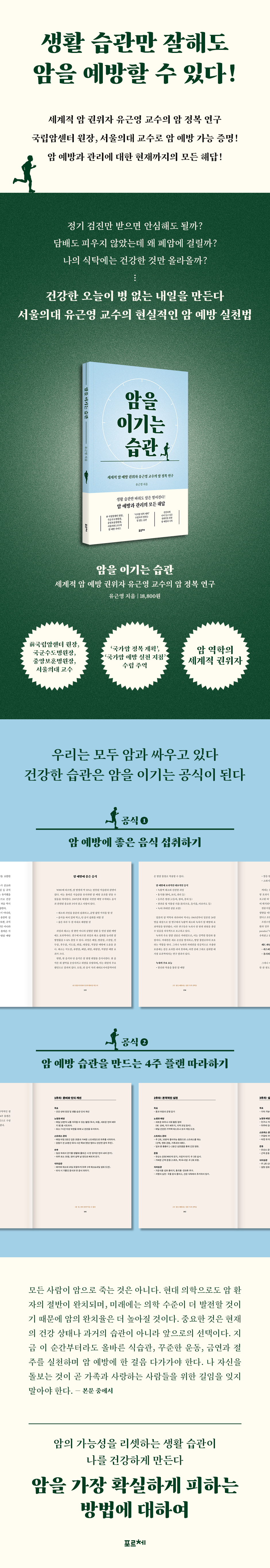 ÀÌ Ã¥Àº Çѱ¹ ¾Ï ¿ªÇÐ ¿¬±¸ÀÇ »êÁõÀÎÀÌÀÚ ¾Ï ¿¹¹æÀÇ ±æÀ» ´Û¾Æ ¿Â ¼¼°èÀû ¾Ï ¿¹¹æ ±ÇÀ§ÀÚ ¼¿ïÀÇ´ë À¯±Ù¿µ ±³¼öÀÇ »ýȰ ¼Ó ¾Ï ¿¹¹æ ¹é¼ÀÌ´Ù. ÀúÀÚ´Â ¡®¾ÏÀÇ °¡Àå °·ÂÇÑ Ä¡·á¹ýÀº ¿¹¹æ¡¯À̶ó°í °Á¶ÇÑ´Ù. ±¹¸³¾Ï¼¾ÅÍ ¿øÀå, Áß¾Óº¸Èƺ´¿øÀå, ±¹±º¼öµµº´¿øÀåÀ» ºñ·Ô, ¾Æ½Ã¾ÆÅÂÆò¾ç¾Ï¿¹¹æ±â±¸ µî ÁÖ¿ä ÇÐȸÀåÀ» Áö³»¸ç ÃàÀûÇÑ ¿ªÇÐ ¿¬±¸¿Í Á¤Ã¥ °æÇèÀ» ¹ÙÅÁÀ¸·Î, ¾Ï ¹ß»ýÀÇ À§Çè ¿äÀÎÀ» °úÇÐÀû ±Ù°Å·Î ¸íÈ®È÷ ¼³¸íÇÏ°í µ¶ÀÚµéÀÌ Àϻ󿡼 ½ÇõÇÒ ¼ö ÀÖ´Â ±¸Ã¼Àû °Ç° ÁöħÀ» Á¦½ÃÇÑ´Ù. ƯÈ÷ Çѱ¹ÀÎ ÄÚȣƮ ¿¬±¸¿Í ¾Æ½Ã¾Æ °øµ¿ ¿¬±¸ µî ´ë±Ô¸ð ¿ªÇÐ ÀڷḦ ±Ù°Å·Î ÇÑ ±ÇÀ§ ÀÖ´Â ÅëÂûÀº µ¶ÀÚµéÀÌ °úÇÐÀû ±Ù°Å¸¦ °®°í ¾ÏÀ» ¿¹¹æÇÏ´Â »ýȰ ½À°üÀ» Á¦½ÃÇÑ´Ù. ´©±¸³ª ½±°Ô Àϻ󿡼 ½ÇõÇÒ ¼ö ÀÖ´Â ¾Ï ¿¹¹æ°ú °ü¸®ÀÇ ¸ðµç ÇØ´äÀ» ´ãÀº ÀÌ Ã¥Àº µ¶ÀÚ¿¡°Ô ¾Ï ¿¹¹æ ù°ÉÀ½À» ¾È³»ÇÑ´Ù. ¡´¾ÏÀ» À̱â´Â ½À°ü¡µÀº ±¹³» ÃÖ°í ±ÇÀ§ÀÚÀÌÀÚ ¼¼°èÀûÀÎ À¯±Ù¿µ ±³¼öÀÇ Æò»ýÀ» ¹ÞÄ£ ¾Ï ¿¹¹æ°ú Á¤º¹¿¡ °üÇÑ ¿¬±¸ °á°ú¹°ÀÌ´Ù. °Ç°ÇÏ°Ô ³ªÀÌ µé°í ½ÍÀº Çö´ëÀÎÀ» À§ÇÑ ¾Ï ¿¹¹æ°ú ±Øº¹¿¡ °üÇÑ ÀÇÇÐÀû Àü¹®¼º°ú ½Ç¿ë¼ºÀ» °¡Áø ÃÖ°íÀÇ °Ç° Áöħ¼°¡ µÉ °ÍÀÌ´Ù.