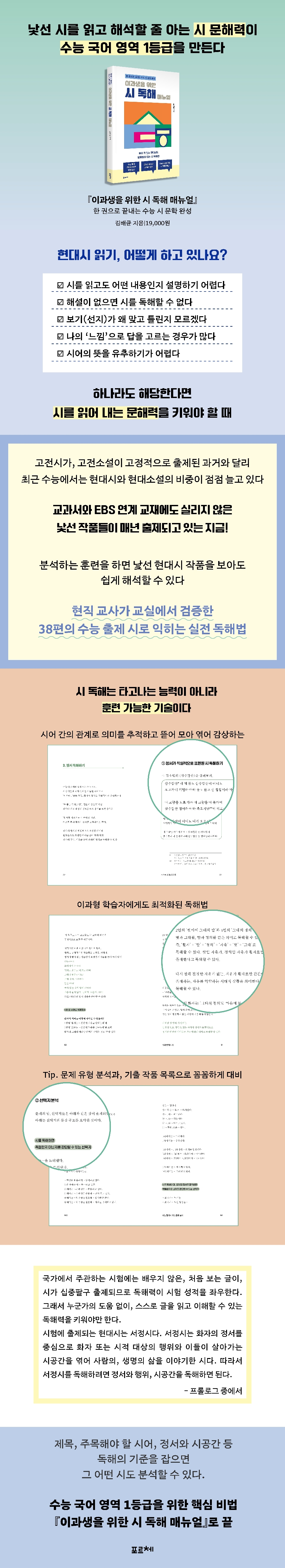 ¼ö´É ±¹¾î ¿µ¿ª¿¡¼ Çö´ë½Ã´Â ¸Å³â ÃâÁ¦µÇÁö¸¸, Çлý ´ëºÎºÐÀº ÀÛǰº° ÇØ¼³À» ¾Ï±âÇÏ´Â ¹æ½ÄÀ¸·Î °øºÎÇØ ¿Ô´Ù. ±×·¯³ª ½ÇÁ¦ ½ÃÇè¿¡¼´Â ±³°ú¼³ª ¹®Á¦Áý¿¡¼ ´Ù·çÁö ¾ÊÀº ³¸¼± ÀÛǰÀÌ ÃâÁ¦µÇ¸ç, À̶§ ¼ºÀûÀ» Á¿ìÇÏ´Â °ÍÀº ¾Ï±â°¡ ¾Æ´Ï¶ó µ¶ÇØ·ÂÀÌ´Ù. ÀÌ Ã¥Àº ÀÌ·¯ÇÑ ¹®Á¦ÀǽĿ¡¼ Ãâ¹ßÇÑ´Ù. ÀúÀÚ´Â ½Ã¸¦ ÇÑ Æí¾¿ ¼³¸íÇÏ´Â ÇØ¼³¼°¡ ¾Æ´Ï¶ó, ¾î¶² ½Ã°¡ ÃâÁ¦µÇ´õ¶óµµ ½º½º·Î Àо ¼ö ÀÖ´Â µ¶ÇØ ¹æ¹ýÀ» Á¦½ÃÇÑ´Ù. ¼ö´É¿¡¼ óÀ½ º¸´Â ½Ã¸¦ ¸¶ÁÖÇÏ´Â ¼ø°£ ÇÊ¿äÇÑ °ÍÀº Á¦´ë·Î ÀÐ¾î ³»´Â ¹æ¹ýÀÌ´Ù. °¨°¢À̳ª ¿ä·ÉÀÌ ¾Æ´Ï¶ó ÀçÇö °¡´ÉÇÑ µ¶ÇØ °úÁ¤À» ÅëÇØ ´©±¸³ª ½º½º·Î ÇØ¼®¿¡ µµ´ÞÇÏ°Ô ¸¸µå´Â °ÍÀÌ ÇÙ½ÉÀÌ´Ù. À̸¦ ÅëÇØ ¼ö´É°ú ³»½Å¿¡ ÃâÁ¦µÇ´Â Çö´ë½Ã¸¦ ŸÀÎÀÇ ÇØ¼³ ¾øÀ̵µ ½º½º·Î µ¶ÇØÇÒ ¼ö ÀÖµµ·Ï µ½´Â´Ù.