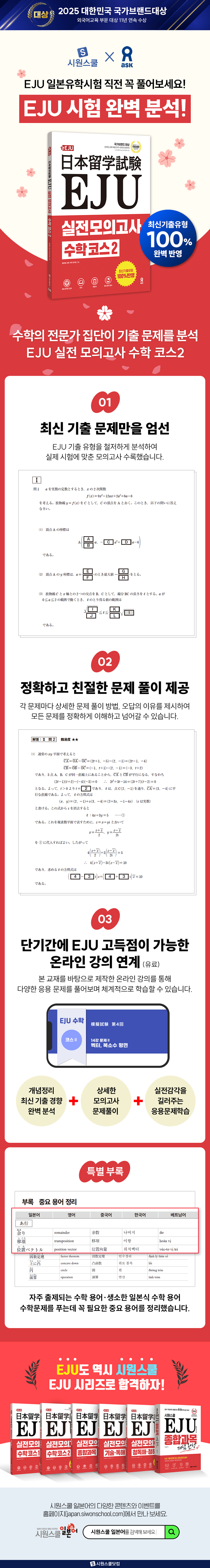 ¡ºEJU ½ÇÀü ¸ðÀǰí»ç ¼öÇÐ ÄÚ½º2¡»´Â 2002³âºÎÅÍ ½Ç½ÃµÈ EJU ÀϺ»À¯ÇнÃÇèÀÇ ±âÃâ À¯ÇüÀ» öÀúÇÏ°Ô ºÐ¼®ÇÏ¿©, ÃâÁ¦ °æÇâ°ú ³À̵µ¸¦ ½ÇÁ¦ ½ÃÇè¿¡ ¸ÂÃá ¸ðÀǰí»ç¸¦ ¼ö·ÏÇÑ µµ¼ÀÔ´Ï´Ù. ¸ðµç ¹®Á¦¿¡ »ó¼¼ÇÑ ÇØ¼³À» Á¦°øÇÏ¿© ÇнÀÀÇ ÀÌÇØµµ¸¦ ³ô¿´À¸¸ç, ´Ü±â°£¿¡ ½ÇÀü °¨°¢À» ÀÍÈ÷°í °íµæÁ¡¿¡ µµÀüÇÒ ¼ö ÀÖµµ·Ï EJU ½ÃÇè ¹üÀ§ °³Á¤°ú ÃֽбâÃâ ¹®Á¦ À¯ÇüÀ» ¾ö¼±ÇÏ¿© ¹Ý¿µÇÏ¿´½À´Ï´Ù. ¶ÇÇÑ, ¹®Á¦¸¦ Ǫ´Âµ¥ ²À ÇÊ¿äÇÑ Áß¿ä ¿ë¾î Á¤¸® Ç¥ Á¦°øÀ¸·Î ½ÃÇè Á÷Àü ÆÄÀ̳Πüũ°¡ °¡´ÉÇÕ´Ï´Ù.
