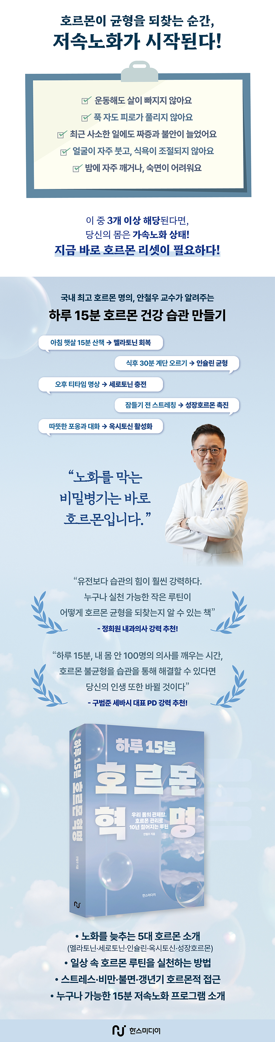 ±¹³» ÃÖ°í È£¸£¸ó ±ÇÀ§ÀÚ ¾Èö¿ì ±³¼öÀÇ ½ÅÀÛ ¡¶ÇÏ·ç 15ºÐ È£¸£¸ó Çõ¸í¡·Àº ¡®³ëÈ´Â ÇÇÇÒ ¼ö ¾ø´Ù¡¯´Â °íÁ¤°ü³äÀ» µÚÁý´Â´Ù. ¿ÀÈ÷·Á ³ªÀ̰¡ µé¼ö·Ï ´õ °Ç°ÇØÁú ¼ö ÀÖ´Ù´Â °úÇÐÀû ±Ù°Å¸¦ ¹ÙÅÁÀ¸·Î, ÇÏ·ç 15ºÐ ·çƾÀ¸·Î »îÀÇ È°·ÂÀ» µÇãÀ» ¼ö ÀÖ´Â ±¸Ã¼Àû ½Çõ¹ýÀ» Á¦½ÃÇÑ´Ù. ³»ºÐºñ³»°ú Àü¹®ÀÇÀÎ ÀúÀÚ´Â ¡®°¡¼Ó³ëÈ¡¯ÀÇ ¿øÀÎÀ» È£¸£¸ó ºÒ±ÕÇü¿¡¼ ã´Â´Ù. È£¸£¸ó º¯ÈÀÇ °üÁ¡¿¡¼ ³ëÈ¿Í ¼ºÀκ´ÀÇ ¿øÀÎÀ» ºÐ¼®ÇÏ¸ç ¸á¶óÅä´Ñ, ¼ºÀåÈ£¸£¸ó, ¼¼·ÎÅä´Ñ, ¿Á½ÃÅä½Å, Àν¶¸° µî ´Ù¼¸ °¡Áö ÇÙ½É È£¸£¸óÀÇ ±ÕÇüÀÌ °Ç°ÀÇ ¿î¸íÀ» °áÁ¤Áþ´Â ÁÖü¶ó°í ¼³¸íÇÑ´Ù.