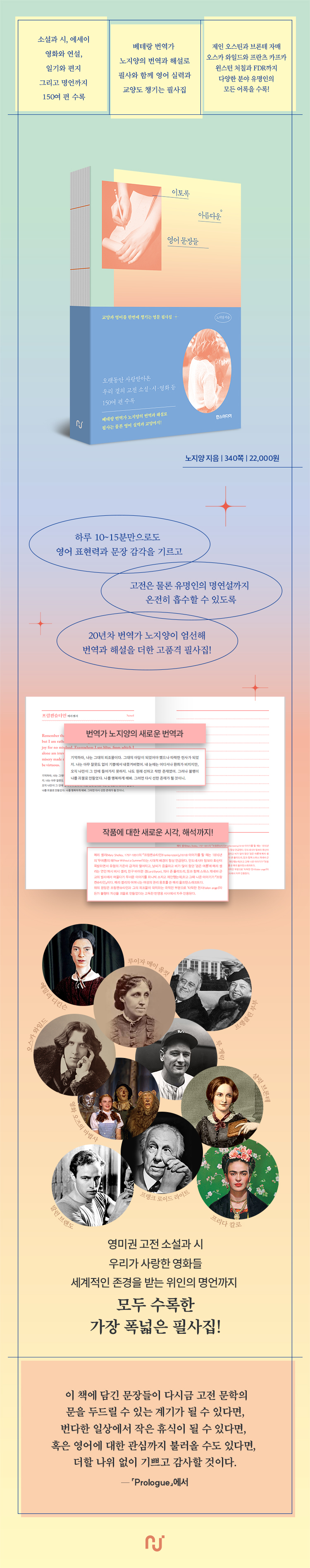 ¿µ¾î ÇÊ»çÁýÀÌ Àα⸦ ²ô´Â ÀÌÀ¯´Â ±âÁ¸ÀÇ ¿µ¾î ÇнÀ¼¿¡ ºñÇØ¼ ¿ì¸®¿¡°Ô Àͼ÷Çϸ鼵µ Àç¹ÌÀÖ´Â ÅØ½ºÆ®°¡ ½Ç·ÁÀֱ⠶§¹®ÀÏ °ÍÀÌ´Ù. ÀÌ Ã¥ ¡ºÀÌÅä·Ï ¾Æ¸§´Ù¿î ¿µ¾î ¹®Àåµé¡»Àº ±×·¯ÇÑ ¿µ¾î ÇÊ»çÁýÀÇ ÀåÁ¡À» °¡Àå Àß »ì¸° ŸÀÌÆ²ÀÌ´Ù. ÁöÀºÀÌÀÎ ³ëÁö¾ç ¹ø¿ª°¡´Â 20³âÂ÷ ¿ªÀÚÀÌÀÚ º»ÀÎ ½º½º·Îµµ ¼¼ ±ÇÀÇ Ã¥À» ÁýÇÊÇÑ ÀúÀÚÀ̱⵵ ÇÏ´Ù. ¿µ¾î¿µ¹®ÇÐÀ» Àü°øÇÑ ´ëÇÐ ½ÃÀýºÎÅÍ Áö±Ý±îÁö ²ÙÁØÈ÷ ¿µ¹Ì±Ç ¿µÈ¿Í µå¶ó¸¶, ´ÙÅ¥¸àÅ͸®¿Í ½ºÆ÷Ã÷ °æ±â±îÁö ºü¶ß¸®Áö ¾Ê°í ¼··ÆÇÏ´Â ¡®´öÈÄ¡¯·Î¼ ±×µ¿¾È º¸°í µè°í Áñ°Ü¿Â ¿µ¹Ì±Ç ÄÜÅÙÃ÷¿¡ ´ëÇÑ ¼Ò¾çÀ» ¾Æ³¦¾øÀÌ Ç®¾î³õ¾Ò´Ù. ±× ´öºÐ¿¡ 150¿© Æí¿¡ ´ÞÇÏ´Â ÇÊ»çÁý ÅØ½ºÆ®°¡ ¼Ò¼³À̳ª ½Ã´Â ¹°·ÐÀÌ°í ¿¡¼¼ÀÌ, ÀÚ±â°è¹ß¼, ¸í¾ð, Àϱâ, ÆíÁö, ¿µÈ µî ´Ù¾çÇÑ ºÐ¾ß¿¡ °ÉÃļ ±¸¼ºµÉ ¼ö ÀÖ¾ú´Ù. Á¦ÀÎ ¿À½ºÆ¾À̳ª ¿À½ºÄ« ¿ÍÀϵå, ºê·ÐÅ× Àڸб׏®°í Âû½º µðŲ½º¿Í °°ÀÌ ¿µ¹®ÇлçÀÇ °ÅÀåµéÀº ¹°·Ð ¾È³× ÇÁ¶ûÅ©¿Í ÇÁ¶õÃ÷ Ä«ÇÁÄ«ÀÇ Àϱâ, ¹öÁö´Ï¾Æ ¿ïÇÁ¿Í ¶óÀÌ³Ê ¸¶¸®¾Æ ¸±ÄÉÀÇ ÆíÁö ±×¸®°í Àü¼³ÀûÀÎ ¾ß±¸¼±¼ö ·ç °Ô¸¯ÀÇ ÀºÅ𿬼³°ú ¡´Ä«»çºí¶ûÄ«¡µ ¡´¹Ù¶÷°ú ÇÔ²² »ç¶óÁö´Ù¡µ¿Í °°ÀÌ ¿À·£ ½Ã°£ ¼¼°èÀÎÀÇ »ç¶ûÀ» ¹Þ¾Æ¿Â ¿µÈÀÇ ¸í´ë»ç±îÁö ¸Á¶óµÇ¾î ÀÖ´Ù.