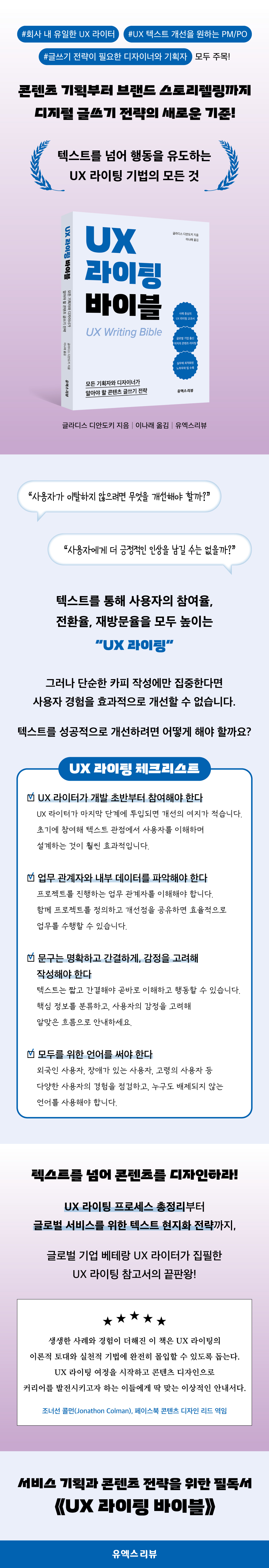 UX ¶óÀÌÅÍ»Ó ¾Æ´Ï¶ó µðÀÚÀÌ³Ê¿Í ±âȹÀÚ, PO, PM¿¡°Ôµµ ÅØ½ºÆ® °¨°¢ÀÌ ÇÊ¿äÇÏ´Ù. ¡¶UX ¶óÀÌÆÃ ¹ÙÀÌºí¡·Àº ±× °¨°¢À» ¾î¶»°Ô Ű¿ö¾ß ÇÏ´ÂÁö¸¦ ¾Ë·ÁÁÖ°í, ´Ü¼øÈ÷ ÁÁÀº ¹®ÀåÀ» ¾²´Â °ÍÀ» ³Ñ¾î ¸ðµÎ°¡ ¡®»ç¿ëÀÚ ¿©Á¤¡¯À» ¼³°èÇÏ´Â ÆÀÀ¸·Î ¿¬°áµÉ ¼ö ÀÖ°Ô ÇÑ´Ù. ÀÌÁ¦ ¸· UX ¶óÀÌÆÃÀ» Á¢ÇÏ´Â »ç¶÷¿¡°Ô´Â ½Ç¹«ÀÇ ¹®À» ¿©´Â ¾È³»¼°¡, ÆÀ ÀüüÀÇ Çù¾÷°ú ÇÁ·Î¼¼½º¸¦ °í¹ÎÇÏ´Â ½Ç¹«ÀÚ¿¡°Ô´Â Àü·«ÀûÀÎ »ç°í¸¦ Á¦°øÇÏ´Â µµ±¸°¡ µÉ °ÍÀÌ´Ù.