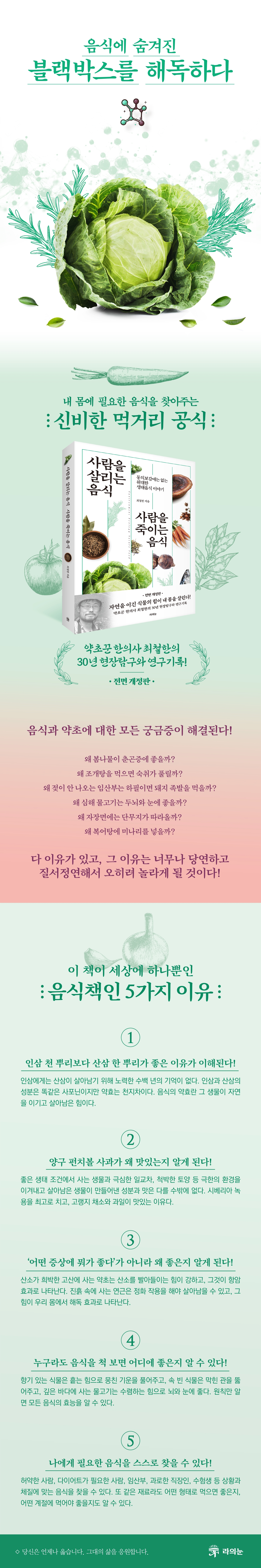 ÀÌ Ã¥Àº ±âÁ¸ÀÇ ½ÄǰÇÐ, ¿µ¾çÇÐ, ½Ä¹°ÇÐÀº ¹°·Ð ÇÑÀÇÇаúµµ ´Ù¸¥ ½Ã°¢¿¡¼ À½½Ä°ú ¾àÃʸ¦ ÅëÂûÇϰí ÀÖ´Ù. ¾àÈ¿¶õ ¾î¶² ¼ººÐ¿¡¼ ³ª¿À´Â °ÍÀÌ ¾Æ´Ï¶ó »ý¸íü°¡ »ì¾Æ³²±â À§ÇØ ±â¿ïÀÎ ³ë·Â°ú ±â¾ï¿¡¼ ³ª¿À¸ç, ±× ±â¾ïÀÌ ¿ì¸® ¸ö¼Ó¿¡¼ ±×´ë·Î ÀçÇöµÈ´Ù´Â °ÍÀÌ´Ù. °í»ê ¾àÃÊ´Â °ø±â°¡ Èñ¹ÚÇÑ È¯°æ¿¡¼ »ì¾Æ°¡±â À§ÇØ »ê¼Ò¸¦ ²ø¾îµéÀÌ´Â ±â´ÉÀÌ È°¹ßÇϹǷÎ, À̸¦ »ç¶÷ÀÌ ¼·ÃëÇßÀ» ¶§ ¿ì¸® ¸ö¿¡ »ê¼Ò¸¦ °ø±ÞÇØÁÖ¾î ¾ÏÀ» ¿¹¹æÇØÁØ´Ù. ÀÌ Ã¥Àº ÀÌ·± ¹æ½ÄÀ¸·Î ´É¼± ½Ä¹°, »ç¸· ½Ä¹°, ²®µ¥±â µ¿¹°, ½ÀÁö »ý¹°, ±â»ý ¹ö¼¸, ½ÉÇØ ¹°°í±â, ÀÙ ³ÐÀº ½Ä¹°, ±¸¸Û ¶Õ¸° ½Ä¹°, ½Ï°ú º½³ª¹° µîÀÇ Æ¯Â¡°ú È¿´ÉÀ» ¼³¸íÇϰí ÀÖ´Ù.