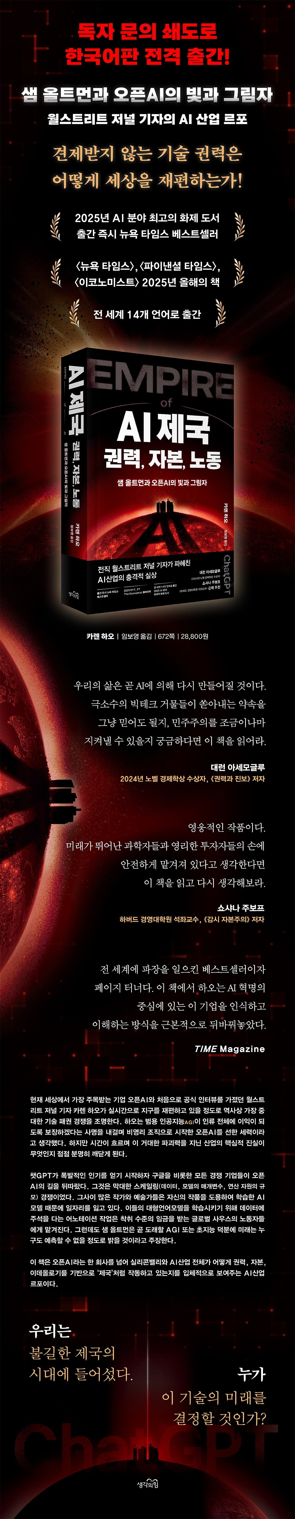 _38~39ÂÊ, ÇÁ·Ñ·Î±× AI °³¹ß¿¡ ÇÊ¿äÇÑ ½Ã°£°ú ºñ¿ëÀÌ ³¡¾øÀÌ ºÒ¾î³ª´Â »óȲÀ» Á¤´çÈÇϱâ À§ÇØ, ¿ì¸®°¡ µè°Ô µÇ´Â ¾à¼Óµµ ÀÚ²Ù¸¸ °ÅÃ¢ÇØÁø´Ù. ÇѶ§ AI´Â °úÇÐÀû Èï¹Ì°Å¸®ÀÌÀÚ »ó¾÷ÀûÀ¸·Îµµ ¾î´À Á¤µµ ÀáÀç·ÂÀÌÀÖ´Â ±â¼úÀ̾ú´Ù. ÀÌÁ¦ AI´Â 4Â÷ »ê¾÷Çõ¸íÀÇ ÀüÁ¶ÀÌÀÚ Ãʰ´ë±¹À̱â À§Çؼ´Â ¹Ýµå½Ã °®Ãç¾ß ÇÒ ÇÙ½É ¿ª·®ÀÌ µÇ¾ú´Ù. ¾ðÁ¨°¡ ´Þ¼ºÇÒ AGI´Â ±âÈĺ¯È ¹®Á¦¸¦ ÇØ°áÇϰí, Àú·ÅÇÑ ÀǷἺñ½º¸¦ °¡´ÉÇÏ°Ô Çϰí, °øÁ¤ÇÑ ±³À°À» Á¦°øÇÒ °Å¶ó°í ÇÑ´Ù. ÀÌ·± »ç°í¹æ½ÄÀÇ ´ëÇ¥ÀûÀÎ »ç·Ê°¡ ¿ÀÇÂAI´Ù. ±×µéÀº ÀÌ ±â¼úÀÌ ±×·± ¾à¼ÓÀ» ¾î¶»°Ô ½ÇÇöÇÒÁö¿¡ ´ëÇØ¼´Â ÀüÇô ¼³¸íÇÏÁö ¸øÇÑ´Ù. ±×Àú Áö±Ý ÀÌ ±â¼úÀ» °³¹ßÇÏ´Â µ¥ »çȸ°¡ ÁöºÒÇØ¾ß ÇÏ´Â ¾î¸¶¾î¸¶ÇÑ ºñ¿ëÀÌ ¾ðÁ¨°¡ ±× °ª¾îÄ¡¸¦ ÇÒ °ÍÀ̶ó´Â ¸»¸¸ ¹Ýº¹ÇÑ´Ù. _148~149ÂÊ, 4Àå Çö´ëÈÀÇ ²Þ µö·¯´×¿¡ ´ëÇÑ ¼öÃ÷ÄɹöÀÇ ¹ÏÀ½¸¸ÅÀ̳ª ½ºÄÉÀϸµ¿¡ ´ëÇÑ ±×ÀÇ °üÁ¡ ¶ÇÇÑ È®°íÇß´Ù. ¼öÃ÷Äɹö´Â AI¸¦ ¹ßÀü½Ã۱â À§ÇØ ±»ÀÌ ´õ º¹ÀâÇÑ ½Å°æ¸ÁÀ» ¸¸µé°Å³ª »õ·Î¿î Çõ½ÅÀûÀÎ ±â¹ýÀ» °³¹ßÇÒ Çʿ䰡 ¾ø´Ù´Â, ´ç½Ã·Î¼´Â ±Ø´ÜÀûÀÎ ÀÔÀåÀ» ÃëÇß´Ù. ±×´Â ¼·Î ´Ù¸¥ Á¾ÀÇ Áö´ÉÀÌ »ý¹°ÇÐÀû ³úÀÇ Å©±â¿Í »ó°ü°ü°è°¡ ÀÖ´Ù°í ¸»Çϰï Çß´Ù. µû¶ó¼ ³ëµå¿Í ´º·±ÀÌ ºñ½ÁÇÏ´Ù¸é, ´Ü¼øÈ÷ ½Å°æ¸ÁÀÇ Å©±â¸¦ Ű¿ö ³ëµå°¡ ´õ¿í ´õ ¸¹¾ÆÁö¸é µðÁöÅÐ Áö´ÉÀÇ ¹ßÀüÀÌ ÀÌ·ïÁú °Å¶ó°í ÁÖÀåÇß´Ù. _183ÂÊ, 5Àå ¾ß¸ÁÀÇ Å©±â Á÷¿øµé »çÀÌ¿¡¼´Â ¡°¿ì¸® ȸ»çÀÇ ºñ¹ÐÀº ½Ò ÇÑ Åç¿¡ ´Ù ÀûÀ» ¼ö ÀÖ´Ù¡±´Â ¸»ÀÌ À¯ÇàÇߴµ¥, ±× ºñ¹ÐÀº ½ºÄÉÀÏÀ̶ó´Â ´Ü¾î Çϳª¸¦ °¡¸®Å² °ÍÀ̾ú´Ù. _223ÂÊ, 6Àå ½Âõ ´ÏŸ»þ ƼÄí ±âÀÚ´Â ´ëÇü¾ð¾î¸ðµ¨ÀÌ »ý¼ºÇÑ °á°ú¹°À» º¸°í ±× ¹èÈÄ¿¡ ÁøÂ¥ ÀÇ¹Ì¿Í Àǵµ°¡ Á¸ÀçÇÏ´Â °Íó·³ »ç¶÷µéÀ» ¼ÓÀÏ ¼ö ÀÖ´Ù´Â ¹®Á¦¸¦ °æ°íÇÑ ¡°È®·üÀû ¾Þ¹«»õ¡± ³í¹®ÀÇ ¿¡¹Ð¸® º¥´õ¿Í ¸Þ±× ¹Ìÿ°úµµ À̾߱⸦ ³ª´³´Ù. ¡°¿ì¸®´Â ÀÌÁ¦ ¾Æ¹« »ý°¢ ¾øÀÌ ¸»À» »ý¼ºÇÏ´Â ±â°è¸¦ °®°Ô µÇ¾úÁö¸¸, ±× ±â°è µÚ¿¡ ¾Æ¹«·± ÀǽÄÀÌ ¾ø´Ù°í »ó»óÇÏ´Â ¹ýÀº ¾ÆÁ÷ ¹è¿ìÁö ¸øÇß½À´Ï´Ù.¡± º¥´õ°¡ ¸»Çß´Ù. _376ÂÊ, 10Àå ½Å°ú ¾Ç¸¶ ¼öÃ÷Äɹö¿¡°Ô´Â À̾߱Ⱑ ´Þ¶ú´Ù. ±×´Â ´Ù¸¥ ¿¬±¸Àڵ麸´Ùµµ ªÀº ½ÃÀÏ ³»¿¡ AGI¿¡ µµ´ÞÇÒ °¡´É¼ºÀ» °ÇÏ°Ô ¹Ï¾î¿Ô±â¿¡, ¿ÀÇÂAI ¸ðµ¨ÀÇ ºñ¾àÀûÀÎ ¼º´É Çâ»óÀº ±×ÀÇ ½Å³äÀ» ´õ¿í ±»ÇôÁÙ »ÓÀ̾ú´Ù. ±×´Â ÀÚ½ÅÀÌ ÀÏÁ¾ÀÇ Ãß·ÐÀÌ ³ªÅ¸³ª´Â Àå¸éÀ» ¸ñ°ÝÇϰí ÀÖ´Ù°í È®½ÅÇÏ°Ô µÇ¾ú°í, ½º½ÂÀÎ Èùư¿¡°Ô AGI°¡ ÀÓ¹ÚÇß´Ù°í ¸»Çϰï Çß´Ù.¡¦ ¼öÃ÷Äɹö°¡ µîÀåÇß´Ù. ±×´Â ÇöÁö ¿¹¼ú°¡¿¡°Ô ÀÇ·ÚÇØ ¸¸µç ¸ñ°¢ ÀÎÇüÀ» È·ÔºÒ ±Ùó¿¡ ¼¼¿î µÚ, ±ØÀûÀÎ ÆÛÆ÷¸Õ½º¸¦ ½ÃÀÛÇß´Ù. ±×´Â ÀÌ ÀÎÇüÀÌ ¿ÀÇÂAI°¡ ¼±Çϰí Á¤·ÄµÈ AGI¶ó°í »ý°¢ÇÏ°í ¸¸µé¾úÁö¸¸, ¾Ë°í º¸´Ï °ÅÁþ°ú ±â¸¸À¸·Î Á¡Ã¶µÈ AGI¸¦ »ó¡ÇÑ´Ù°í ¼³¸íÇß´Ù. ±×´Â ¿ÀÇÂAIÀÇ Àǹ«´Â ¹Ù·Î À̰ÍÀ» ÆÄ±«ÇÏ´Â °ÍÀ̶ó°í ¸»Çß´Ù. ºÒ°ú ¸î ¹ÌÅÍ ¶³¾îÁø °÷¿¡ ¹Ì±¹ »ï³ª¹« ¸î ±×·ç°¡ °í´ëÀÇ ¸ñ°ÝÀÚó·³ ¾îµÒ ¼Ó¿¡ ¼ ÀÖ¾ú´Ù. ¼öÃ÷Äɹö´Â ±× ÀÎÇü¿¡ ¶óÀÌÅÍ ±â¸§À» ³¢¾ñ°í ºÒÀ» ºÙ¿´´Ù. _377~378ÂÊ, 10Àå ½Å°ú ¾Ç¸¶ ¿ÃÆ®¸ÕÀÇ ¡°±¸Ã¼ÀûÀÎ °ÅÁþ¸»¡±¿¡ ´ëÇØ À̾߱âÇÏ´Â µµÁß¿¡ ¶Ç ÇϳªÀÇ °ÅÁþ¸»ÀÌ ½Ç½Ã°£À¸·Î µå·¯³ °ÍÀÌ´Ù. ¸¸¾à ¼öÃ÷Äɹö°¡ ¸ÆÄø®¿¡°Ô ¿¬¶ôÀ» ÇÒ ÀÌÀ¯°¡ ¾ø¾ú´Ù¸é ¿ÃÆ®¸ÕÀÇ °ÅÁþ¸»Àº µéÅ볪Áö ¾Ê¾ÒÀ» °ÍÀÌ´Ù. ¿ÃÆ®¸ÕÀº µÎ »ç¶÷ÀÌ Æò¼Ò ¼·Î ÀüÇô ¾ê±â¸¦ ³ª´©Áö ¾Ê´Â´Ù´Â °ÍÀ» ¾Ë°í ÀÖ¾ú´Ù. ÀÌÁ¦ ¼öÃ÷Äɹö°¡ º¸±â¿¡ ¿ÃÆ®¸ÕÀÌ °ÅÁþ¸»À» Çϰí ÀÏÀ» ±³¹¦ÇÏ°Ô Á¶ÀÛÇÏ´Â ºóµµ·Î º¼ ¶§ ÀÌ·± ÀÏÀÌ ¶Ç ÀϾ´Â °ÍÀº ±×Àú ½Ã°£ ¹®Á¦¿´´Ù. _528ÂÊ, 15Àå Æ÷¼® ¿ÀÇÂAI´Â ÀÌÁ¦ ºÒÆíÇÑ Àü¸ÁÀ» Á÷½ÃÇϱ⠽ÃÀÛÇß´Ù. ¸ðµ¨ÀÇ ¼º´ÉÀ» Çâ»ó½ÃŰ´Â µ¥ ±×°£ È¿°ú°¡ ÀÔÁõµÆ´ø ½ºÄÉÀϸµ¸¸À¸·Î´Â ÀÌÁ¦ ´õ ÀÌ»ó ÃæºÐÇÏÁö ¾Ê¾Ò´Ù. AI ½Ã½ºÅÛÀ» ´õ¿í ¹ßÀü½ÃŰ·Á¸é ±Ùº»ÀûÀ¸·Î »õ·Î¿î ¾ÆÀ̵ð¾î°¡ ÇÊ¿äÇØ º¸¿´´Ù. ´©±¸¿¡°Ô³ª À̸¦ ½ÇõÇϱâ´Â ¾î·Á¿î ÀÏÀÌÁö¸¸, Áö³ ¼ö³â°£ °úÇÐÀÇ °æ°è¸¦ ³ÐÈ÷´Â ޱ¸¸¦ µîÇѽÃÇÏ°í ±âÁ¸¿¡ ³ª¿Í ÀÖ´ø ¿¬±¸ ¼º°ú¸¦ Áß½ÉÀ¸·Î ÀηÂÀ» ¸ðÁýÇÏ°í ÆÀÀ» Á¶Á÷ÇØ¿Â ¿ÀÇÂAI·Î¼´Â ´õ¿í ¾î·Á¿î ÀÏÀ̾ú´Ù. _591~592ÂÊ, 18Àå Á¦±¹À» ¼¼¿ì´Â °ø½Ä ÃâÆÇ»ç ¼ÆòNYT, Financial Times, The Economicst 2025³â ¿ÃÇØÀÇ Ã¥