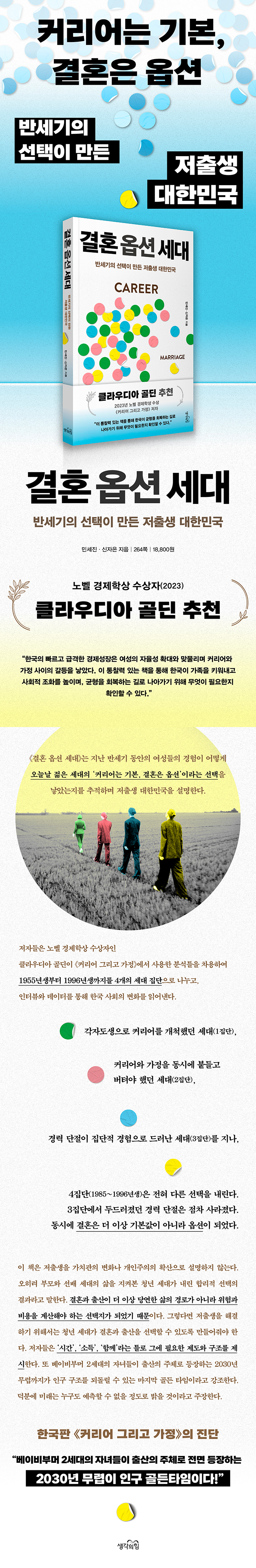 Ã¥¼Ò°³¡¶°áÈ¥ ¿É¼Ç ¼¼´ë¡·´Â Áö³ ¹Ý¼¼±â µ¿¾ÈÀÇ ¿©¼ºµéÀÇ °æÇèÀÌ ¾î¶»°Ô ¿À´Ã³¯ ÀþÀº ¼¼´ëÀÇ ¡®Ä¿¸®¾î´Â ±âº», °áÈ¥Àº ¿É¼Ç¡¯À̶ó´Â ¼±ÅÃÀ» ³º¾Ò´ÂÁö¸¦ ÃßÀûÇϸç ÀúÃâ»ý ´ëÇѹα¹À» ¼³¸íÇÑ´Ù. ÀúÀÚµéÀº ³ëº§ °æÁ¦Çлó ¼ö»óÀÚÀΠŬ¶ó¿ìµð¾Æ °ñµòÀÌ ¡¶Ä¿¸®¾î ±×¸®°í °¡Á¤¡·¿¡¼ »ç¿ëÇÑ ºÐ¼®Æ²À» Â÷¿ëÇÏ¿© 1955³â»ýºÎÅÍ 1996³â»ý±îÁö¸¦ 4°³ÀÇ ¼¼´ë Áý´ÜÀ¸·Î ³ª´©°í, ÀÎÅͺä¿Í µ¥ÀÌÅ͸¦ ÅëÇØ Çѱ¹ »çȸÀÇ º¯È¸¦ Àо´Ù. °¢ÀÚµµ»ýÀ¸·Î Ä¿¸®¾î¸¦ °³Ã´Çß´ø ¼¼´ë(1Áý´Ü), Ä¿¸®¾î¿Í °¡Á¤À» µ¿½Ã¿¡ ºÙµé°í ¹öÅß¾ß Çß´ø ¼¼´ë(2Áý´Ü), °æ·Â ´ÜÀýÀÌ Áý´ÜÀû °æÇèÀ¸·Î µå·¯³ ¼¼´ë(3Áý´Ü)¸¦ Áö³ª, 4Áý´Ü(1985~1996³â»ý)Àº ÀüÇô ´Ù¸¥ ¼±ÅÃÀ» ³»¸°´Ù. 3Áý´Ü¿¡¼ µÎµå·¯Á³´ø °æ·Â ´ÜÀýÀº Á¡Â÷ »ç¶óÁ³´Ù. µ¿½Ã¿¡ °áÈ¥Àº ´õ ÀÌ»ó ±âº»°ªÀÌ ¾Æ´Ï¶ó ¿É¼ÇÀÌ µÇ¾ú´Ù.