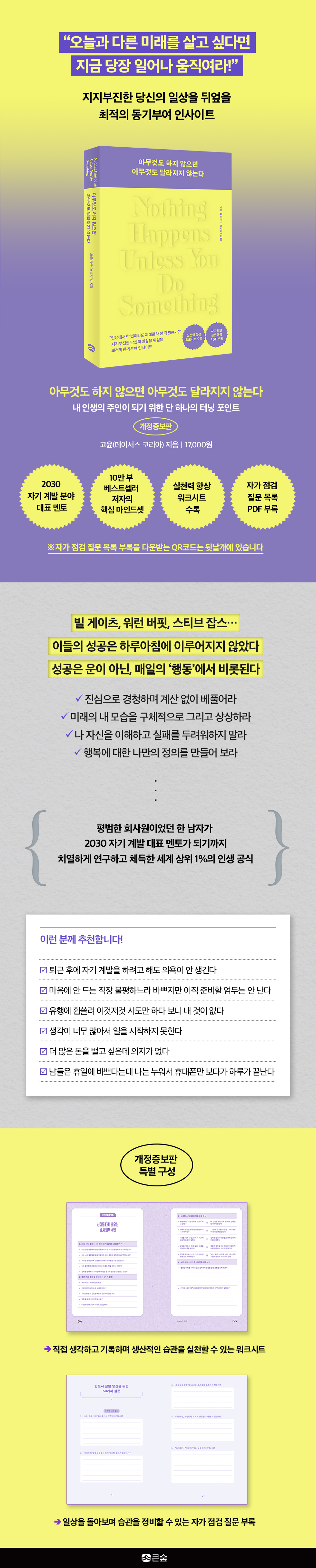 3³â ¸¸¿¡ »õ ¿ÊÀ» ÀÔ°í °³Á¤Áõº¸ÆÇÀ¸·Î Ãâ°£µÈ ¡¶¾Æ¹«°Íµµ ÇÏÁö ¾ÊÀ¸¸é ¾Æ¹«°Íµµ ´Þ¶óÁöÁö ¾Ê´Â´Ù¡· ´Â °¢ éÅͺ° ¿öÅ©½ÃÆ®¸¦ Ãß°¡·Î ¼ö·ÏÇØ, µ¶ÀÚ°¡ Á÷Á¢ »ý°¢ÇÏ°í ±â·ÏÇϸç Ã¥¿¡¼ Á¦¾ÈÇÏ´Â ¹æ¹ýµéÀ» ½ÇõÇÒ ¼ö ÀÖµµ·Ï µ½´Â´Ù. ¶ÇÇÑ ºÎ·ÏÀ¸·Î Á¦°øÇÏ´Â ÀÚ°¡ Á¡°Ë Áú¹® ¸ñ·ÏÀº ¹«½ÉÄÚ Èê·Áº¸³»´Â ÀÏ»ó°ú ³»¸éÀ» µ¹¾Æº¸¸ç ¿øÇÏ´Â »îÀ» ÇâÇØ ÇÑ ¹ß¦¾¿ ´Ù°¡°¡´Â ·çƾÀ» ¸¸µå´Â µ¥ º¸ÅÆÀÌ µÈ´Ù. º¯È¸¦ ²Þ²ÙÁö¸¸ ù°ÉÀ½À» ¶¼±â ¾î·Á¿ï ¶§, ³»°¡ °¡´Â ±æÀÌ ¸Â´ÂÁö ¹æÇâ¿¡ È®½ÅÀÌ ¾øÀ» ¶§, ÀÌ Ã¥À» ÆîÃÄ Â÷±ÙÂ÷±Ù µû¶ó°¡±â¸¸ ÇÑ´Ù¸é ÀÚ½ÅÀÌ ²Þ²Ù´ø Àλý¿¡ ¾î´À»õ µµ´ÞÇØ ÀÖÀ» °ÍÀÌ´Ù.