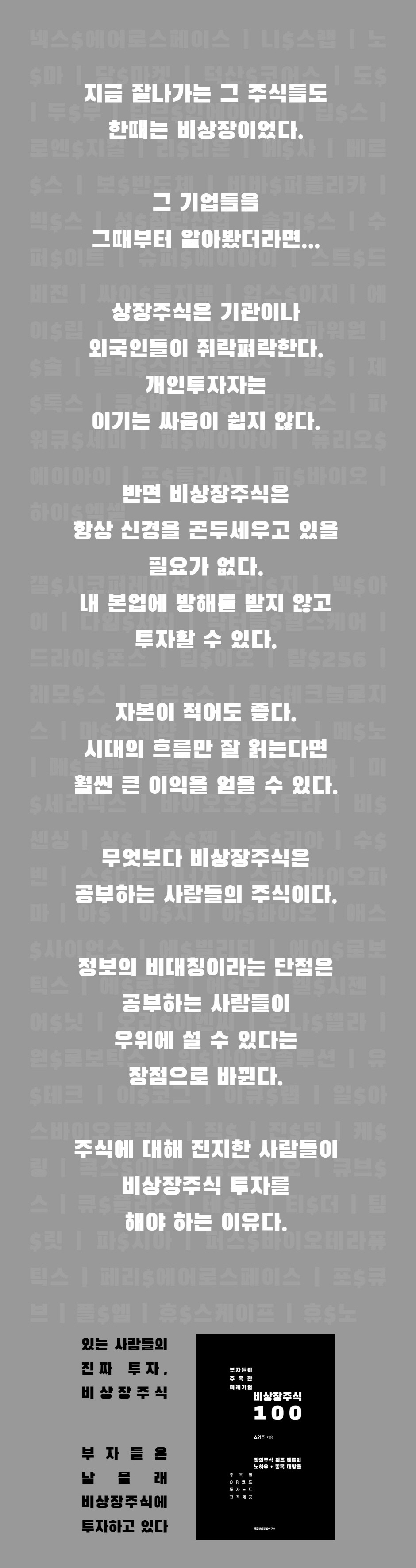 À̹ø Ã¥ ¡®ºÎÀÚµéÀÌ ÁÖ¸ñÇÑ ¹Ì·¡±â¾÷ ºñ»óÀåÁÖ½Ä 100¡¯Àº ºñ»óÀåÁÖ½Ä ÅõÀÚ¿¡ °üÇÑ ¿øÄ¢ ¹× Á¶¾ð¿¡ À̾î ÃÖ±Ù ±¹³» ºñ»óÀåÁֽĵé Áß ¿¹ºñÅõÀÚÀÚµéÀÌ Áö¼ÓÀûÀ¸·Î °ü½ÉÀ» °¡Á®¾ß ÇÒ ±â¾÷ 100°÷À» ¼±Á¤ÇÏ¿© ¼Ò°³ÇÑ´Ù. 2ºÎ ´ëÇѹα¹ ºñ»óÀåÁÖ½Ä 100À» ÅëÇØ ±â¾÷µéÀ» ¾Ë±â ½±°Ô ¼³¸íÇÏ°í °¢ ȸ»ç ȨÆäÀÌÁö¿¡ ¹Ù·Î Á¢¼ÓÇÒ ¼ö ÀÖ´Â QRÄڵ带 Á¦°øÇÑ´Ù. ¾Æ¿ï·¯ °ü½É ±â¾÷ÀÇ ÁÖ¿ä»çÇ×À» Á÷Á¢ ±â·ÏÇÏ°í ¾÷µ¥ÀÌÆ® ÇÒ ¼ö ÀÖµµ·Ï ÅõÀÚ³ëÆ® ¾ç½ÄÀÌ À̾îÁö´Â ±¸¼ºÀÌ´Ù.