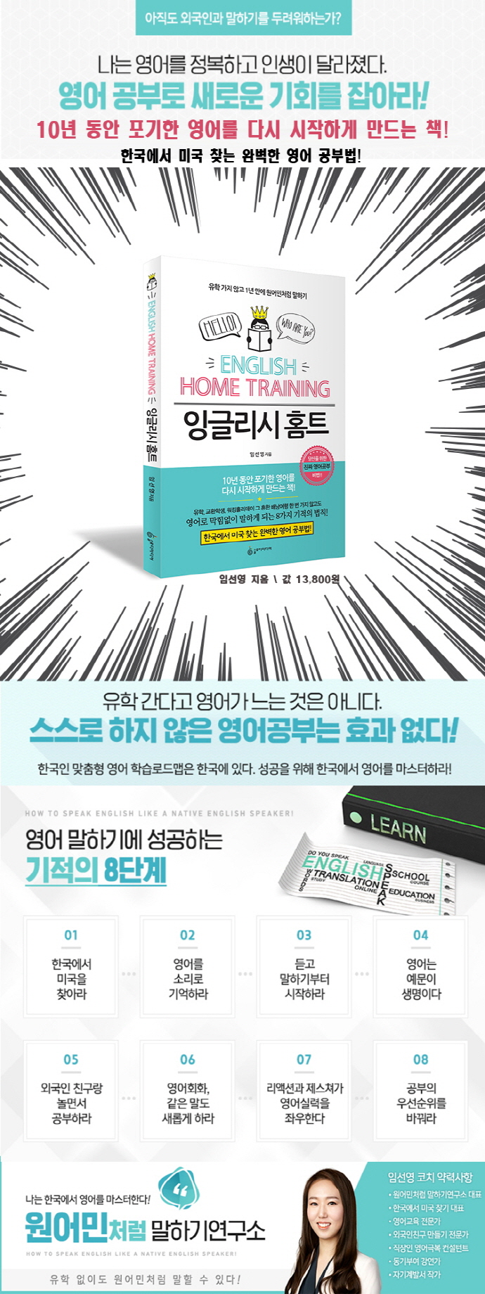 - ¡¸Part 1. ¿µ¾î, À¯ÇÐÀÌ ´äÀϱî?¡¹¿¡¼ ÃʹݺÎÅÍ ¹®¹ý ¡¤ ´Ü¾î ¡¤ ¹ßÀ½¿¡ Å« ºñÁßÀ» µÎ°í ½Ã°£°ú ¿¡³ÊÁö¸¦ ³¶ºñÇÏ¸é ¿µ¾î´Â ÀԽðøºÎ °°ÀÌ Áö°ã°í Èûµç °øºÎ°¡ µÉ »ÓÀÌ´Ù. ±×°ÍÀÌ ´ç½ÅÀ» Æ÷±âÇÏ°Ô ¸¸µç´Ù´Â °ÍÀ» ¸í½ÉÇØ¶ó. ¹®¹ýÀº ±âº»À» ¾Ë¸é µÇ°í, ´Ü¾î´Â ¸»Çϱ⠿¬½ÀÀ» ÇÏ¸ç °¡Àå ½¬¿î ´Ü¾î·Î À̾߱âÇÏ¸é µÇ°í, ¹ßÀ½Àº »ó´ë¹æÀÌ ¾Ë¾ÆµéÀ» Á¤µµ¸¸ ÇÏ¸é¼ ½ÃÀÛÇÏ¸é µÈ´Ù. - ¡¸Part 2. ¹®¹ý?´Ü¾î?¹ßÀ½¿¡ ÁýÂøÇÏÁö ¸¶¶ó¡¹¿¡¼ ´ç½ÅÀÌ ¸¸¾à Èë¼öÀú¶ó°í ºñ°üÇϰí ÀÖ°í, À¯ÇÐÀ» °¡Áö ¸øÇ߱⠶§¹®¿¡ ¿µ¾î¸¦ ¸øÇÑ´Ù°í ÁÂÀýÇϰí ÀÖ´Â »ç¶÷À̶ó¸é ³ª´Â ±×°ÍÀº ¹®Á¦°¡ ¾Æ´Ï¶ó°í À̾߱âÇØÁÖ°í ½Í´Ù. ¹æ¹ýÀ» ¸ô¶úÀ» »Ó ´ç½Åµµ ÃæºÐÈ÷ ÇÒ ¼ö ÀÖ´Ù. µ·¿¡ ¿©À¯°¡ ¾ø´Â »ç¶÷»Ó¸¸ ¾Æ´Ï¶ó ÁÖº¯¿¡ µ¹ºÁ¾ß ÇÏ´Â °¡Á·ÀÌ ÀÖ¾î¼ ÇØ¿Ü·Î ¶°³¯ ¼ö ¾ø´Â »ç¶÷µµ ÇÒ ¼ö ÀÖ´Ù. ³»°¡ ÇÑ ¹æ¹ýÀº Çѱ¹À» ¹þ¾î³ªÁö ¸øÇÏ´Â »ç¶÷, ¸ðµÎ°¡ ÇÒ ¼ö ÀÖ´Â ¹æ¹ýÀÌ´Ù. - ¡¸Part 3. ³ª´Â À¯ÇÐ °¡Áö ¾Ê°í Çѱ¹¿¡¼ ¿µ¾î°øºÎ¸¦ ½ÃÀÛÇß´Ù¡¹¿¡¼ ¿µ¾î¸¦ °øºÎÇÒ ¶§ ¿¹¹®À» ¸¸µé¾îº» ÀûÀÌ Àִ°¡? ±× Á߿伺À» ¾Ë°í ²ÙÁØÈ÷ ¸¸µé¸ç °øºÎÇÑ »ç¶÷Àº ¿µ¾î ¸¶½ºÅÍÀÇ ±æÀ» °È°í ÀÖ´Â »ç¶÷ÀÌ´Ù. ¿µ¾î ¿¹¹®Àº ¿ì¸®°¡ ¾ó¸¶³ª ÀÌÇØÇß´ÂÁö¸¦ Á¤È®ÇÏ°Ô º¸¿©ÁÖ´Â ¹æ¹ýÀÌ´Ù. - ¡¸Part 4. ¿µ¾î·Î ¸·Èû¾øÀÌ ¸»ÇÏ°Ô µÇ´Í 8°¡Áö ±âÀûÀÇ ¹ýÄ¢¡¹¿¡¼ ¿µ¾î ¸»Çϱâ´Â ¸Å¿ì ´Ü¼øÇÏ´Ù. ¸¹ÀÌ ¸»Çغ¸´Â »ç¶÷ÀÌ ÀßÇÏ°Ô µÇ¾î ÀÖ´Ù. ¾î¸¥ÀÌ ¾ÆÀ̵麸´Ù ÀÎÁö´É·Â°ú ÀÇÁö·ÂÀÌ ÁÁ±â ¶§¹®¿¡ ÇϳªÀÇ ¾àÇÑ ºÎºÐÀ» º¸¿ÏÇÏ¿© ´õ Àû±ØÀûÀ¸·Î ¸»ÇÏ´Â ¾î¸¥ÀÌ µÈ´Ù¸é ¾î¸° ³ªÀ̰¡ Áö³µ´Ù ÇØµµ ÃæºÐÈ÷ ¿µ¾î¸¦ ÀßÇÒ ¼ö ÀÖ´Ù. -¡¸Part 5. º¡¾î¸® ¿µ¾î¿¡¼ ÇÁ·¹Á¨ÅÍ ¿µ¾î·Î ¼ºÀåÇ϶󡹿¡¼ ÃâÆÇ»ç ¼Æò¾ÆÁ÷µµ ¿Ü±¹Àΰú ¸»Çϱ⸦ µÎ·Á¿öÇϴ°¡?