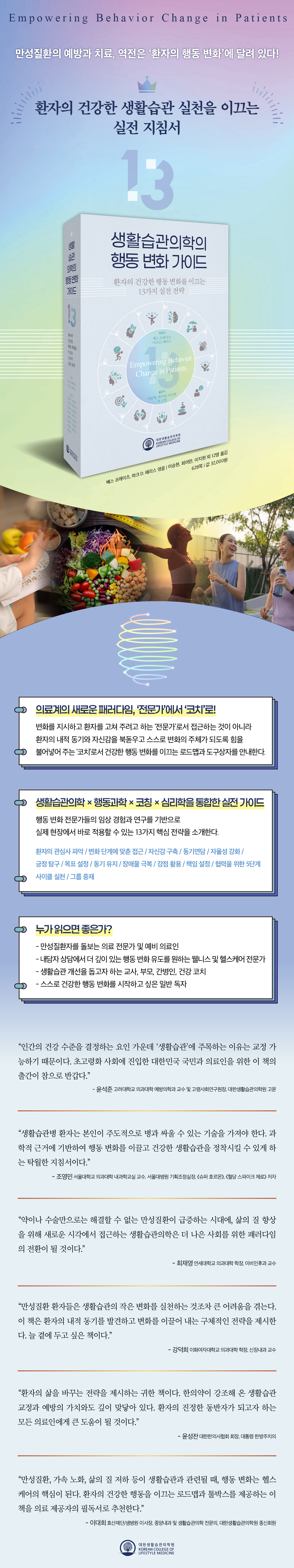 ¸¸¼ºÁúȯ ½Ã´ë, ¿ì¸®´Â °Ç°ÇÑ »ýȰ½À°üÀÇ Á߿伺À» ³Ê¹«µµ Àß ¾Ë°í ÀÖÁö¸¸, ¿©ÀüÈ÷ ¸¹Àº »ç¶÷ÀÌ ÇØ·Î¿î »ýȰ½À°ü¿¡¼ ½±°Ô ¹þ¾î³ªÁö ¸øÇϰí ÀÖ´Ù. ±ÕÇü ÀâÈù ½Ä»ç, ±ÔÄ¢ÀûÀÎ ½ÅüȰµ¿, ÃæºÐÇÑ ¼ö¸é, ±àÁ¤ÀûÀÎ »çȸÀû °ü°è Çü¼º, À¯ÇØ ¹°Áú ȸÇÇ, ½ºÆ®·¹½º °ü¸® µî ¡®¹«¾ùÀ» ÇØ¾ß ÇÏ´ÂÁö¡¯´Â ¸íÈ®ÇÏÁö¸¸, ¡®¾î¶»°Ô ÇൿÀ¸·Î ¿Å±â°í À¯ÁöÇÒÁö¡¯´Â ¿©ÀüÈ÷ ¾î·Á¿î °úÁ¦´Ù. ÀÇ·áÀÎÀº Àü¹® Áö½ÄÀ» ¹ÙÅÁÀ¸·Î ȯÀÚ¿¡°Ô ¡®¹«¾ùÀ» ÇØ¾ß ÇÏ´ÂÁö¡¯´Â ÃæºÐÈ÷ ¼³¸íÇØ ÁÙ ¼ö ÀÖÁö¸¸, Á¤ÀÛ È¯ÀÚ°¡ ÇൿÀ» º¯È½Ã۰í Áö¼ÓÇϵµ·Ï ¾È³»ÇÏ´Â µ¥¿¡´Â ¸·¸·ÇÔÀ» ´À³¢´Â °æ¿ì°¡ ¸¹´Ù. ÀÌ Ã¥Àº ¹Ù·Î ±× ¡®Áö½Ä¡¯°ú ¡®½Çõ¡¯ »çÀÌÀÇ °£±ØÀ» ¸Þ¿ì±â À§ÇÑ ½Ç¿ëÀûÀÎ µµ±¸ÀÌ´Ù. ÀÇ·áÀΰú ±âŸ ÇコÄɾî Á¦°øÀÚµéÀÌ ½ÇÁ¦ ÇöÀå¿¡¼ ȯÀÚÀÇ °Ç°ÇÑ Çൿ º¯È¸¦ È¿°úÀûÀ¸·Î À̲ø¾î ³¾ ¼ö ÀÖµµ·Ï µ½´Â ½ÇÀü Áöħ¼ÀÌ´Ù.