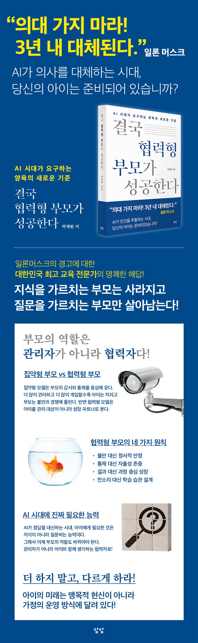 ÅëÁ¦°¡ ¾Æ´Ï¶ó Çù·ÂÀ¸·Î ÇÔ²² »ì¾Æ³²¾Æ¾ß ÇÕ´Ï´Ù.¡± - p.6 ¡°ÀÌ ÆíÁö¿¡¼ Àú´Â ºÎ¸ðÀÇ ±â´ë¸¦ Àç¾Óó·³ ´À³¢´Â ¾ÆÀÌÀÇ Àý±Ô¸¦ º¸¾Ò½À´Ï´Ù. ¸ðµç ½ÇÆÐÀÇ ¿øÀÎÀ» Àڽſ¡°Ô µ¹¸®¸ç ½º½º·Î¸¦ ÁËÀÎÀ¸·Î ³«ÀÎÂï´Â ¾ÆÀÌÀÇ °íÅ뽺·¯¿î °í¹éÀ» µé¾ú½À´Ï´Ù.¡± - p.13 ¡°ºÎ¸ðÀÇ µ¿±â°¡ ¡®³» ¾ÆÀÌÀÇ ¼ºÀå¿¡ ¹«¾ùÀÌ ÇÊ¿äÇѰ¡?¡¯¶ó´Â °ü½É¿¡¼ ¡®³» ºÒ¾ÈÀ» ÀáÀç¿ì±â À§ÇØ ¹«¾ùÀ» ÇØ¾ß Çϴ°¡?¡¯¶ó´Â ¿å±¸·Î ¹Ù²î´Â ¼ø°£, ÇÕ¸®ÀûÀ̾ú´ø Àü·«Àº ÆÄ±«ÀûÀÎ ÁýÂøÀ¸·Î º¯ÁúµË´Ï´Ù.¡± - p.16 ¡°ºÎ¸ð°¡ ¾ÆÀ̸¦ À§ÇØ ´õ ¸¹ÀÌ ÅõÀÚÇÏ°í ³ë·ÂÇÒ¼ö·Ï ¾ÆÀÌ´Â ¿ÀÈ÷·Á ´õ ½±°Ô ¸Á°¡Áú ¼ö ÀÖ½À´Ï´Ù. °ü¸®ÀÚÀÇ ³ë·ÂÀÌ Å¬¼ö·Ï ¾ÆÀÌÀÇ Àڹ߼ºÀº Áú½ÄÇϱ⠶§¹®ÀÔ´Ï´Ù.¡± - p.17 ¡°¾ÆÀÌ¿¡°Ô Á÷Á¢ÀûÀÎ ¿µÇâÀ» ¹ÌÄ¡´Â °ÍÀº µ·ÀÌ ¾Æ´Ï¶ó ºÎ¸ðÀÇ ¸»Åõ, Ç¥Á¤, °¨Á¤ Ç¥Çö °°Àº µ·À¸·Î »ì ¼ö ¾ø´Â ÀÚ»êÀÔ´Ï´Ù.¡± - p.27 ¡°ÇູÇÑ °ü°è´Â ¾çÀ°ÀÇ °á°ú°¡ ¾Æ´Ï¶ó Åä´ëÀÔ´Ï´Ù. ºÎ¸ð¿Í ¾ÆÀÌ »çÀÌÀÇ °ü°è°¡ ´Ü´ÜÇÒ¼ö·Ï ¾ÆÀÌ´Â ½ÇÆÐ¿Í µµÀüÀ» °ßµô ÈûÀ» ¾ò½À´Ï´Ù.¡± - p.102 ¡°Á¤¼Àû ¾ÈÁ¤Àº °¨Á¤ÀÌ Èçµé¸®Áö ¾Ê´Â »óŰ¡ ¾Æ´Ï¶ó, ºÒÈ®½Ç¼ºÀ» °ßµð¸ç »ç°íÀÇ ²öÀ» ³õÁö ¾Ê´Â ´É·ÂÀÔ´Ï´Ù.¡± - p.130 ¡°ÀÚÀ²¼ºÀº ¼±ÅÃÀÇ ÀÚÀ¯°¡ ¾Æ´Ï¶ó ¸ñÀûÀ» Á¤ÀÇÇÏ´Â ´É·ÂÀÔ´Ï´Ù. ¾ÆÀ̰¡ ¡®¿Ö À̰ÍÀ» Çϴ°¡¡¯¸¦ ³¡±îÁö »ý°¢ÇÒ ¼ö ÀÖ°Ô ÇÏ´Â ÈûÀÔ´Ï´Ù.¡± - p.150 ¡°¾ÆÀÌ¿¡°Ô ÇÊ¿äÇÑ °ÍÀº ½ÇÆÐ¸¦ ÇÇÇÏ´Â ´É·ÂÀÌ ¾Æ´Ï¶ó ½ÇÆÐ¸¦ ÀÚ»êÀ¸·Î ¹Ù²Ù´Â °æÇèÀÔ´Ï´Ù.¡± - p.176 ¡°¿ì¸® ³ú´Â °æÇè°ú ÇнÀÀ» ÅëÇØ Æò»ý º¯ÈÇÕ´Ï´Ù. Áö±Ý °øºÎ¿¡ ¾î·Á¿òÀ» °Þ´Â ¾ÆÀÌ¶óµµ ³úÀÇ ¿ø¸®¿¡ ¸Â´Â ȯ°æÀ» ¸¸³ª¸é ¾ó¸¶µçÁö ÀáÀç·ÂÀ» Æø¹ß½Ãų ¼ö ÀÖ½À´Ï´Ù.¡± - p.201 ¡°¾ÆÀÌÀÇ À̾߱⸦ ÆÇ´Ü ¾øÀÌ µè°í, ¾ÆÀ̰¡ ¡®³» ¸¶À½À» ¾Ë¾ÆÁִ±¸³ª¡¯¶ó°í ´À³¢°Ô ÇØÁÖ´Â °úÁ¤À̾߸»·Î °ü°è¸¦ ȸº¹ÇÏ´Â °¡Àå Áß¿äÇÑ ½ÃÀÛÀÔ´Ï´Ù.¡± - p.258 Çù·ÂÇüºÎ¸ð³»ÁöÃâ·Â¿ë 12. ¿¡ÇÊ·Î±× (p.315) ¡°AI ½Ã´ëÀÇ ÇÙ½É ¿ª·®Àº Á¤º¸·®ÀÌ ¾Æ´Ï¶ó »ç°í ±¸Á¶ÀÔ´Ï´Ù. ºÎ¸ð°¡ ¸ÕÀú »ç°í ±¸Á¶¸¦ ÈÆ·ÃÇÒ ¶§, ¾ÆÀÌ´Â ºÎ¸ðÀÇ Åµµ¸¦ ¸ðµ¨¸µÇÏ¸ç ½º½º·Î »ý°¢ÇÏ´Â ÈûÀ» ¹è¿ì°Ô µË´Ï´Ù.¡± - p.315 ÃâÆÇ»ç ¼Æò¡°¾ÆÀ̸¦ À§ÇØ ÃÖ¼±À» ´ÙÇϰí Àִµ¥, ¿Ö Á¡Á¡ ´õ Èûµé¾îÁú±î?¡±