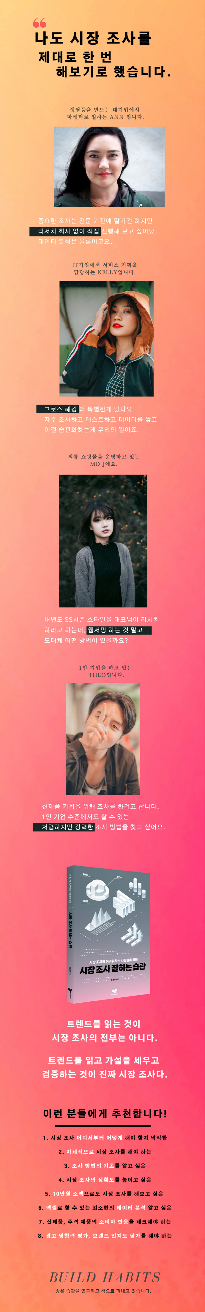 ¼ÒºñÀÚÀÇ Åµµ³ª ¼±È£ÀÇ ÀÌÀ¯ µî Àα¸Åë°èÇÐÀûÀÎ Ãø¸é¿¡¼ºÎÅÍ »çȸ ¹®ÈÀûÀÎ ¼ºÇâ±îÁö, 100°¡ÁöÀÇ ´Ù¸¥ Á¡À» Àû±â À§ÇÑ °üÂûÀ» ÅëÇØ »õ·Î¿î °É ¹ß°ßÇÒ ¼ö ÀÖ°Ô µË´Ï´Ù. Â÷À̸¦ ´À³¢´Â °üÂû ½À°ü, ÀÌ ½ÃÀÛÀÌ Á¤¸» Áß¿äÇÕ´Ï´Ù. (17ÂÊ) ¼ÒºñÀÚ¸¦ ÀÌÇØÇϱâ À§Çؼ´Â µ¥ÀÌÅͰ¡ ÃàÀûµÇ¾î¾ß ÇÑ´Ù´Â °Í ±×¸®°í ¹«ÀÛÁ¤ ¸ðÀ¸´Â °ÍÀÌ ¾Æ´Ï¶ó ¾î¶»°Ô »ç¿ëÇÒ °ÍÀÎÁö¸¦ ¸íÈ®È÷ ÇÏ°í ¸ð¾Æ¾ß ÇÑ´Ù´Â Á¡À» ¼öÂ÷·Ê °Á¶Çϰí ÀÖ½À´Ï´Ù. (30ÂÊ) ³»°¡ ¹«¾ùÀ» ÆÄ¾ÇÇØ¾ß ÇÏ´ÂÁö ¸íÈ®È÷ ±Ô¸íÇÏÁöµµ ¾ÊÀº ä ±×³É Á¶»çÇÑ´Ù´Â »ç½Ç¿¡¸¸ ÁýÁßÇØ¼ Á¤ÀÛ Áß¿äÇÏÁöµµ ¾Ê°í, ´çÀå ÇÊ¿äÇÏÁöµµ ¾ÊÀº °Íµé¸¸ ÀÜ¶à ¾Ë¾Æ ¿À´Â °æ¿ìÀÔ´Ï´Ù. ÀÌ·± °æ¿ì, Á¶»ç °á°ú¿¡ ´ëÇÑ Å¸´ç¼º(³»°¡ Á¶»çÇϰíÀÚ ÇÏ´Â °ÍÀ» ¸íÈ®ÇÏ°Ô Á¶»çÇߴ°¡)°ú ½Å·Ú¼º(Á¶»ç °á°ú¸¦ ¹ÏÀ» ¼ö Àִ°¡)ÀÌ ¶³¾îÁ® ´Ù½Ã Á¶»çÇÏ´Â ÀÏÀ» ÇÏ°Ô µÇ±âµµ ÇÕ´Ï´Ù. (37ÂÊ) ¾Ë°í ½ÍÀº ³»¿ë¿¡ µû¶ó ÀûÀýÇÑ ½ÃÀå Á¶»ç ¹æ¹ýÀÌ µû·Î Á¸ÀçÇÕ´Ï´Ù. ±×·¡¼ ¾î¶² ¹®Á¦¸¦ Á¶»çÇØ¾ß ÇÏ´Â ÀÏÀÌ ¹ß»ýÇßÀ» ¶§, ÇØ´ç ¹®Á¦¸¦ ô º¸´Â ¼ø°£ ¾î¶² Á¶»ç ¹æ¹ýÀÌ ÀûÀýÇÑÁö ±Ý¹æ ÆÄ¾ÇÇÒ ¼ö ÀÖ´Â ½Ç·ÂÀ» °®Ãß°í ÀÖ¾î¾ß ÇÕ´Ï´Ù. (43ÂÊ) Á¤¼º Á¶»ç´Â ¡®±×·± °Í °°´Ù¡¯¶ó´Â Á¤µµ¿¡¼ °á·ÐÀÌ ³ª¿Ã ¼ö ÀÖ´Â Á¶»çÀÔ´Ï´Ù. ¿¹¸¦ µé¸é À̹ø¿¡ ³ª¿Â ¡°A/B/C/D µðÀÚÀÎ Áß ÀÌ µðÀÚÀÎÀ» Á» ´õ ¼±È£ÇÏ´Â °Í °°¾Æ¿ä¡±¶ó´Â Á¤µµÀÇ °á°ú¸¦ È®ÀÎÇÒ ¶§´Â Á¤¼º Á¶»ç¸¦ »ç¿ëÇÒ ¼ö ÀÖ½À´Ï´Ù. ÇÏÁö¸¸ ÇÑ °³¸¦ È®½ÇÈ÷ Á¤ÇØ¾ß ÇÏ´Â °æ¿ì¿¡´Â Á¤·® Á¶»ç¸¦ »ç¿ëÇÕ´Ï´Ù. ¡°A/B/C/D Áß ¼ÒºñÀÚ´Â C¸¦ °¡Àå ¼±È£ÇÕ´Ï´Ù.¡± ÀÌ·¸°Ô È®½ÇÇÑ °á·ÐÀÌ ÇÊ¿äÇÒ ¶§ ¸»ÀÔ´Ï´Ù. (46ÂÊ) ÀÏÀ» ÇÏ´Ù º¸¸é ¾Ë°Ô ¸ð¸£°Ô ¸¹Àº Á¶»ç µ¥ÀÌÅͰ¡ ½×À̱⠽ÃÀÛÇÕ´Ï´Ù. °¢ ºÎ¼¿¡¼ º¸°í ÀÚ·á·Î ³»³õ´Â °¢Á¾ ±â¾÷¿¡¼ µ¥ÀÌÅÍ È°¿ëÀ» À§ÇØ ¸¸µç Çǹþ Å×ÀÌºí µ¥ÀÌÅ͵é, ³»°¡ Á÷Á¢ °Ë»öÇØ¼ »Ì¾Æ³½ ¸ÅÃâ µ¥ÀÌÅÍ¿Í °í°´ Á¤º¸µé. ÀÌ ÀÚ·áµéÀ» ¾î¶»°Ô Çǹþ Å×À̺í·Î ÃàÀûÇÒ °ÍÀÎÁö ¿¬½ÀÇϰí, ±× ´ÙÀ½¿¡´Â ½×ÀÎ µ¥ÀÌÅ͸¦ °¡Áö°í ºÐ¼®ÇÏ´Â ¿¬½ÀÀ» ÇØº¸¼¼¿ä. ¿¬½ÀÀ» ¸¹ÀÌ Çϸé ÇÒ¼ö·Ï ºÐ¼®ÀÌ »¡¶óÁö°í Á¶»ç °á·Ðµµ »¡¸® µµÃâµË´Ï´Ù. (58ÂÊ) ÃâÆÇ»ç ¼Æò*** ÀÌ·± ºÐµé¿¡°Ô ÃßõÇÕ´Ï´Ù ***