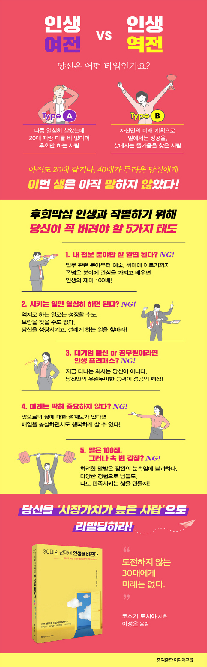 (¡¦) 30´ë°¡ Çϱ⿡ ¾ÆÁ÷ À̸¥ ÀÏ µûÀ§´Â ºñÁî´Ï½º ¼¼°è¿¡ Çϳªµµ ¾ø´Ù. ºÎÁ·ÇÑ °ÍÀº ³ªÀ̰¡ ¾Æ´Ï¶ó °æÇèÀÏ »ÓÀÌ´Ù. °æÇèÀº ÇൿÇÏÁö ¾ÊÀ¸¸é ¾òÀ» ¼ö ¾ø´Ù. ±×·¸±â¿¡ 30´ë¿¡´Â ¹«Á¶°ÇÀûÀÎ ÇൿÀÌ ÇÊ¿äÇÑ °ÍÀÌ´Ù. p. 36 Á¶±ÝÀº Èûµé¾î º¸ÀÌ´Â ¹®Á¦ ¾Õ¿¡¼ ±×³É ÁÖÀú¾É°Å³ª ¹°·¯¼Áö ¸»°í ÀÚ²Ù¸¸ ºÎµúÄ¡´Ù º¸¸é ±×·± °æÇèÀÌ ½×ÀÌ°Ô µÇ°í, »ý°¢º¸´Ù º°°Í ¾Æ´Ï¶ó´Â »ç½ÇÀ» ¾Ë°Ô µÈ´Ù. ±×·¯¸é ¾Æ¹«¸® Çè³ÇÑ µµÀüÀÌ¶óµµ ¿¹Àüó·³ ¼Ò½ÉÇÏ°Ô ¹°·¯¼Áö ¾Ê°Ô µÈ´Ù. (¡¦) °ÇÑ Á¤½Å·ÂÀº ½º½º·Î Ű¿ï ¼ö ÀÖ°í, ÀÚ±âÈ¿´É°¨ ¶ÇÇÑ ¾ó¸¶µçÁö Ȱ¹ßÇÏ°Ô ÀÛµ¿ÇÏ°Ô ¸¸µé ¼ö ÀÖ´Ù. °á·ÐÀº ¿ª½Ã µµÀüÀÌ´Ù. º® ¾Õ¿¡¼ ¿ì¿ÕÁÂ¿Õ ¸Ó¹µ°Å¸®Áö ¸»°í, °á°ú¸¦ ¹Ì¸® ¿¹´ÜÇÏÁöµµ ¸»°í, ÀÏ´Ü Àڱ⠾տ¡ ³õÀÎ ¼÷Á¦¿¡ °ú°¨ÇÏ°Ô µµÀüÇØ¶ó. ±× ¼ø°£ºÎÅÍ »îÀº ¹Ù²î±â ½ÃÀÛÇÑ´Ù. p. 151 »çȸÀÎÀÌ µÇ°í ³ª¼ ÁÙ°ð ÀÏ¿¡¸¸ ¸Å´Þ·Á¿Ô´ø 30´ë Áß¹ÝÀ̶ó¸é, ÀÌÁ¦ºÎÅÍ´Â ÀÚ½ÅÀÇ Ä¿¸®¾î¸¦ À§ÇØ ÀÚ±â ÅõÀÚ¸¦ ÇØ¾ß ÇÑ´Ù. ÀÚ±â ÅõÀÚ´Â ÀڰݽÃÇèÀ̳ª MBA µî Àϰú º´ÇàÇÒ ¼ö ÀÖ´Â °ÍÀÌ¸é ¹«¾ùÀ̵ç ÁÁ´Ù. ÀÌ·± ½ÄÀ¸·Î ȸ»ç»ýȰ»Ó¸¸ ¾Æ´Ï¶ó °³ÀÎÀûÀÎ »ýȰ¿¡µµ Ãæ½ÇÇÏ¸é¼ ¿ö¶ó¹ë(work and life balance)À» ½ÇõÇÏ´Â °ÍÀº ´ç½ÅÀ» ´õ¿í ¼ºÀåÇϵµ·Ï À̲ø¾îÁÙ °ÍÀÌ´Ù. p. 177 ´ç½ÅÀÌ »õ·Î¿î µµÀüÀ» ÇÏ¸é¼ Æ÷±âÇÏÁö ¾Ê°í °è¼Ó ¹ß¹öµÕÄ¡°í ÀÖ´Â ¸ð½ÀÀ» ´©±º°¡´Â ¹Ýµå½Ã ÁöÄѺ¸°í ÀÖ´Ù°í »ý°¢Ç϶ó°í ¸»ÀÌ´Ù. ´ç½ÅÀÌ µµ¿òÀ» ÇÊ¿ä·Î ÇÒ ¶§ Èû²¯ ¼ÕÀ» »¸¾îÁÖ´Â »ç¶÷Àº ¿·¿¡¼ ¿À·§µ¿¾È ÁöÄѺ¸°í ÀÀ¿øÇØÁØ Àο¬À¸·Î ´ç½Å ¾Õ¿¡ ³ªÅ¸³ª´Â °ÍÀÌ´Ù. ±×·¸±â¿¡ 30´ëÀÇ µµÀüÀº Ʋ¸²¾øÀÌ ¾ÕÀ¸·ÎÀÇ ´ç½ÅÀÇ »î¿¡¼ ´Ù½Ã¾øÀ» ¸¸³²À» ¸¸µé¾îÁÙ °Ô ºÐ¸íÇÏ´Ù. p. 208 ÃâÆÇ»ç ¼Æò30´ë, Àλý ¿ªÀüÀΰ¡ Àλý ¿©ÀüÀΰ¡?
