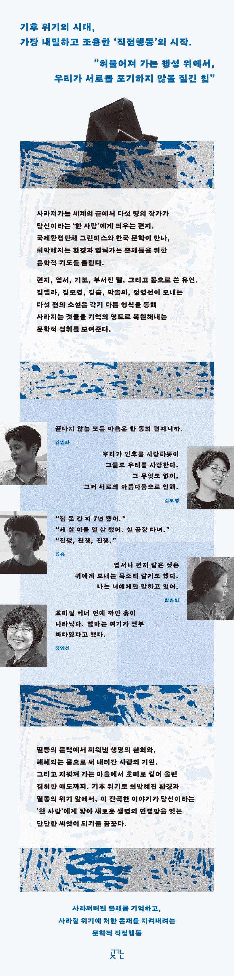 »ç¶óÁ®°¡´Â ¼¼°èÀÇ ³¡¿¡¼ ´Ù¼¸ ¸íÀÇ ÀÛ°¡°¡ ´ç½ÅÀ̶ó´Â ¡®ÇÑ »ç¶÷¡¯¿¡°Ô ÆíÁö¸¦ ¶ç¿î´Ù. ±¹Á¦È¯°æ´Üü ±×¸°Çǽº¿Í ÃâÆÇ»ç °÷°£ÀÌ Çѱ¹ ¹®Çаú ÇÔ²² Èñ¹ÚÇØÁö´Â ȯ°æ°ú ÀØÇô°¡´Â Á¸ÀçµéÀ» À§ÇÑ ¹®ÇÐÀû ±âµµ¸¦ ¿Ã¸°´Ù. ÆíÁö, ¿±¼, ±âµµ, ºÎ¼Áø ¸», ±×¸®°í À°Ã¼·Î ¾´ À¯¾ð. ±èº¸¿µ, ±è¸á¶ó, ±è¼û, ¹Ú¼Ö¸þ, Á¤¿µ¼±ÀÌ º¸³»´Â ´Ù¼¸ ÆíÀÇ ¼Ò¼³Àº °¢±â ´Ù¸¥ ¸ñ¼Ò¸®·Î »ç¶óÁ®¹ö¸° Á¸À縦 ±â¾ïÇÏ°í »ç¶óÁú À§±â¿¡ óÇÑ Á¸À縦 ÁöÄѳ»·Á´Â ¹®ÇÐÀû Á÷Á¢ÇൿÀÌ´Ù.