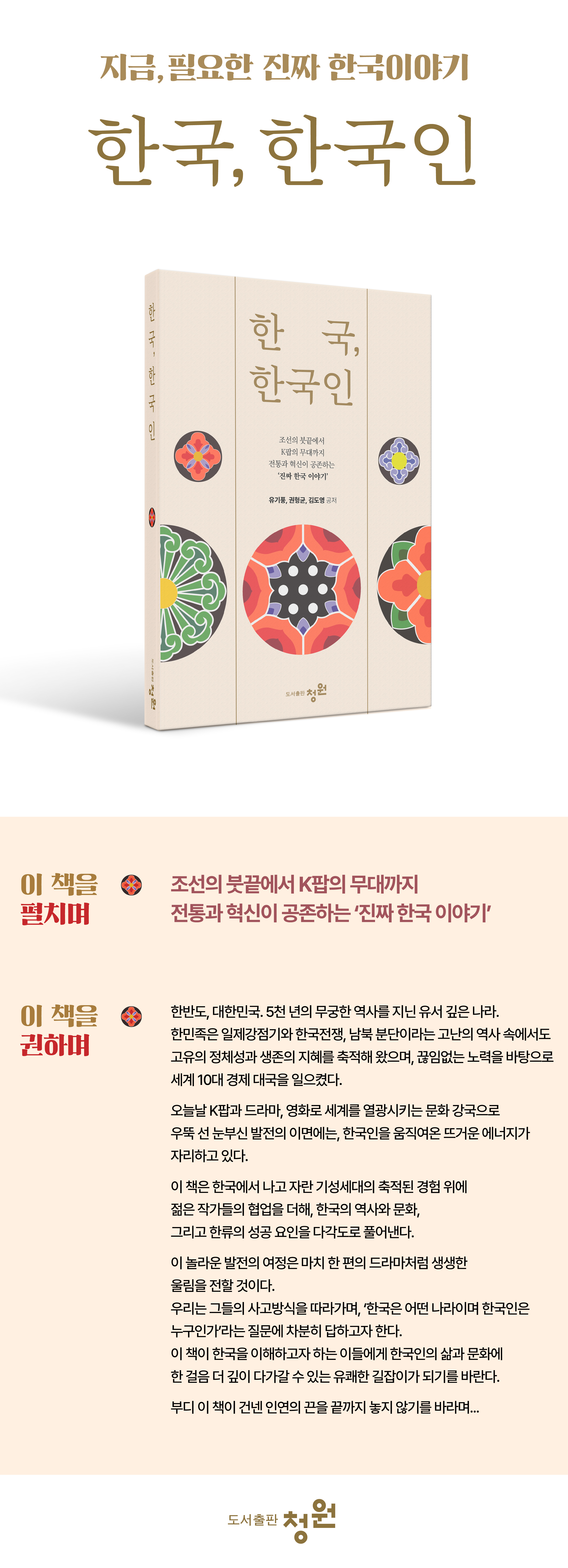 »ç¶÷Àº ¹«¾ùÀ¸·Î »ç¶÷À» ±â¾ïÇϴ°¡! À̸§ÀÌ ¾Æ´Ñ ¼û°á·Î, ¸»ÀÌ ¾Æ´Ñ ¸¶À½À¸·Î, ±×·¸°Ô ¿ì¸®´Â ´©±º°¡¸¦ ǰ°í, ¶Ç ´©±º°¡ÀÇ ±â¾ï ¼Ó¿¡ ¸Ó¹®´Ù. ¿©±â, ¹Ù´Ù¿Í »êÀÌ ºÎµå·´°Ô ¾î±ú¸¦ ³ª´©°í, »ç°èÀýÀÌ »ç¶÷ó·³ ¿ô°í ¿ì´Â ÇÑ ³ª¶ó°¡ ÀÖ´Ù. ÀÌ ¶¥¿¡¼ ÀÚ¶ó³ À̵é, Çѱ¹ÀÎÀ̶ó ºÒ¸®´Â »ç¶÷ µéÀº ¶§·Î´Â ¸»¾øÀÌ °ßµ®³»°í, ¶§·Î´Â ´«¹° À§¿¡ ¹Ì¼Ò¸¦ ¾ñ°í »ì¾Æ°£´Ù. ±×µéÀº ½±°Ô ¼Ó¸¶À½À» µå·¯³»Áö ¾Ê´Â´Ù. ±×·¯³ª ±× ´«ºû¿¡´Â ¸»º¸´Ù ÁøÇÑ À̾߱âµéÀÌ È帣°í, ±× ¼Õ³¡¿¡´Â ¿À·¡µÈ Á¤ÀÌ ±êµé¾î ÀÖ´Ù. ÀÚ½ÅÀÇ »óó´Â Á¶¿ëÈ÷ ǰ¿¡ °¨Ãá ä, ŸÀÎÀÇ ¾ÆÇÄ¿¡ µîÀ» µ¹¸®Áö ¾Æ´ÏÇϸç, µû¶æÇÑ ¹ä ÇÑ ³¢¿Í ¹ÌÁö±ÙÇÑ Â÷ ÇÑ ÀÜÀ¸·Î ¼¼»óÀ» °Ç³×´Â »ç¶÷µéÀÌ´Ù. Çѱ¹ÀÎÀÇ ¸¶À½Àº ºûÀ» ´à¾Ò´Ù. ¶§·Î´Â È帮°í, ¶§·Î´Â ´«ºÎ½Ã¸ç, ¾îµÒ ¼Ó¿¡¼µµ ½º½º·Î¸¦ ¹àÇô ´Ù¸¥ ÀÌ¿¡°Ô ±æÀÌ µÇ¾îÁØ´Ù. ÀÌ ¶¥, Çѱ¹À̶ó ºÒ¸®´Â °÷¿¡ ±×·± ¸¶À½µéÀÌ ¸ð¿© »ì¾Æ°£´Ù. »ç°èÀýÀÌ Âù¶õÈ÷ ¼øÈ¯ÇÏ´Â ³ª¶ó, ±× ¾È¿¡¼ Çѱ¹ÀÎÀº ´Ã, ±â¾ïÀ» ǰ°í ¹Ì·¡¸¦ ¹Ù¶óº¸¸ç »ì¾Æ¿Ô´Ù. ±×µéÀº °í´ÜÇÑ ³¯¿¡µµ ¼·Î¸¦ ÀØÁö ¾Ê¾Ò°í, ªÀº Àο¬¿¡µµ µû¶æÇÑ Á¤À» °Ç³ÞÀ¸¸ç, ÀÛÀº ¿ôÀ½ Çϳª·Î ÇϷ縦 ´Ù½Ã ÀÏÀ¸Ä×´Ù. ¼¼¿ùÀÇ ±ÁÀ̱ÁÀ̸¶´Ù ±×µéÀÇ ¼ÕÀº ¼·Î¸¦ ÇâÇß°í, ±× ¸¶À½Àº ´Ã, ÇÔ²²¿´´Ù. ÃâÆÇ»ç ¼ÆòÀÌ Ã¥Àº ¿ì¸®ÀÇ °ú°Å¿Í ÇöÀ縦 ´Ùä·Ó°Ô Á¶¸íÇÕ´Ï´Ù. Èñ¸Á°ú ¼ºÀåÀÇ ¿ª»ç, À½½Ä¿¡ ´ã±ä ¹®ÈÀÇ ±íÀÌ, ÀüÅë¿¡¼ ÇÑ·ù±îÁöÀÇ ¹®ÈÀû È帧, ±³À°¿¡ ´ëÇÑ ¿Á¤°ú ±× °á½Ç, ±¹Á¦»çȸ¿¡¼ÀÇ À§»ó, ÇÑ·ù¸¦ °¡´ÉÇÏ°Ô ÇÑ ¿ì¸®ÀÇ ÁøÁ¤¼º µî ÇÑ °³ÀÎÀÇ °üÁ¡¿¡ ¸Ó¹«¸£Áö ¾Ê°í ¿¹¼ú°¡µé°ú Àι®ÇÐ Àü¹®°¡µéÀÇ ´Ù¾çÇÑ °üÁ¡ÀÌ ¾î¿ì·¯Á® ÀÖ¾î, ÇØ¿Ü µ¶ÀÚµéÀÌ Áö·çÇÒ Æ´ ¾øÀÌ Çѱ¹ÀÇ ¸Å·ÂÀ» ÀÔüÀûÀ¸·Î ÀÐÀ» ¼ö ÀÖµµ·Ï ±¸¼ºµÇ¾î ÀÖ½À´Ï´Ù.