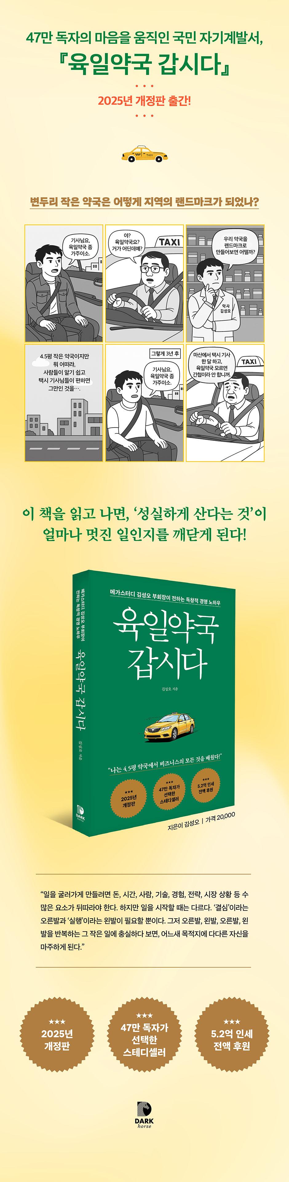 47¸¸ µ¶ÀÚÀÇ ¼±ÅÃÀ» ¹ÞÀº ½ºÅ׵𼿷¯ ¡ºÀ°ÀϾ౹ °©½Ã´Ù¡»°¡ 2025³â °³Á¤ÆÇÀ¸·Î µ¹¾Æ¿Ô´Ù. 2007³â Ãâ°£ ÀÌÈÄ, ´ëÇѹα¹ ¼Ò»ó°øÀΰú â¾÷Àڵ鿡°Ô ¡®ÇöÀå °æ¿µÀÇ ±³°ú¼¡¯·Î ÀÚ¸®¸Å±èÇØ ¿Â ÀÌ Ã¥Àº, È·ÁÇÑ ¸¶ÄÉÆÃÀ̳ª °ÅâÇÑ ÀÌ·Ð ¾øÀÌ ¿ÀÁ÷ ¡®»ç¶÷À» ³²±â´Â Àå»ç¡¯¶ó´Â öÇÐ Çϳª·Î º¯µÎ¸® ÀÛÀº ¾à±¹À» Áö¿ªÀÇ ·£µå¸¶Å©·Î ¼ºÀå½ÃŲ ÀúÀÚ ±è¼º¿ÀÀÇ »ì¾Æ ¼û ½¬´Â °æÇè´ãÀ» ´ã°í ÀÖ´Ù.