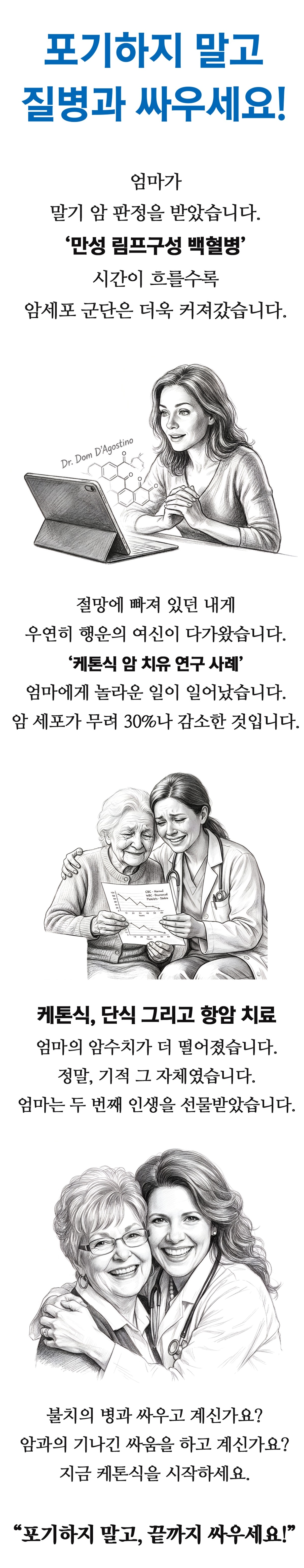 Ã¥¼ÓÀ¸·Î¿ì¿¬È÷ Çà¿îÀÌ Ã£¾Æ¿Ô½À´Ï´Ù. ¡®µ¼ ´Ù°í½ºÆ¼³ë¡¯ ¹Ú»ç´Â ¡´ÄÉÅæÀº ¾î¶»°Ô ¾ÏÀ» Ä¡À¯Çϴ°¡¡µ¶ó´Â ³î¶ó¿î ÁÖÁ¦·Î ¹æ¼ÛÀ» ÁøÇàÇß½À´Ï´Ù. ÄÉÅæÀ» ¸öÀÇ ¿¡³ÊÁö·Î Ȱ¿ëÇϸé È¿°úÀûÀ¸·Î ¾ÏÀÇ ¼ºÀåÀ» Á¦¾îÇÒ ¼ö ÀÖ´Ù°í ÁÖÀåÇß½À´Ï´Ù. ³î¶ó¿î ¸Þ½ÃÁö¿´½À´Ï´Ù. -- 21p ÄÉÅä½Ã½º »óÅ¿¡¼ ¹æ»ç¼± Ä¡·á¸¦ ¹Þ´Â ȯÀÚ´Â ÇÑ ¹ø¿¡ ³Ê¹« ¸¹Àº ¾Ï¼¼Æ÷¸¦ Á×ÀÏ À§ÇèÀÌ ÀÖ´Ù´Â °ÍÀÔ´Ï´Ù. ¾Ï¼¼Æ÷¸¦ ³Ê¹« ¸¹ÀÌ Á×ÀÌ´Â ºÎÀÛ¿ëÀÌ¿ä? ±×·± À§ÇèÀ̶ó¸é Àú´Â ±â²¨ÀÌ È¯ÀÚ¸¦ À§ÇØ ¼±ÅÃÇÒ °ÍÀÔ´Ï´Ù. ³Ê¹«³ª ¸ÚÁø À§Çè ¾Æ´Ñ°¡¿ä? -- 34p ÄÉÅä½Ã½º°¡ ´Ü¼øÇÑ Ã¼Áß °¨·® ½ÄÀÌ ¿ä¹ýÀ» ³Ñ¾î¼ ¿ì¸® ½Ã´ë¸¦ À§ÇùÇÏ´Â Áúº´, Áï ¾Ï, ´ç´¢º´, ¿ì¿ïÁõ ±×¸®°í Ä¡¸Å¸¦ Ä¡·áÇÏ´Â ÃÖ°íÀÇ Ä¡À¯ÀÚÀÔ´Ï´Ù. Àΰ£ÀÇ ¼öÇà ´É·Â°ú ȸº¹ ź·Â¼ºÀ» Çâ»ó½Ãŵ´Ï´Ù. ÄÉÅä½Ã½º´Â ³» ¸ö ÃÖ°íÀÇ ÀÇ»çÀÔ´Ï´Ù. -- 45p ¹Ýº¹µÇ´Â Ç÷´ç ½ºÆÄÀÌÅ©´Â ´ç½ÅÀÇ ¸ö¿¡ µæº¸´Ù ½ÇÀÌ ´õ ¸¹½À´Ï´Ù. ź¼öȹ° ´ë½Å Áö¹æÀ¸·Î ¸ö¿¡ ¿¬·á¸¦ °ø±ÞÇϼ¼¿ä. ´ç½ÅÀÇ ¸öÀº ¸çÄ¥ ³»¿¡ ź¼öȹ° ½Ã½ºÅÛ¿¡¼ Áö¹æ ½Ã½ºÅÛÀ¸·Î ÀüȯÇÒ °ÍÀÔ´Ï´Ù. Áö¹æÀ» Å¿ì´Â ¸öÀÌ µÇ´Â °ÍÀÔ´Ï´Ù. -- 62p ¡®ÄÉÅæ½Ä¡¯°ú ¡®°£ÇæÀû ´Ü½Ä¡¯À» Àû¿ëÇØ¼ ±³¸ð¼¼Æ÷Á¾ÀÇ Ä¡À¯ È¿°ú¸¦ ³ô¿´½À´Ï´Ù. Åä¸Ó½º »çÀÌÇÁ¸® ¹Ú»ç´Â ÄÉÅæ½ÄÀ» ÅëÇØ¼ ¡®¾ÏÀ» ±¾±â¶ó!¡¯°í Á¶¾ðÇϰí ÀÖ½À´Ï´Ù. ±â¾ïÇϼ¼¿ä. ¾ÏÀº ¡®Åº¼öȹ° Áßµ¶ÀÚ¡¯ÀÔ´Ï´Ù. -- 67p 9°³¿ùÀÌ Áö³ ÈÄ, µå¶ó¸¶Æ½ÇÑ º¯È°¡ ã¾Æ¿Ô½À´Ï´Ù. üÁßÀ» 18kg ÀÌ»ó °¨·®Çß°í, ³úÀÇ ³ªÀ̸¦ 40¼¼·Î µÇµ¹·È½À´Ï´Ù. ´Ù½Ã Àþ¾îÁø °ÍÀÔ´Ï´Ù. ±×´Â Á×À» ¶§±îÁö ÄÉÅæ½ÄÀ» Áö¼ÓÇÒ »ý°¢ÀÔ´Ï´Ù. ±× º¯ÈÀÇ °úÁ¤Àº °¨µ¿ÀûÀÎ °æÇèÀ̾ú½À´Ï´Ù. -- 84p Ç÷´ç ºÒ±ÕÇüÀ» ¹Ù·ÎÀâÀ¸¸é ½ÅÁø´ë»ç°¡ ¾ÈÁ¤À» ã½À´Ï´Ù. ´ë»ç°¡ ¾ÈÁ¤µÇ¸é ¸é¿ª ü°è°¡ ÁÁ¾ÆÁö¸ç, ÀÚ¿¬Ä¡À¯·ÂÀÌ ³ô¾ÆÁý´Ï´Ù. ź¼öȹ°À» Á¦ÇÑÇϸé ÄÉÅæ ¼öÄ¡°¡ ³ô¾ÆÁö´Âµ¥, ÄÉÅæÀº ¾ÏÀÇ ¼ºÀåÀ» ¸·´Â´Ù´Â ¿¬±¸°¡ Áö¼ÓÀûÀ¸·Î º¸°í µÇ°í ÀÖ½À´Ï´Ù. -- 100p ¡°¸¸¼º ¸²ÇÁ±¸¼º ¹éÇ÷º´Àº ½Ã°£ÀÌ Áö³¯¼ö·Ï È£ÀüµÇÁö ¾Ê½À´Ï´Ù. ±×·±µ¥ ¸»ÀÔ´Ï´Ù. Áö±ÝÀº ¾Ï¼¼Æ÷ ¼öÄ¡°¡ ÀüÇô Áõ°¡ÇÏÁö ¾Ê¾Ò½À´Ï´Ù. µµ¸®¾î 30%³ª °¨¼ÒÇß½À´Ï´Ù. ÀÌ·± ÀÏÀº Àý´ë ÀϾÁö ¾Ê½À´Ï´Ù. ´ëü 6ÁÖ µ¿¾È ¹«½¼ ÀÏÀÌ ÀÖ¾ú´ø °Ì´Ï±î?¡± -- 104p ¾ö¸¶°¡ ÄÉÅæ ¿©ÇàÀ» ½ÃÀÛÇÑ Áö 7°³¿ùÀÌ Áö³µ½À´Ï´Ù. ¾ö¸¶´Â 5¿ùÀÇ ¾Æ¸§´Ù¿î ½ÅºÎó·³ ±¤Ã¤·Î ºû³µ½À´Ï´Ù. ±×³àÀÇ ¿¡³ÊÁö´Â ¿ì¸® °¡Á·À» ³î¶ó°Ô Çß½À´Ï´Ù. Á¦°¡ ½Ê ´ë ¶§ ±â¾ïÇÏ´Â ¿Á¤ÀûÀÎ ¿©ÀÎÀÇ Ç¥Á¤À» Áþ°í ÀÖ¾ú½À´Ï´Ù. ±×³à´Â ºûÀÌ ³µ½À´Ï´Ù. -- 150p ±×³à´Â ºû³ª´Â ÇÇºÎ¿Í ÀÒ¾î¹ö¸° Ȱ±â¸¦ µÇã¾Ò½À´Ï´Ù. °¡Àå Ä¿´Ù¶õ ½Â¸®´Â ±×³à°¡ ÄÉÅæ½ÄÀ» ÅëÇØ¼ °Ç°ÇÑ ½ÅÁø´ë»ç¸¦ µÇµ¹·È´Ù´Â °ÍÀÔ´Ï´Ù. ¡®¼º°øÀÇ ºñ°áÀÌ ¹«¾ùÀ̳Ä?¡¯´Â Áú¹®¿¡ ±×³à´Â ¡®¸ÅÀÏ ÄÉÅæÀ» Å×½ºÆ®ÇÏ´Â °Í¡¯À̶ó°í ´äÇß½À´Ï´Ù. -- 180p ÁÖ·ù ÀÇÇÐÀº ¸¸¼º Áúȯ Ä¡·á¿Í ¿¹¹æ¿¡¼ ¿Ã¹Ù¸¥ ÇØ¹ýÀ» Á¦½ÃÇÏÁö ¸øÇϰí ÀÖ½À´Ï´Ù. ¾à¹°ÀÇ, ¾à¹°À» À§ÇÑ, ¾à¹°¿¡ ÀÇÇÑ Ä¡·á°¡ °úµµÇÏ°Ô ¹ü¶÷Çϰí ÀÖ½À´Ï´Ù. ¸¸¼º ÁúȯÀÇ ÁøÁ¤ÇÑ Ä¡À¯´Â ¾à¹°¿¡ ÀÇÇØ¼°¡ ¾Æ´Ï¶ó ¶óÀÌÇÁ ½ºÅ¸ÀÏÀÇ º¯È·Î¸¸ °¡´ÉÇÕ´Ï´Ù. -- 224p ´Ü½ÄÀº ¿ÀÅäÆÄÁö¸¦ ÅëÇØ¼ ´ç½ÅÀÇ ¸ö¿¡ ÃÖ»óÀÇ ±âȸ¸¦ Á¦°øÇÕ´Ï´Ù. ÄÉÅæ½ÄÀº ź¼öȹ° ½Ä´Üº¸´Ù ´Ü½Ä ÀüȯÀ» ºü¸£°Ô ±×¸®°í ¿ëÀÌÇÏ°Ô ÇÕ´Ï´Ù. ÄÉÅæ½ÄÀº ¡®¸Ô´Â ´Ü½Ä¡¯eating fastingÀ̶ó°í ¸»ÇÒ ¼ö ÀÖ½À´Ï´Ù. -- 213p ³î¶óÁö ¸¶¼¼¿ä. ¾Ï¼¼Æ÷ ¼öÄ¡°¡ ÁÙ¾îµé¾ú´ø °ÍÀÔ´Ï´Ù. Ç×¾ÏÁ¦´Â 10³â°£ ¼ºÀåÇÑ ¾Ï¼¼Æ÷¸¦ ´Ü 5ÀÏ ¸¸¿¡ ´ëºÎºÐ ³ì¿© ¹ö·È½À´Ï´Ù! ¹ÏÀ» ¼ö°¡ ¾ø¾ú½À´Ï´Ù. ³ªµµ ¸ð¸£°Ô ´«¹°ÀÌ »´À¸·Î Èê·¯³»·È½À´Ï´Ù. Á¦ ¸Ó¸´¼Ó¿¡ ÇÑ ´Ü¾î°¡ ¶°¿Ã¶ú½À´Ï´Ù. ¡°±âÀû!¡± -- 224p ÄÉÅæ½ÄÀ» ½ÃÀÛÇϼ¼¿ä. ±×¸®°í °è¼Ó ³ª¾Æ°¡¼¼¿ä. ´ç½ÅÀº º¯ÈµÈ ÀÚ½ÅÀ» ¸¸³¯ °ÍÀÔ´Ï´Ù. ÁøÁ¤ÇÑ °Ç°Àº º´¿øÀÌ ¾Æ´Ï¶ó ´ç½ÅÀÇ Áֹ濡¼ ½ÃÀÛµÊÀ» ¸í½ÉÇϼ¼¿ä. ·ÎÁî ÇÒ¸Ó´Ï´Â ¿ÜĨ´Ï´Ù! ¡°Æ÷±âÇÏÁö ¸»°í, ³¡±îÁö ½Î¿ì¼¼¿ä! Æò»ý ÄÉÅä½Ã½º!¡± -- 300p |