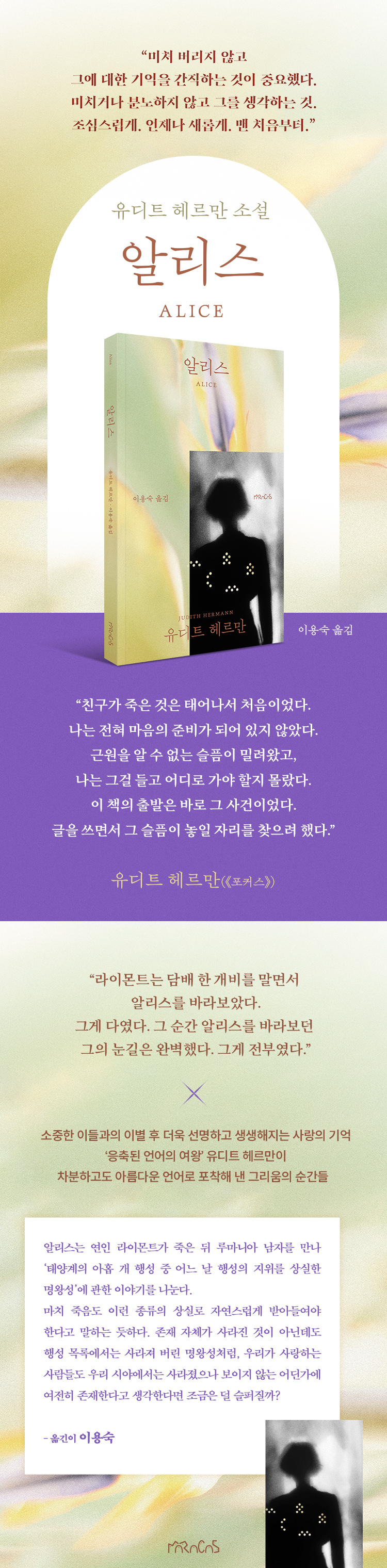 Ç츣¸¸Àº Ãâ°£ ÈÄ µ¶ÀÏ ½Ã»ç ÁÖ°£Áö ¡¶Æ÷Ä¿½º¡·¿¡¼ ¡º¾Ë¸®½º¡»°¡ ¡°Á×Àº »ç¶÷µé¿¡ ´ëÇÑ À̾߱â¶ó±âº¸´Ù ³²Àº »ç¶÷µé¿¡ ´ëÇÑ À̾߱⡱¶ó°í ¸»Çß´Ù. ±×·¡¼Àϱî. ½ÃÁ¾Àϰü À̺°°ú Á×À½, ¿µ¿øÇÑ ´ÜÀýÀ» ±×·Á³»°í ÀÖÁö¸¸ ÀÌ À̾߱âµéÀ» µû¶ó Àо´Ù º¸¸é µ¶ÀÚµéÀº »ì¾Æ°¨, ¿¬°á, Èñ¸Á¿¡ °üÇØ ´õ ¸¹ÀÌ »ý°¢ÇÏ°Ô µÈ´Ù. ¾Æºü°¡ Á׾´Â ½Ã°£¿¡ ¾ÆÀÌ´Â °ÉÀ½¸¶¸¦ ¹è¿ì°í, »ïÃÌÀÌ Á×Àº ¹Ù·Î ±×´ÙÀ½ ´Þ¿¡ ¡®¾îµÒ¿¡ ³»·Á¿Â ºûÀ¸·Î¼¡¯ ¾Ë¸®½º°¡ žÙ. ´©±º°¡´Â Á×°í ´©±º°¡´Â žÙ. ¡®ÀÌ ¸ðµç »óȲ¿¡µµ ºÒ±¸Çϰí. ¾Æ´Ï¸é ¹Ù·Î ±× ¶§¹®¿¡.¡¯(¡¸¹ÌÇ᡹)