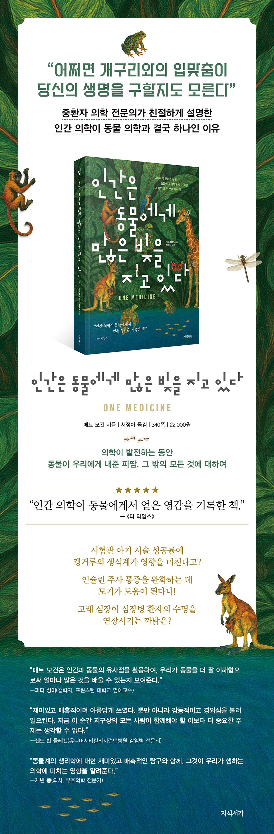 ÀúÀÚ´Â µ¿¹°ÇÐÀÌ Àΰ£ ÀÇÇп¡ ¸¹Àº ¿µÇâÀ» ¹ÌÃÄ¿ÔÀ½À» °Á¶ÇÑ´Ù. Àΰ£Àº ¿µÀå·ù¿Í ¸¹Àº DNA¸¦ °øÀ¯Çϰí ÀÖÀ» »Ó ¾Æ´Ï¶ó, ÃÖÃÊÀÇ µÅÁö ½ÉÀå ¿ª½Ã Àΰ£¿¡°Ô À̽ĵǾú´Ù. ±× ¿Ü¿¡µµ ¿ì¸®´Â µ¿¹° ¼¼°è¿¡¼ ÈξÀ ´õ ¸¹Àº °ÍÀ» ¹è¿ü´Ù. Ä»°Å·ç ¾ÏÄÆÀÌ °¡Áø 3°³ÀÇ ÁúÀ» ¿¬±¸ÇÑ °á°ú ü¿Ü¼öÁ¤ ¼º°ø·üÀÌ Çâ»óµÇ¾ú°í, ±â¸°ÀÌ ¼û ½¬´Â ¹ýÀ» °üÂûÇØ õ½ÄÀ¸·Î °íÅë¹Þ´Â »ç¶÷ÀÇ »ý¸íÀ» ±¸ÇÒ ¼ö ÀÖ¾ú´Ù. ºÏ±Ø±Ç¿¡ »ç´Â »õµéÀÌ ¾ó¾î Á×Áö ¾Ê´Â ÀÌÀ¯¸¦ ¿¬±¸ÇØ Àúü¿ÂÁõ Ä¡·á¸¦ ¹ßÀü½ÃÄ×´Ù. ¶ÇÇÑ 150ų·Î±×·¥ÀÇ È¤µî°í·¡ ½ÉÀå¿¡ ½ÉÀüµµ¸¦ ÃøÁ¤ÇÑ °ÍÀº ½ÉºÎÀü ȯÀÚÀÇ ¼ö¸íÀ» ´Ã¸®´Â µ¥ Áß¿äÇÑ ¿ªÇÒÀ» Çß´Ù.