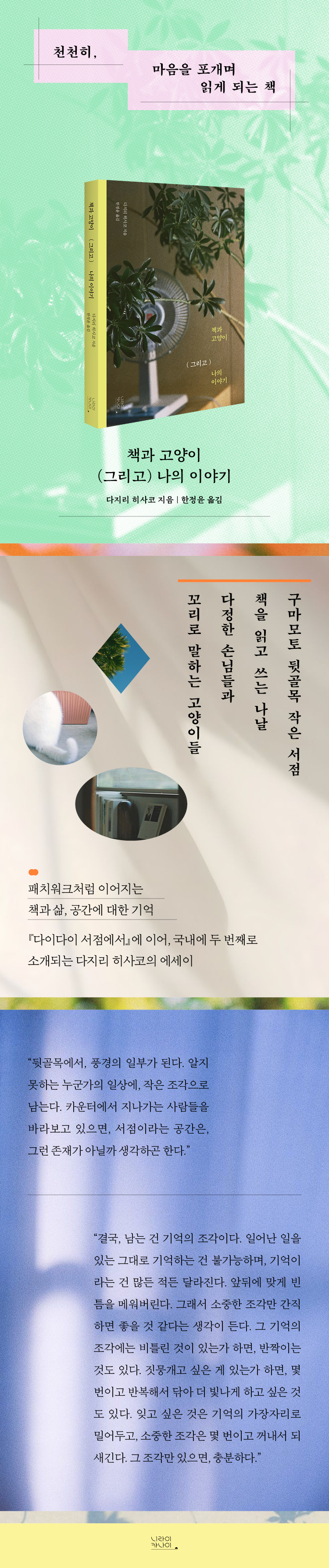 ¡ºÃ¥°ú °í¾çÀÌ (±×¸®°í) ³ªÀÇ À̾߱⡻´Â ±×·± ¸¸³²ÀÌ ÀÌ·ç¾îÁö´Â Àå¼Ò·Î¼ÀÇ ¼Á¡À», ±×¸®°í ±× ¼Ó¿¡ ¾ôÈù Å©°í ÀÛÀº ±â¾ïÀ» ¼¶¼¼ÇÏ°Ô ±×·Á³½ Ã¥ÀÌ´Ù. Ã¥ÀåÀ» ³Ñ±â´Ù º¸¸é ¾î´À»õ ±¸¸¶¸ðÅä µÞ°ñ¸ñ ³¸¼± µí Ä£±ÙÇÑ ¼Á¡ÀÇ ¹®À» Á¶½É½º·¹ ¿°í µé¾î°£ µíÇÑ ±âºÐÀÌ µé °ÍÀÌ´Ù. ±×¸®°í ±× ¾È¿¡¼, ³ª¸¸ÀÇ ¡®Ã¥°ú °í¾çÀÌ, ±×¸®°í ³ªÀÇ À̾߱⡯¸¦ ¶°¿Ã¸®°Ô µÉ °ÍÀÌ´Ù.