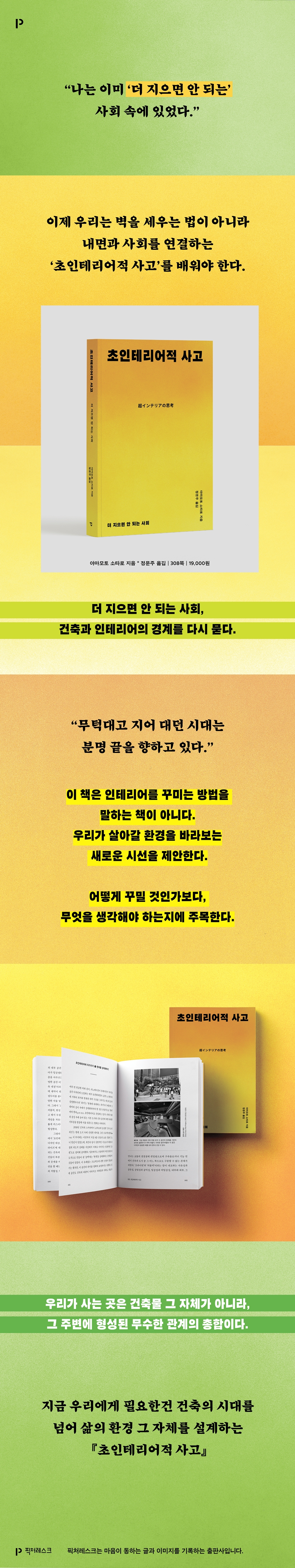 ¡´22p, ¡®´õ ÁöÀ¸¸é ¾È µÇ´Â¡¯ »çȸ·ÎÀÇ º¯È Áß¿¡¼¡µ Áö±ÝÀÇ »çȸ´Â ¸ðµç »ç¹°°ú »ç¶÷ÀÇ ÇൿÀÌ º¸Å뼺À» ¹þ¾î³ª¼´Â ¾È µÈ´Ù°í ±ÔÁ¤ÇÏ´Â °æÇâÀÌ °ÇÏ´Ù. °ÇÃà°ú °ø°£ µðÀÚÀο¡µµ ÀÌ·¯ÇÑ ¿ä±¸¿¡ ÀÀÇÏ´Â Å« È帧ÀÌ ³ªÅ¸³ª°í ÀÖ´Ù. ¸®³ëº£ÀÌ¼Ç ºÕÀÌ ºÒ·¯¿Â µðÀÚÀÎ °¨¼ºÀÌ °ª½Î°í °¡°øÇÏ±â ÆíÇÑ ¸ñÀçÀÇ ÀÌ¿ëÀ̳ª ¿À·¡µÈ ¼¹ÎÁÖÅÃdz ÀÎÅ׸®¾îÀÇ ³²¹ß µî ±â¼º °¡Ä¡°üÀ» Àç»ý»êÇϱ⸸ ÇÏ´Â »óȲ¿¡ ºüÁöÁö ¾Ê°Ô ÇÏ·Á¸é, ¿ì¸®¿¡°Ô´Â ÀÌÁ¦ ¾î¶² º¸Å뼺ÀÌ ÇÊ¿äÇÑ °É±î? À̰ÍÀÌ ÀÌ ½Ã´ëÀÇ ¼÷Á¦´Ù ¡´26p, º¸Å뼺ÀÇ ¹Ý°Ý Áß¿¡¼¡µ ½ÇÁ¦·Î ¿ì¸®¿¡°Ô ȯ°æÀ̶õ ¾Õ¼ ¾ð±ÞÇßµíÀÌ °ÇÃàÀÌ ±×¸®´Â °æ°è¼±¸¸À¸·Î ±¸È¹µÇÁö´Â ¾Ê´Â´Ù. ±× °æ°è¼±ÀÇ Èçµé¸²À» °üÃøÇϰí, Àڱ⠻îÀÇ ±â¹ÝÀ» ÀÌ·ç´Â °ø°£ÀÇ ¸ð½ÀÀ» ¶°¿Ã¸®·Á¸é, °¡Àå ¸ÕÀú ¡®¿ì¸®´Â °ÇÃ๰¿¡ »ç´Â °ÍÀÌ ¾Æ´Ï´Ù¡¯¶ó´Â ÀνÄÀÌ ÀÖ¾î¾ß ÇÑ´Ù. ¡®Àηù´Â Áö±¸¿¡ »ê´Ù¡¯¶ó°í ÇÏ¸é ´ç¿¬ÇÑ »ç½Ç·Î ´À²¸Áú ¼ö ÀÖÁö¸¸, ½ÇÁ¦·Î »ç¶÷Àº Áö±¸¶ó´Â ¹°Ã¼ ¼Ó¿¡ »ç´Â °ÍÀÌ ¾Æ´Ï¶ó, ±× ÁÖÀ§¸¦ ¾ã°Ô µÚµ¤°í ÀÖ´Â ´ë±â±Ç ¼Ó¿¡ »ê´Ù. °ÇÃ൵ ¸¶Âù°¡Áö´Ù. ¡®°ÇÃ๰¿¡ »ê´Ù¡¯¶ó´Â Àǹ̴ ¿ì¸®°¡ °ÇÃ๰ ÁÖÀ§¿¡ Çü¼ºµÈ °ø°£, »ç¹°, ½Ã°£, Çö»óÀ̶ó´Â ¿ä¼Ò ¾È¿¡ »ê´Ù´Â Àǹ̴Ù. ±× ¿µ¿ªÀ» ¿©±â¼´Â ¡®°ÇÃàÀÇ ´ë±â±Ç¡¯À̶ó ºÎ¸£±â·Î ÇÑ´Ù. ¡´30p, ¡®°ÇÃàÀÇ ´ë±â±Ç¡¯ ¾È¿¡¼ ÃÊÀÎÅ׸®¾î ´À³¢±â Áß¿¡¼¡µ °ú°ÅÀÇ º¸Á¸ÀÌ ¹Ýµå½Ã Çâ¼ö¸¦ ºÒ·¯ÀÏÀ¸Å°´Â °ÍÀº ¾Æ´Ï¶ó´Â »ç½ÇÀ» º¸¿© ÁØ´Ù. ÀÌ·¯ÇÑ Çö»óÀº ½Ã°£¿¡ ´ëÇÑ ¿ì¸®ÀÇ Àνİúµµ °ü·ÃÀÌ ÀÖ´Â µíÇÏ´Ù. Çâ¼ö´Â ½Ã°£¿¡ ´ëÇÑ ÀÚ°¢ ¾øÀÌ´Â ¼º¸³ÇÒ ¼ö ¾øÀ¸¸ç, ¿ì¸®´Â ¾ðÁ¦³ª ÇöÀ縦 ±âÁØÀ¸·Î ½Ã°£À» ÀνÄÇÑ´Ù. Áï, Çâ¼ö¸¦ ºÒ·¯ÀÏÀ¸Å°´Â °ÍÀº ´Ü¼øÇÑ °ú°Å°¡ ¾Æ´Ï¶ó ÇöÀç ¼Ó¿¡ ³»ÀçÇϸç ÇöÀ縦 ±¸¼ºÇÏ´Â °ú°Å¶ó´Â ¸»ÀÌ´Ù. ½ÇÁ¦·Î »ì¾Æ º» Àû ¾ø´Â Ãʰ¡, ÀÚ½ÅÀÌ Å¾Áöµµ ¾ÊÀº ½Ã´ëÀÇ ¹°°Ç, ±â´ÉÀ̳ª Çü»óÀ» »ó½ÇÇÑ ÆóÇ㠵 Çâ¼ö¸¦ ´À³¢±âµµ ÇÑ´Ù. ÀÌ´Â ±×°ÍµéÀÌ ÀÒ¾î¹ö¸° °ú°ÅÀÇ Áõ°Å·Î¼ ÇöÀ縦 ºñÆòÇϰųª ¶§·Î´Â ºÎÁ¤Çϱ⠶§¹®ÀÌ´Ù. ¡´140p, ³°Àº °Ç¹°¿¡´Â ¿Ö °Å½º¸£±â Èûµç ¸Å·ÂÀÌ ÀÖÀ»±î? - Çâ¼öÀÇ ¿øÃµ Áß¡µ±×·¸°Ô ²¿Áý°í ½ÍÀ» ¸¸Å, ÀϺ»ÀÇ µµ½Ã´Â ¸®¾ó¶óÀÌÁîÀÇ Á¦ÀÚ¸®°ÉÀ½ÀÌ ¸¸µé¾î ³½ »ç¹«¿ë ºôµù°ú ÁÖÅÃÀÌ ¸Þ¿ì°í ÀÖ´Ù. ÀÌ·± dz°æÀ» º¸¸é, ¸¶Ä¡ »çȸ°¡ ¸®¾ó¶óÀÌÁîÀÇ Á¦ÀÚ¸®°ÉÀ½À» °·ÂÈ÷ ¿øÇÏ´Â °Í °°±âµµ ÇÏ´Ù. ¾Æ¸¶µµ Çö´ë ÀϺ» »çȸ¸¦ µÚµ¤°í ÀÖ´Â ÇÁ·Î±×·¡¹Ö ¾÷µ¥ÀÌÆ®¿¡ ´ëÇÑ ¸Á¼³ÀÓ ¶§¹®Àº ¾Æ´Ò±î? ÀÌ´Â »ç¶÷µéÀÌ ÇöÀç »çȸ¿¡¼´Â Ä¿¹Â´ÏÄÉÀ̼ÇÀ» ±â´ëÇÒ ¼ö ¾ø´Ù°í óÀ½ºÎÅÍ Àý¸ÁÇϱ⠶§¹®ÀÏÁöµµ ¸ð¸¥´Ù. Ä¿¹Â´ÏÄÉÀ̼ÇÀ̶õ »çȸÀû ³íÀǸ¦ °ÅÃÄ »õ·Î¿î °¡Ä¡¸¦ ȹµæÇÏ´Â µ¥ ÇÕÀÇÇÏ´Â °úÁ¤ÀÌ´Ù. Ä¿¹Â´ÏÄÉÀ̼ÇÀÌ ¿øÈ°ÇÏÁö ¾ÊÀ¸¸é ÇÁ·Î±×·¡¹Ö¿¡ ´ëÇÑ Çǵå¹é ¿ª½Ã ±â´ëÇÒ ¼ö ¾ø´Ù. ¡´204p, AI¿Í 3D ÇÁ¸°ÅÍ·Î °ø°£À» ÀÚµ¿ »ý¼ºÇÒ ¼ö ÀÖÀ»±î? Áß¿¡¼¡µ ¡ºÃÊÀÎÅ׸®¾îÀû »ç°í¡»´Â ¾ÖÃʺÎÅÍ ÀÎÅ׸®¾î ¼ÀûÀ¸·Î ±¸»óÇÑ °ÍÀº ¾Æ´Ï¾ú´Ù. °ÇÃàÀÇ ´ë±â±ÇÀ» °í¹ÎÇϸç, °ÇÃà°¡·Î¼ ¼³°è ¾÷¹«¸¦ ¼öÇàÇÏ°í °ÇÃà°èÀÇ »óȲÀ» °ËÁõÇÏ´Â °¡¿îµ¥, Áö±Ý ³»°¡ ¼³°èÇϰí ÀÖ´Â °Í, Áö±Ý ³ª¸¦ µÑ·¯½Î°í ÀÖ´Â °ø°£ÀÇ À̹ÌÁö°¡ ¡®°ÇÃ࡯ÀÌ ¾Æ´Ï¶ó ¡®ÀÎÅ׸®¾î¡¯¿¡ °¡±õ´Ù´Â °ÍÀ» ±ú´Þ¾Ò´Ù. »ç½Ç ¾î´À»õ ³» ¼³°è»ç¹«¼ÒÀÇ ÀÛ¾÷µµ Àý¹Ý ÀÌ»óÀÌ ¸®³ëº£À̼ǰú ÀÎÅ׸®¾î·Î ¹Ù²î¾î ÀÖ¾ú°í, ³ª´Â ÀÌ¹Ì ¡®´õ ÁöÀ¸¸é ¾È µÇ´Â¡¯ »çȸ ¼Ó¿¡ ³õ¿© ÀÖ¾ú´Ù. ¡´296p, ¿¡ÇÊ·Î±× Áß¡µ ÃâÆÇ»ç ¼Æò¿ì¸®´Â ¿À·§µ¿¾È °ø°£À» À§°è·Î ÀÌÇØÇØ ¿Ô´Ù. µµ½Ã´Â ¿ÜºÎ ȯ°æ, °ÇÃàÀº Ʋ, ÀÎÅ׸®¾î´Â ±× ³»ºÎ¸¦ ä¿ì´Â Àå½ÄÀ̶ó´Â °íÁ¤°ü³äÀÌ ¿ì¸®¸¦ Áö¹èÇß´Ù. ±×·¯³ª ½º¸¶Æ®Æù°ú Á¤º¸¸ÁÀÌ ÀÏ»óÀÌ µÈ ¿À´Ã³¯, ¿ì¸®°¡ ü°¨Çϴ ȯ°æÀº ƯÁ¤ Àå¼ÒÀÇ °æ°è¿¡ ¸Ó¹°Áö ¾Ê´Â´Ù. ÀÌÁ¦ °ø°£Àº ¹°¸®Àû º®ÀÌ ¾Æ´Ï¶ó »ç¹°°ú Á¤º¸, ÇàÀ§°¡ ¾ôÇô Çü¼ºµÇ´Â ÇϳªÀÇ ¡®Àå(íÞ)¡¯ÀÌ´Ù.