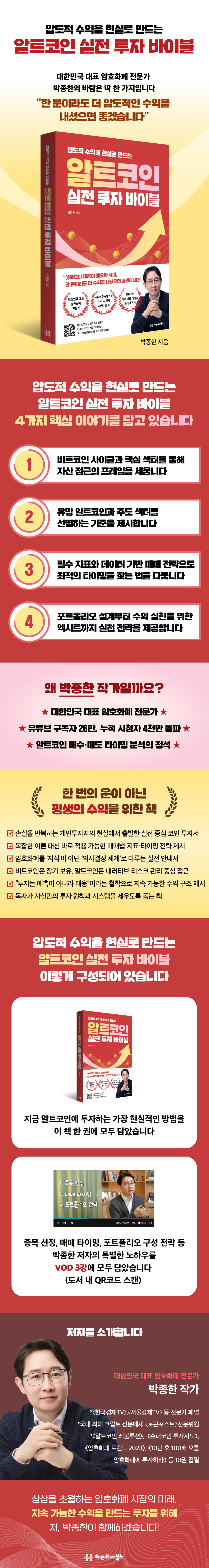 ±¸¼ºÀº 4ºÎ·Î ÀÌ·ç¾îÁ® ÀÖÀ¸¸ç, 1ºÎ´Â ºñÆ®ÄÚÀÎ »çÀÌŬ°ú ÇÙ½É ¼½Å͸¦ ÅëÇØ ÀÚ»ê Á¢±ÙÀÇ ÇÁ·¹ÀÓÀ» ¼¼¿ì°í, 2ºÎ´Â À¯¸Á ¾ËÆ®ÄÚÀΰú ÁÖµµ ¼½Å͸¦ ¼±º°ÇÏ´Â ±âÁØÀ» Á¦½ÃÇϸç, 3ºÎ´Â Çʼö ÁöÇ¥¿Í µ¥ÀÌÅÍ ±â¹Ý ¸Å¸Å Àü·«À¸·Î ÃÖÀûÀÇ Å¸À̹ÖÀ» ã´Â ¹ýÀ» ´Ù·ç°í, 4ºÎ´Â Æ÷Æ®Æú¸®¿À ¼³°èºÎÅÍ ¼öÀÍ ½ÇÇöÀ» À§ÇÑ ¿¢½ÃÆ®±îÁö ½Çõ Àü·«À» Á¦°øÇÑ´Ù. Ãʺ¸ÀÚ´Â 1¡¤2ºÎÀÇ ±âº» ¿øÄ¢ºÎÅÍ, °æÇèÀÚ´Â 3¡¤4ºÎÀÇ ½ÇÀü Àü·«ºÎÅÍ Àо µÇ°í, ÇÊ¿äÇÑ ÆÄÆ®¸¦ ¹Ýº¹ÇØ Âü°íÇÒ¼ö·Ï ¾ÐµµÀû ¼öÀÍÀ» Çö½Ç·Î ¸¸µå´Â ¡¶¾ËÆ®ÄÚÀÎ ½ÇÀü ÅõÀÚ ¹ÙÀÌºí¡·ÀÌ ½ÇÁúÀûÀÎ ÅõÀÚ ¹«±â·Î °¡´ÉÇϵµ·Ï ¼³°èµÇ¾ú´Ù.