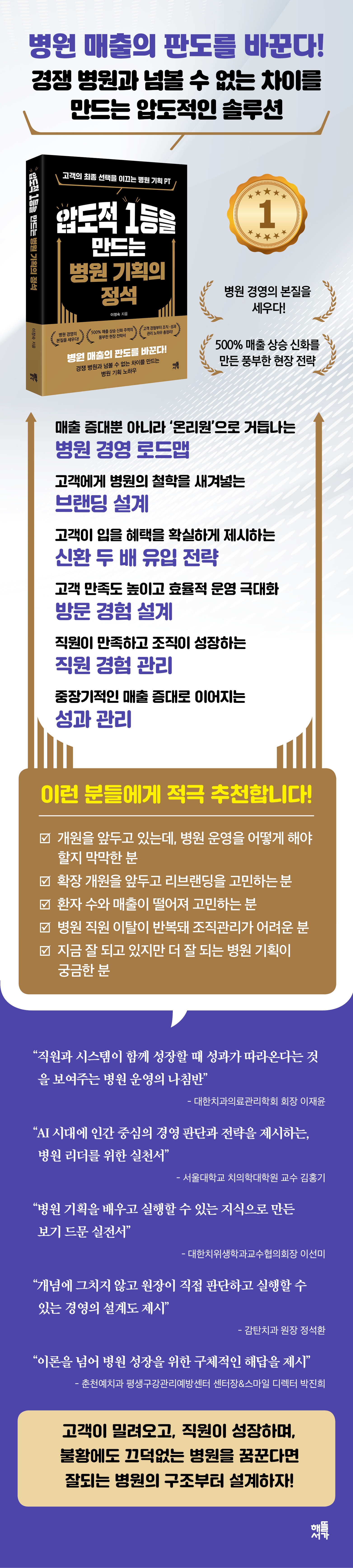 ÀúÀÚ´Â º´¿ø Á¶Á÷°ú °æ¿µÀ» ¿¬±¸ÇÏ°í ¼³°èÇØ ¿Â º´¿ø±âȹ Àü¹®°¡·Î¼ Ä¡°ú, ÇǺΰú, ¼ºÇü¿Ü°ú, Çѹ溴¿ø±îÁö ´Ù¾çÇÑ Áø·á°úÀÇ ÄÁ¼³ÆÃÀ» ¼öÇàÇϸç, ¸ÅÃâ Á¤Ã¼¿Í »ó´ã ºÎÁø, Á÷¿ø ÀÌÅ» µî º´¿øÀÌ ¹Ýº¹Çؼ °Þ´Â ¹®Á¦¸¦ ±âȹ°ú ±¸Á¶·Î ÇØ°áÇØ ¿Ô´Ù. ±×¿Í ÇÔ²²ÇÑ º´¿øµéÀº °³¿ø ÃʱâºÎÅÍ È®Àå ´Ü°è±îÁö ²ÙÁØÇÑ ¼ºÀå ´Ü°è¸¦ °ÅÃÄ Áö¿ªº°, ºÐ¾ßº° 1µî º´¿øÀ¸·Î ºÒ¸®°í ÀÖ´Ù. Á¶Á÷°ú ¿ªÇÒ, ÀÇ»ç°áÁ¤ ±¸Á¶¸¦ Àü¸é Àç¼³°èÇØ ¸ÅÃâÀÌ ÃÖ´ë 5¹è±îÁö ¼ºÀåÇÑ º´¿ø »ç·Êµµ ÀÖ´Ù.