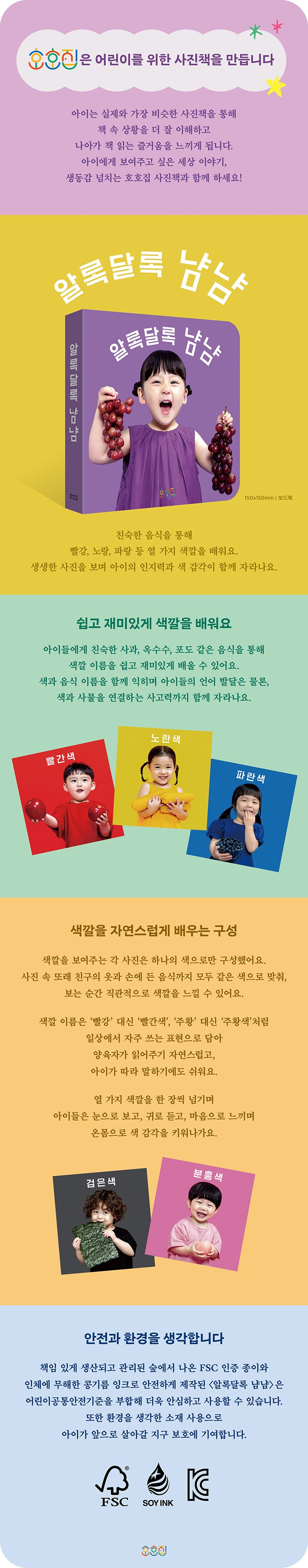»ö±òÀ» º¸¿©ÁÖ´Â °¢ »çÁøÀº ÇϳªÀÇ »öÀ¸·Î¸¸ ±¸¼ºÇß¾î¿ä. »çÁø ¼Ó ¶Ç·¡ Ä£±¸ÀÇ ¿Ê°ú ¼Õ¿¡ µç À½½Ä±îÁö ¸ðµÎ °°Àº »öÀ¸·Î ¸ÂÃç, º¸´Â ¼ø°£ Á÷°üÀûÀ¸·Î »ö±òÀ» ´À³¥ ¼ö ÀÖ¾î¿ä. »ö±ò À̸§Àº ¡®»¡°¡¯ ´ë½Å ¡®»¡°£»ö¡¯, ¡®ÁÖȲ¡¯ ´ë½Å ¡®ÁÖȲ»ö¡¯Ã³·³ Àϻ󿡼 ÀÚÁÖ ¾²´Â Ç¥ÇöÀ¸·Î ´ã¾Æ ¾çÀ°ÀÚ°¡ ÀоîÁÖ±â ÀÚ¿¬½º·´°í, ¾ÆÀ̰¡ µû¶ó ¸»Çϱ⿡µµ ½¬¿ö¿ä. ¿ °¡Áö »ö±òÀ» ÇÑ À徿 ³Ñ±â¸ç ¾ÆÀ̵éÀº ´«À¸·Î º¸°í, ±Í·Î µè°í, ¸¶À½À¸·Î ´À³¢¸ç ¿Â¸öÀ¸·Î »ö °¨°¢À» Ű¿ö³ª°¡¿ä.