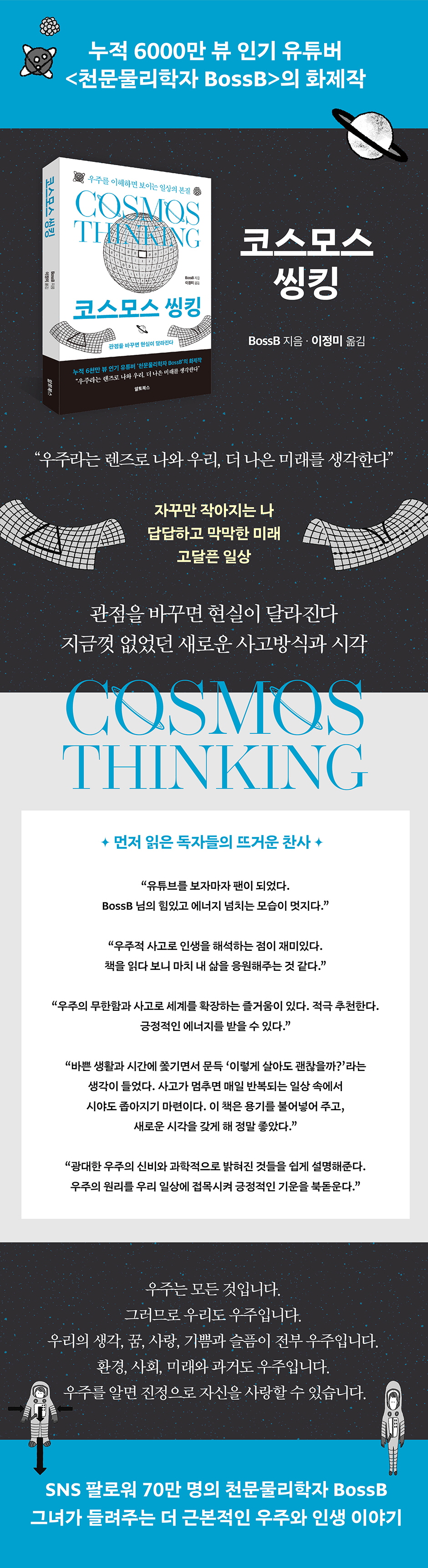¡®Ãµ¹®¹°¸®ÇÐÀÚBossB¡¯·Î¼ ƽÅåÀ» ºñ·ÔÇØ SNS ÆÈ·Î¿ö°¡ 70¸¸ ¸í¿¡ ´ÞÇÏ´Â Àαâ Å©¸®¿¡ÀÌÅÍ´Ù. ¿ìÁÖ¿Í ¹°¸®ÇÐÀ» ´©±¸³ª ÀÌÇØÇϱ⠽±°Ô ¼³¸íÇÏ¸é¼ ¡®¿ì¸® Á¸Àç¿Í ¼¼»óÀÇ º»Áú¡¯¿¡ ´Ù°¡°¡±â À§ÇÑ ÄÚ½º¸ð½º ¾ÅÅ·, Áï ¿ìÁÖ »ý°¢¹ýÀ» ¼Ò°³ÇØ ¿±¤ÀûÀÎ ¹ÝÀÀÀ» ¾ò°í ÀÖ´Ù. ÀúÀÚ°¡ ¿ìÁÖ¿¡ °ü½ÉÀ» °®°Ô µÈ °è±â´Â ¡°³»°¡ ¿Ö žÀ¸¸ç ¿Ö »ì¾Æ°¡°í ÀÖ´ÂÁö, ³ªÀÇ Á¸Àç ÀÇÀÇ¿Í °¡Ä¡´Â ¹«¾ùÀÎÁö¿¡ ´ëÇÑ ´äÀ» ã±â À§Çؼ¡±¿´´Ù°í ÇÑ´Ù. ±× °úÁ¤¿¡¼ ³ª¿Â ÀÌ Ã¥Àº ±×·¡¼ ´Ü¼øÇÑ °úÇÐÃ¥ÀÌ ¾Æ´Ï¶ó °úÇÐÀû »ç°í¹ýÀ» ÅëÇØ Àλý·ÐÀ» À̾߱âÇÏ´Â µ¶Æ¯ÇÑ °úÇÐ ¿¡¼¼ÀÌ´Ù.