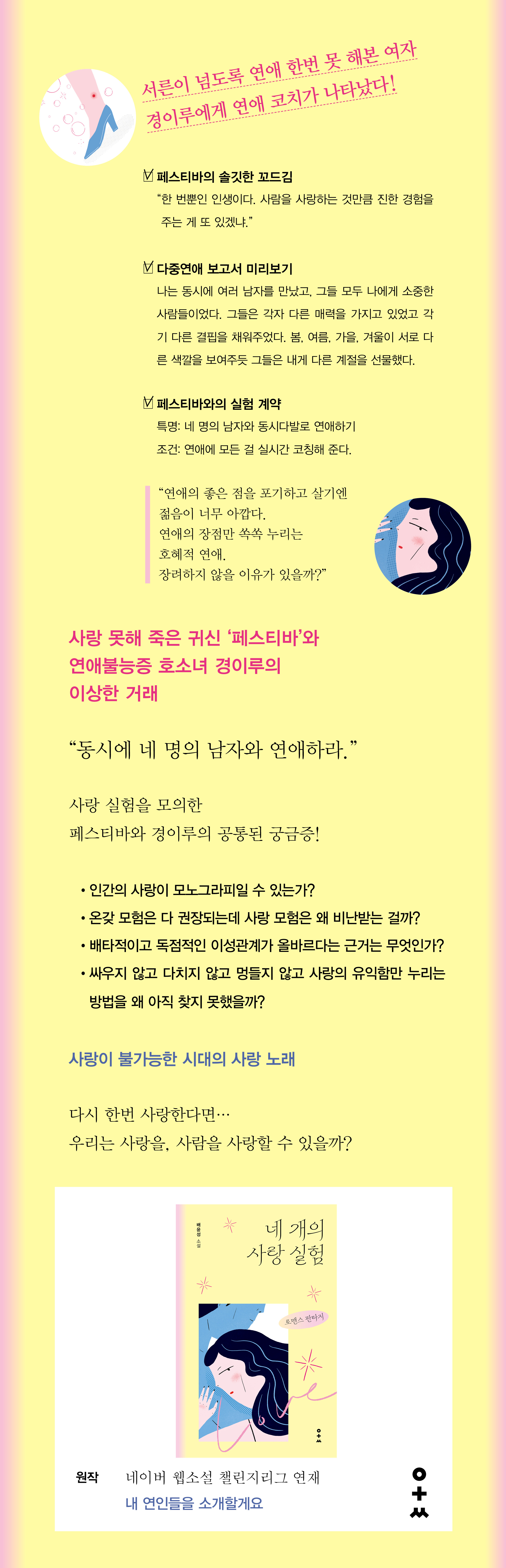»ç¶ûÀÌ ºÒ°¡´ÉÇÑ ½Ã´ë¶ó°íµé ÇÑ´Ù. ÀλýÀº Çѹø»ÓÀÌ°í ³ª´Â ³Ê¹«³ª ¼ÒÁßÇϱ⿡ ºÒÈ®½ÇÇÑ °Í¿¡ ¼Ò¸ðÇÒ ½Ã°£µµ ¿¡³ÊÁöµµ ¾ø¾î¼¶ó°í ÇÑ´Ù. ±×·¸Áö¸¸ »ç¶÷ÀÌ ½¢ÇÑ ¾î·Á¿òÀ» µó°í ÀλýÀ» »ì¾Æ³ª°¡°Ô ÇÏ´Â ÈûÀº ¿©ÀüÈ÷ »ç¶û¿¡ ÀÖ´Ù´Â °É ºÎÀÎÇÒ ¼ö´Â ¾ø´Ù. ±×·¡¼ »ç¶ûÀ» ãÁö¸¸ ½ÇÆÐÇÏ°í ½ÍÁö ¾Ê¾Æ¼ ¸Á¼³ÀÌ°í ¸Ó¹µ°Å¸°´Ù. ÀÌ·¸°Ô À̱âÀûÀ̰í ÀÌÀ²¹è¹ÝÀûÀÎ °è»ê ¾Õ¿¡ ½Ã°£¸¸ º¸³»´Â ûÃá¿¡°Ô´Â °¢º°ÇÑ µµ¿òÀÇ ¼Õ±æÀÌ ÇÊ¿äÇÏ´Ù. ¿¬¾Ö¿¡µµ µðÅ×ÀÏÇÑ ÄÚĪÀÌ ÇÊ¿äÇÑ ½Ã´ëÀÎ °ÍÀÌ´Ù. ¿¬¾Ö°¡ ºÒ°¡´ÉÇÑ ½Ã´ë¸¦ »ç´Â ûÃáµéÀ» ¹Ù¶óº¸¸ç ÀÛ°¡ ¹èÀ±¼ºÀº ÀÚ½ÅÀÇ ÀþÀº ³¯À» µ¹¾Æº¸¾Ò´Ù. À̰ÍÀú°Í Àê °Íµµ ¾øÀÌ ³À´Ù Áú·¯¹ö¸° ´Ü ÇѹøÀÇ ¿¬¾Ö¿Í °áÈ¥! ÀÌ·¡¼¾ß ´©°¡ ´©±¸¸¦ ¾ÈŸ±î¿öÇÑ´Ü ¸»Àΰ¡. ÀúÀÚ´Â ¿¬¾Ö Çѹø Á¦´ë·Î ¸øÇغ» ÀÚ½ÅÀÇ ÀþÀº ³¯¿¡ Æä½ºÆ¼¹Ù¶ó´Â °¡»óÀÇ ½ÅÀ» º¸³»¾î ±× ½ÃÀýÀ» ¼Ò¼³À̶ó´Â °ø°£ ¼Ó¿¡¼ ´Ù½Ã »ì¾Æº¸°Ô ÇÏ´Â ½ÇÇè¿¡ µµÀüÇÑ´Ù. ±× °á°ú¹°ÀÌ ¹Ù·Î ¡´³× °³ÀÇ »ç¶û ½ÇÇ衵ÀÌ´Ù.