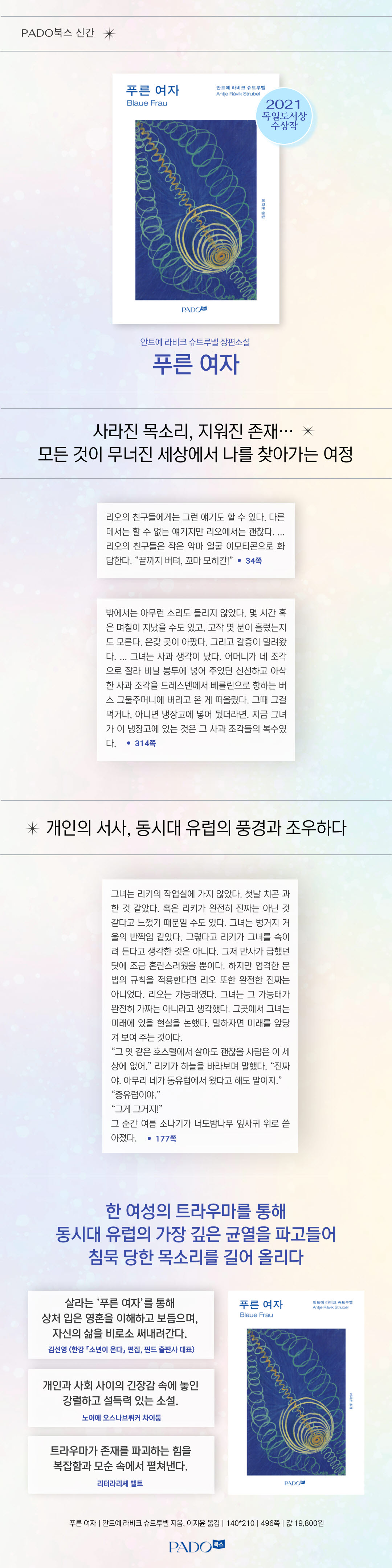 2021³â µ¶ÀÏ µµ¼»ó(Deutscher Buchpreis)À» ¼ö»óÇÏ¸ç Æò´Ü°ú µ¶ÀÚÀÇ ¾ÐµµÀûÀÎ Âù»ç¸¦ ¹ÞÀº ¾ÈƼ¿¡ ¶óºñÅ© ½´Æ®·çº§ÀÇ ÀåÆí¼Ò¼³ ¡ºÇª¸¥ ¿©ÀÚ¡»°¡ Ãâ°£µÆ´Ù. ÀÌ ¼Ò¼³Àº ¼ºÆø·ÂÀ¸·Î '³»¸éÀÇ ¸Á¸í' »óÅ¿¡ ºüÁø ÇÑ ¿©¼ºÀÇ À§ÅÂ·Î¿î ¿©Á¤À» ÁÀ´Â´Ù. µ¿½Ã¿¡ °³ÀÎÀÇ »óó°¡ µ¿½Ã´ë À¯·´ÀÇ ÁöÁ¤ÇÐÀû ±Õ¿ ¼Ó¿¡¼ ¾î¶»°Ô ¹ßȵǰí ħ¹¬µÇ´ÂÁö Áý¿äÇÏ°Ô ÃßÀûÇÑ´Ù. ÀÛ°¡ÀÇ Á¤±³ÇÏ°í ½ÃÀûÀÎ ¹®ÀåÀº Àι°ÀÇ ³»¸éÀ» »ý»ýÇÏ°Ô ±×·Á³»¸ç ÀØÀ» ¼ö ¾ø´Â °æÇèÀ» ¼±»çÇÑ´Ù.
