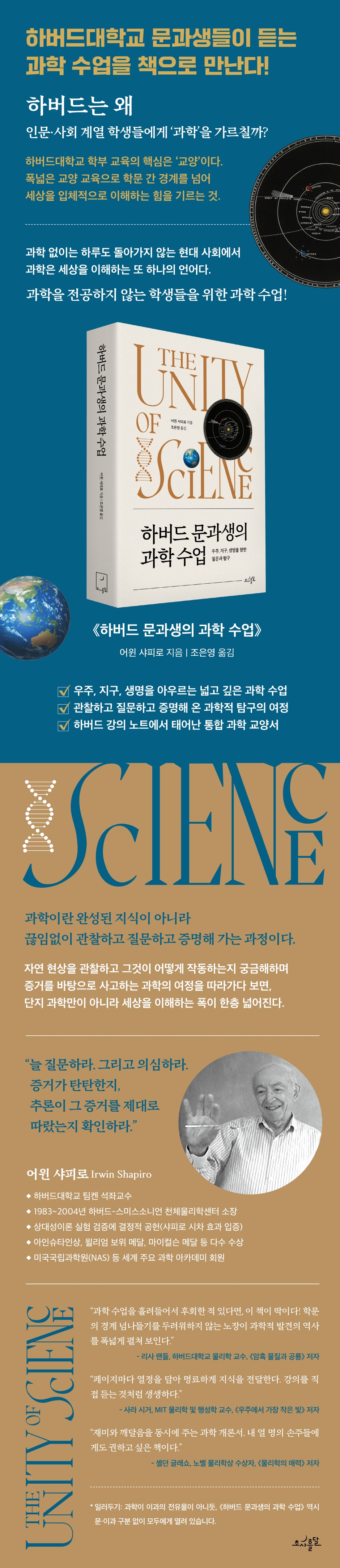 Ã¥¼Ò°³ÇϹöµå´ëÇб³¿¡¼ ¡®Àι®¡¤»çȸ¡¯ Àü°ø ÇкλýµéÀ» À§ÇØ ¸¶·ÃÇÑ ¡®°úÇС¯ °Àǰ¡ ¡¶ÇϹöµå ¹®°ú»ýÀÇ °úÇÐ ¼ö¾÷¡·À¸·Î ž´Ù. °úÇÐÀ» Àü°øÇÏÁö ¾Ê´Â ÇлýµéÀ» À§ÇÑ ¼ö¾÷ÀÎ ¸¸Å °³·ÐÀÇ ÇüŸ¦ ¶í ÀÌ Ã¥¿¡¼´Â ¿ìÁÖ, Áö±¸, »ý¸íÀ̶ó´Â ¼¼ °¡Áö ´ëÁÖÁ¦ ¾Æ·¡ °í´ëºÎÅÍ Áö±Ý±îÁö Àΰ£ÀÌ ÀÚ¿¬ ¼¼°è¸¦ ޱ¸ÇØ ¿Â °úÁ¤À» Æø³Ð°Ô »ìÆìº»´Ù. Áö±¸°¡ žçÀ» °øÀüÇϰí, ´ë·úÀÌ À̵¿Çϸç, »ý¸íü°¡ ÁøÈÇØ ¿Ô´Ù´Â »ç½ÇÀº ¿À´Ã³¯ÀÇ Áö½ÄÀ¸·Î ¾ð¶æ ´ç¿¬ÇØ º¸ÀÌÁö¸¸, ±×°ÍÀ» óÀ½ ¹ß°ßÇßÀ» ¶§´Â ¼¼»óÀ» µÚ¾þ´Â ½É´ëÇÑ ÅëÂûÀ̾ú´Ù. ¹ß°ßÀÇ °úÁ¤ ¿ª½Ã ¼øÅºÄ¡ ¾Ê¾ÒÀ¸¸ç, ÀÚ¿¬ÀÇ ÆÛÁñÀ» ¸ÂÃß°íÀÚ ¶Ù¾îµç °úÇÐÀÚµéÀÌ ¾û¶×ÇÑ ÁöÁ¡¿¡¼ Çì¸Å°Å³ª À߸øµÈ ¼±ÅÃÀ¸·Î ¸·´Ù¸¥ ±æ¿¡ À̸£´Â Èæ¿ª»ç¸¦ ³²±â±âµµ Çß´Ù. ¡¶ÇϹöµå ¹®°ú»ýÀÇ °úÇÐ ¼ö¾÷¡·Àº ÀÌ °°Àº ޱ¸ÀÇ ¿©Á¤À» ÁÀ¾Æ°¡¸é¼, °úÇÐÀ̶õ ¿Ï¼ºµÈ Áö½ÄÀÌ ¾Æ´Ï¶ó ²÷ÀÓ¾øÀÌ °üÂûÇϰí Áú¹®Çϰí Áõ¸íÇØ °¡´Â °úÁ¤ÀÓÀ» º¸¿© ÁØ´Ù. ¾Æ¿ï·¯ ¼ö¾÷ ³»³» Áú¹®ÇϱâÀÇ Á߿伺À» °Á¶ÇÑ´Ù. °úÇÐÀº Áú¹®¿¡¼ ½ÃÀ۵ǰí Ž±¸·Î À̾îÁ® ÀÌÇØ¿¡ À̸£¸ç ¶Ç ´Ù¸¥ Áú¹®À¸·Î ´õ ¸Ö¸® ³ª¾Æ°¡±â ¶§¹®ÀÌ´Ù. ÇÑ ÇбâÂ¥¸® °³·Ð ¼ö¾÷À» ÅëÇØ °úÇÐÀ» ´Ù ¾Ë ¼ö´Â ¾ø´Ù. ÇÏÁö¸¸ ÀÚ¿¬ Çö»óÀ» °üÂûÇÏ°í ±×°ÍÀÌ ¾î¶»°Ô ÀÛµ¿ÇÏ´ÂÁö ±Ã±ÝÇØÇϸç Áõ°Å¸¦ ¹ÙÅÁÀ¸·Î »ç°íÇÏ´Â °úÇÐÀÇ ¿©Á¤À» µû¶ó°¡´Ù º¸¸é, ´ÜÁö °úÇи¸ÀÌ ¾Æ´Ï¶ó ¼¼»óÀ» ÀÌÇØÇÏ´Â ÆøÀÌ ÇÑÃþ ³Ð¾îÁø´Ù.