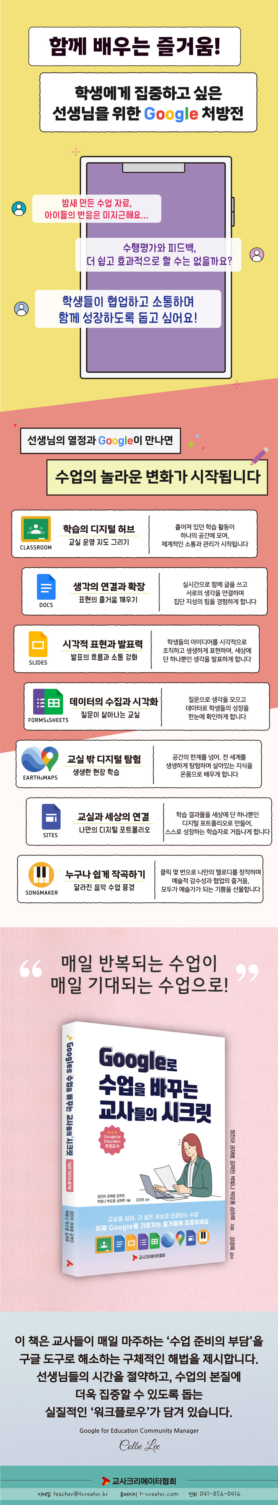 ¡ºGoogle·Î ¼ö¾÷À» ¹Ù²Ù´Â ±³»çµéÀÇ ½ÃÅ©¸´¡»Àº ±³½ÇÀÇ º¯È¸¦ µÎ·Á¿öÇϱ⺸´Ù Áñ±â·Á´Â ±³»çµé¿¡°Ô ¿ë±â¿Í ¿µ°¨À» ÁØ´Ù. º¹ÀâÇÑ ±â¼ú ¿ë¾î ´ë½Å ÇöÀå¿¡¼ Á÷Á¢ °ËÁõµÈ »ç·Ê¿Í ±¸Ã¼ÀûÀÎ ½Çõ ¹æ¹ýÀ¸·Î ä¿öÁ® ÀÖ¾î, ¡°³ªµµ ÇØº¼ ¼ö ÀÖ°Ú´Ù.¡±¶ó´Â ÀڽۨÀ» ÀüÇϴ åÀÌ´Ù.