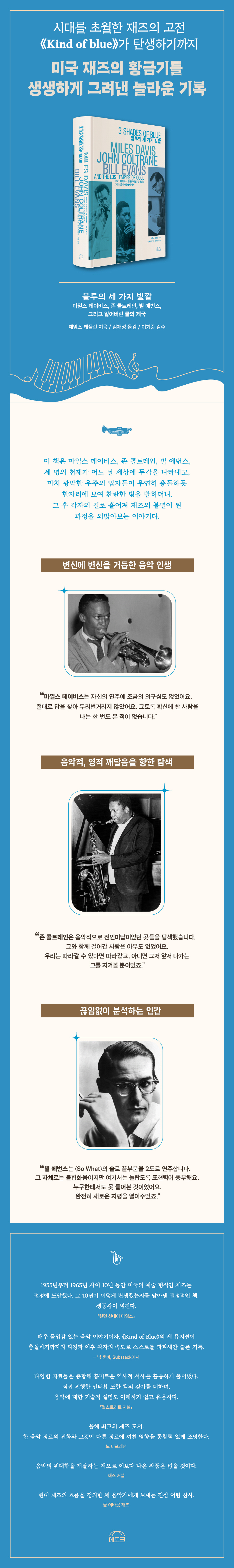 ÀÌ ¾Ù¹üÀÇ Á߽ɿ¡´Â ¹«ÇÑÇÑ Ã¢Á¶¼ºÀ» °¡Áø ¼¼ Àι° ¸¶ÀϽº µ¥À̺ñ½º, Á¸ ÄÝÆ®·¹ÀÎ, ºô ¿¡¹ø½º°¡ ÀÖ¾ú´Ù. À̵éÀº ºÒ¸êÀÇ ÀçÁî °ÅÀåÀ̶ó´Â ¸é¿¡¼´Â °°Áö¸¸ ÀÌ Ã¥ÀÇ Á¦¸ñó·³ °¢±â ´Ù¸¥ ¡®ºí·ç¡¯¿´´Ù. ¡ººí·çÀÇ ¼¼ °¡Áö ºû±ò¡»Àº ÀÌ ¼¼ »ç¶÷À» ÃàÀ¸·Î ¡¶Kind of Blue¡·ÀÇ ³ìÀ½¿¡ À̸£±â±îÁö °¢°¢ÀÇ ÀλýÀ» µû¶ó°¡¸ç ±×µéÀÇ ¿¹¼úÀû °í¹Î°ú À½¾ÇÀû ¼ºÃë, »îÀÇ ±¼°îÀ» »ý»ýÇÏ°Ô ±×·Á³½´Ù. ¶ÇÇÑ ÀçÁîÀÇ È²±Ý±â¿Í ¡¶Kind of Blue¡·¸¦ °¡´ÉÇÏ°Ô ¸¸µç ÅڷδϾ ¸ÛÅ©, Âû½º ¹Ö°Å½º,Âû¸® ÆÄÄ¿, µðÁö ±æ·¹½ºÇÇ °°Àº ¼±¹è ¹ÂÁö¼Çµé»Ó¸¸ ¾Æ´Ï¶ó ¡¶Kind of Blue¡· ÀÌÈÄ ±âÁ¸ÀÇ Æ²À» ±ú°í ÇÁ¸® ÀçÁî¶ó´Â »õ·Î¿î ±æÀ» ¿¾ú´ø ¼¼½Ç Å×ÀÏ·¯, ¿À³Ý ÄݸձîÁö 1959³âÀ» ±âÁ¡À¸·Î ÇÑ °ú°Å¿Í ÀÌÈÄÀÇ ÀçÁî ¿ª»ç¸¦ À¯·ÁÇÏ°Ô ÆîÃij½´Ù.