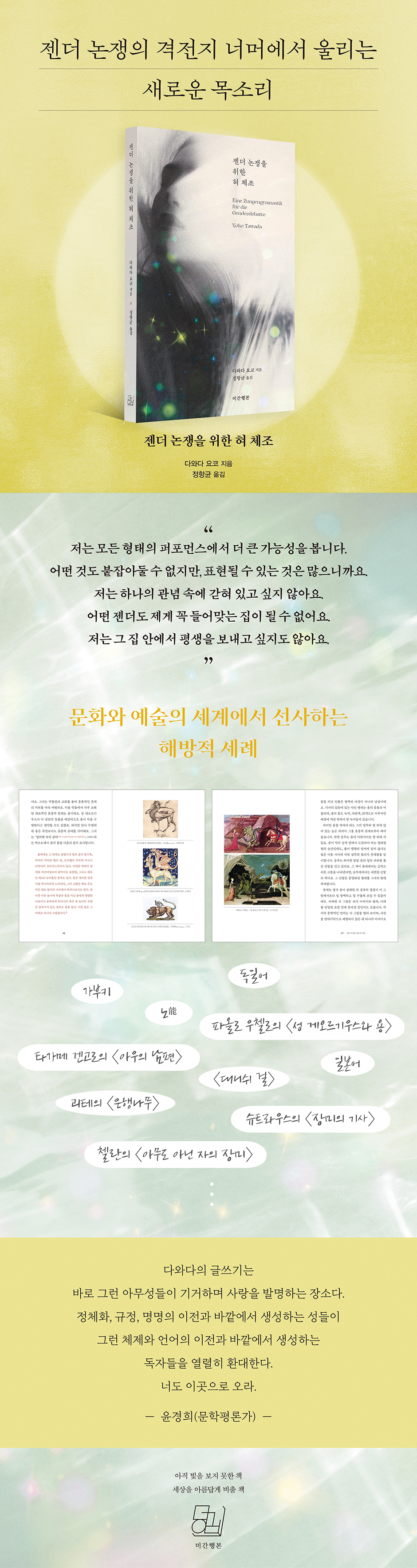 ±¹°¡, ¹®È, ¾ð¾î, Á¾, Á¤Ã¼¼ºÀÇ °æ°è¸¦ ÀÚÀ¯·Ó°Ô ¶Ù¾î³Ñ´Â ÀÛ°¡ ´Ù¿Í´Ù´Â ¡ºÁ¨´õ ³íÀïÀ» À§ÇÑ Çô üÁ¶¡»¿¡¼µµ ¾î±è¾øÀÌ ¿ù°æ(êÆÌÑ)ÇÑ´Ù. ù ¹øÂ° Àå¿¡¼´Â Àΰ£ÀÇ ¸ö ±¸¼®±¸¼®À» »ô»ôÀÌ »ìÇÇ´Ù°¡ ÆÄ¿Ã·Î ¿ìÿ·ÎÀÇ ±×¸²À¸·Î °Ç³Ê°¡ È¥Á¾ÀûÀÎ ¿ëÀÇ ¸ö¿¡ ¸Ó¹«¸¥´Ù. µÎ ¹øÂ° Àå ¡¸3ÀÎĪÀÇ ºÎÀ硹¿¡¼´Â ¾ð¾î¿Í °ü·ÃÇØ µ¶ÀÏ¿¡¼ ¹ú¾îÁö´Â »õ·Î¿î ³íÀǸ¦ ¼Ò°³Çϰí, µ¶ÀϾî¿Í ÀϺ»¾îÀÇ ¹®¹ý ü°è¸¦ »óÈ£¹®ÈÀûÀÎ °üÁ¡¿¡¼ ¤¾îº»´Ù. ¼¼ ¹øÂ° Àå ¡¸Á÷¹°·Î¼ÀÇ Á¨´õ, dz°æÀ¸·Î¼ÀÇ Á¨´õ¡¹¿¡¼´Â ¿µÈ ¡´´ë´Ï½¬ °É¡µÀÇ µîÀåÀι°µéÀ» ¸é¹ÐÈ÷ µé¿©´Ùº»´Ù. ´Ù¿Í´ÙÀÇ ½Ã¼±Àº ÁöÁ¤ ¼ºº°¿¡¼ ´Ù¸¥ ¼ºº°·Î ÀÌÇàÇÏ´Â ¿¡À̳ª¸£ º£°Ô³Ê¸¦ ÂѾư¡°í, µÚÀÌ¾î ±×ÀÇ ¾Æ³» °Ô¸£´Ù¿¡°Ô¼ ´ÙÃþÀûÀ̰í À¯µ¿ÀûÀÎ Á¨´õ Á¤Ã¼¼ºÀ» Æ÷ÂøÇÑ´Ù. ¶ÇÇÑ Ã¥ Àü¹Ý¿¡ °ÉÃÄ °í´ë ¹®È, ±ÙÇö´ë µ¶Àϰú ÀϺ»ÀÇ ¹®È, °¡ºÎŰ, Áß¼¼ ¹®Çå, BL ¸¸È, ±«Å×¿Í Ã¿¶õÀÇ ½Ã, ¿ÀÆä¶ó ¡´Àå¹ÌÀÇ ±â»ç¡µ µî Á¾ÀâÀ» ¼ö ¾øÀÌ ´Ùä·Î¿î ¹®È¿Í ¿¹¼ú ÀÛǰÀÇ °æ°è¸¦ ³Ñ´Â´Ù.