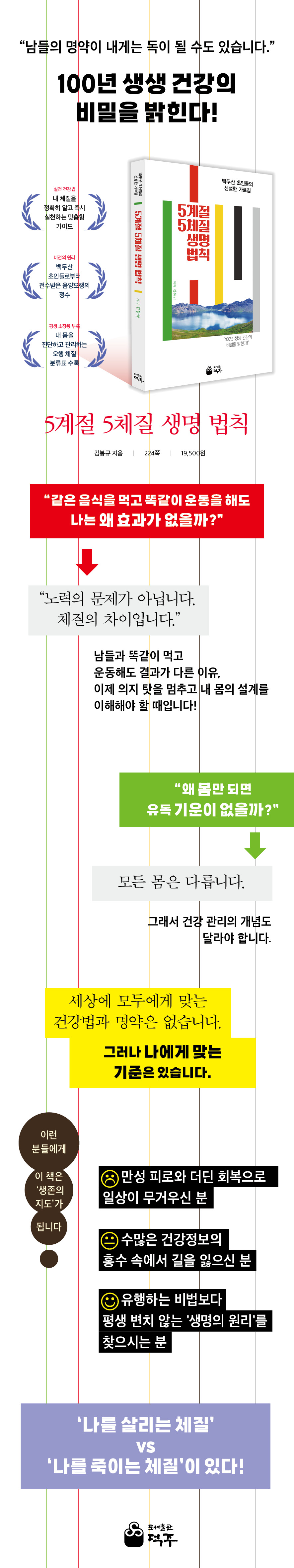 ¡¶5°èÀý 5üÁú »ý¸í ¹ýÄ¢¡·Àº µ¿¾çÀÇ °èÀý Àνİú üÁú °³³äÀ» ¹ÙÅÁÀ¸·Î ¸öÀ» ´Ù¼¸ °¡Áö °èÀýÀÇ È帧°ú ´Ù¼¸ °¡Áö üÁú·Î Ç®¾î³½´Ù. ±Ùº»ÀûÀ¸·Î °Ç°À» ¡®°íÃÄ¾ß ÇÒ ´ë»ó¡¯ÀÌ ¾Æ´Ï¶ó ¡®ÀÌÇØÇϰí Á¶À²ÇØ¾ß ÇÒ Á¸À硯·Î ¹Ù¶óº»´Ù.
