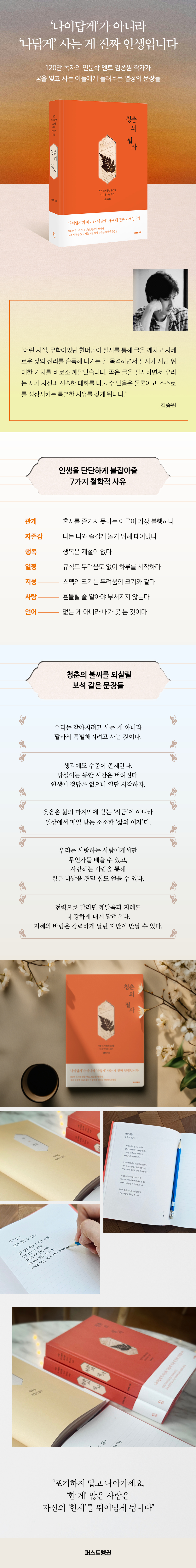 ±íÀº »ç»öÀ» ¹ÙÅÁÀ¸·Î ÇÑ µû¶æÇÏ°í ´ÙÁ¤ÇÑ ¾ð¾î·Î 120¸¸ µ¶ÀÚÀÇ Àι®ÇÐ ¸àÅä·Î ºÒ¸®´Â ±èÁ¾¿ø ÀÛ°¡´Â ¾î¸° ½ÃÀý, ¹«ÇÐÀ̾ú´ø ÇҸӴϰ¡ Çʻ縦 ÅëÇØ ±ÛÀ» ±úÄ¡°í ÁöÇý·Î¿î »îÀÇ Áø¸®µéÀ» ½ÀµæÇØ ³ª°¡´Â °úÁ¤À» »ý»ýÇÏ°Ô ¸ñ°ÝÇÏ¸é¼ Çʻ簡 °¡Áø À§´ëÇÑ °¡Ä¡¸¦ ¸ö¼Ò ±ú¿ìÄ¡°Ô µÇ¾ú´Ù. ±×¸®°í ¡°´õ ³ª¾ÆÁú ¼ö ÀÖ´Ù°í ¹Ï´Â ÇÑ ¿ì¸®´Â ¾ðÁ¦³ª ûÃáÀÌ´Ù¡±¶ó´Â ¹ÏÀ½À¸·Î ¸ðµç »ç¶÷ÀÌ Çʻ縦 ÅëÇØ °¡Àå ¶ß°Å¿ü´ø ûÃáÀ» ¸¶ÁÖÇÒ ¼ö ÀÖ´Â »îÀÇ Åµµ¸¦ ÇÑ ¹®Àå ÇÑ ¹®Àå¿¡ Áø½ÉÀ» ´ã¾Æ ³ì¿©³Â´Ù. Àΰ£°ü°è, ÀÚÁ¸°¨, Çູ, ¿Á¤, Áö¼º, »ç¶û µî ÀλýÀ» ´Ü´ÜÇÏ°Ô ºÙÀâ¾ÆÁ٠öÇÐÀû »çÀ¯·Î °¡µæÇÑ ÀÌ Ã¥Àº Ä¡¿ÇÑ »îÀÇ ÇѰ¡¿îµ¥¸¦ Áö³ª´Â À̵éÀ» ´õ ³Ð°í ±íÀº ¼¼°è·Î À̲ö´Ù.