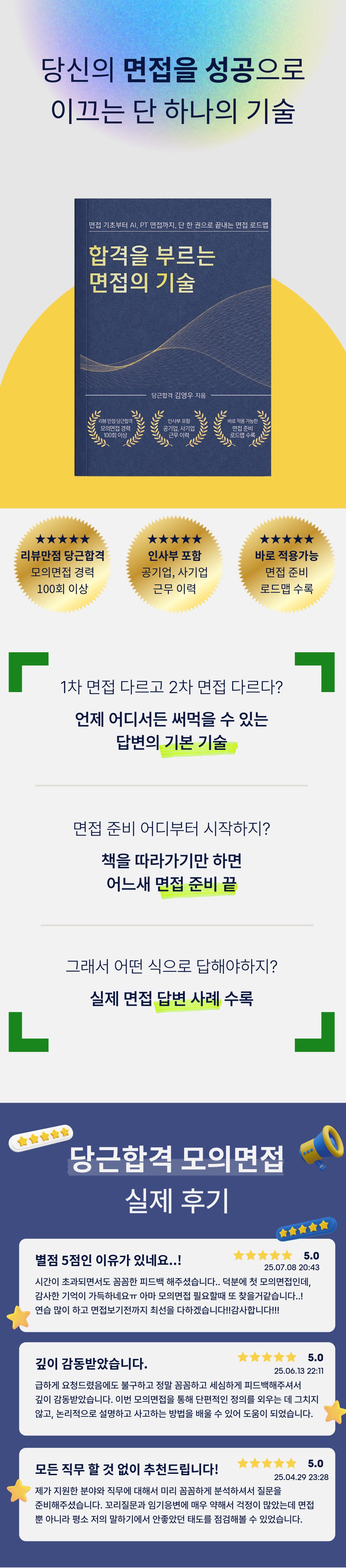 '³ªÀÇ °Á¡Àº ¹«¾ùÀϱî?'¶ó´Â Áú¹®¿¡ ¸·¿¬ÇÏ°Ô '¼º½ÇÇÔ'À̳ª 'Ã¥ÀÓ°¨'À̶ó°í ´äÇÏ´Â °ÍÀº ÁÁÀº ÀλóÀ» ÁÖ±â ¾î·Æ½À´Ï´Ù. ±¸Ã¼ÀûÀÎ °æÇè°ú ¼öÄ¡¸¦ µé¾î ¿Ö ´ç½ÅÀÌ ¼º½ÇÇϰí Ã¥ÀÓ°¨ ÀÖ´Â »ç¶÷ÀÎÁö Áõ¸íÇØ¾ß ÇÕ´Ï´Ù. - 38ÂÊ AI ¸éÁ¢Àº Á¤ÇØÁø ÆÐÅϰú ¾Ë°í¸®Áò¿¡ µû¶ó ´ç½ÅÀ» Æò°¡ÇÕ´Ï´Ù. ´Ü¼øÈ÷ ´äº¯ ³»¿ë»Ó¸¸ ¾Æ´Ï¶ó, À½¼º Åæ, Ç¥Á¤, ½Ã¼± ó¸® µî ºñ¾ð¾îÀû ¿ä¼Ò°¡ Áß¿äÇÑ Æò°¡ ÁöÇ¥°¡ µË´Ï´Ù. - 125ÂÊ PT ¸éÁ¢¿¡¼ °¡Àå Áß¿äÇÑ °ÍÀº '³í¸®Àû È帧'ÀÔ´Ï´Ù. º¹ÀâÇÑ ¾ÆÀ̵ð¾î¶óµµ ¼·Ð-º»·Ð-°á·ÐÀÇ ¸íÈ®ÇÑ ±¸Á¶·Î Àü´ÞÇÏ¸é ¸éÁ¢°üÀÇ ÀÌÇØµµ¸¦ ³ôÀÌ°í ±íÀº ÀλóÀ» ³²±æ ¼ö ÀÖ½À´Ï´Ù. - 157ÂÊ ¸éÁ¢¿¡¼ ¶³¾îÁö´Â °¡Àå ÈçÇÑ ÀÌÀ¯ Áß Çϳª´Â '°ÅÁþ¸»'ÀÔ´Ï´Ù. ´É·ÂÀ» °úÀåÇϰųª Á¸ÀçÇÏÁö ¾Ê´Â °æÇèÀ» À̾߱âÇϸé, ¸éÁ¢°üÀº ±Ý¼¼ ´ç½ÅÀÇ ¸»À» ÀǽÉÇÏ°Ô µÇ°í ½Å·Ú¸¦ ÀÒ°Ô µË´Ï´Ù. - 85ÂÊ ÀڽۨÀ» °®´Â °ÍÀº Áß¿äÇÏÁö¸¸, '°úµµÇÑ ÀÚ±â ÀÚ¶û'Àº ¿ÀÈ÷·Á µ¶ÀÌ µÉ ¼ö ÀÖ½À´Ï´Ù. ¸éÁ¢°üÀº ´ç½ÅÀÇ ´É·ÂÀ» È®ÀÎÇÏ·Á´Â °ÍÀÌÁö, ÀÚÈÀÚÂùÀ» µéÀ¸·Á´Â °ÍÀÌ ¾Æ´Õ´Ï´Ù. - 92ÂÊ ÃâÆÇ»ç ¼Æò¿Ö ÀÌ Ã¥À̾î¾ß ÇÒ±î¿ä?