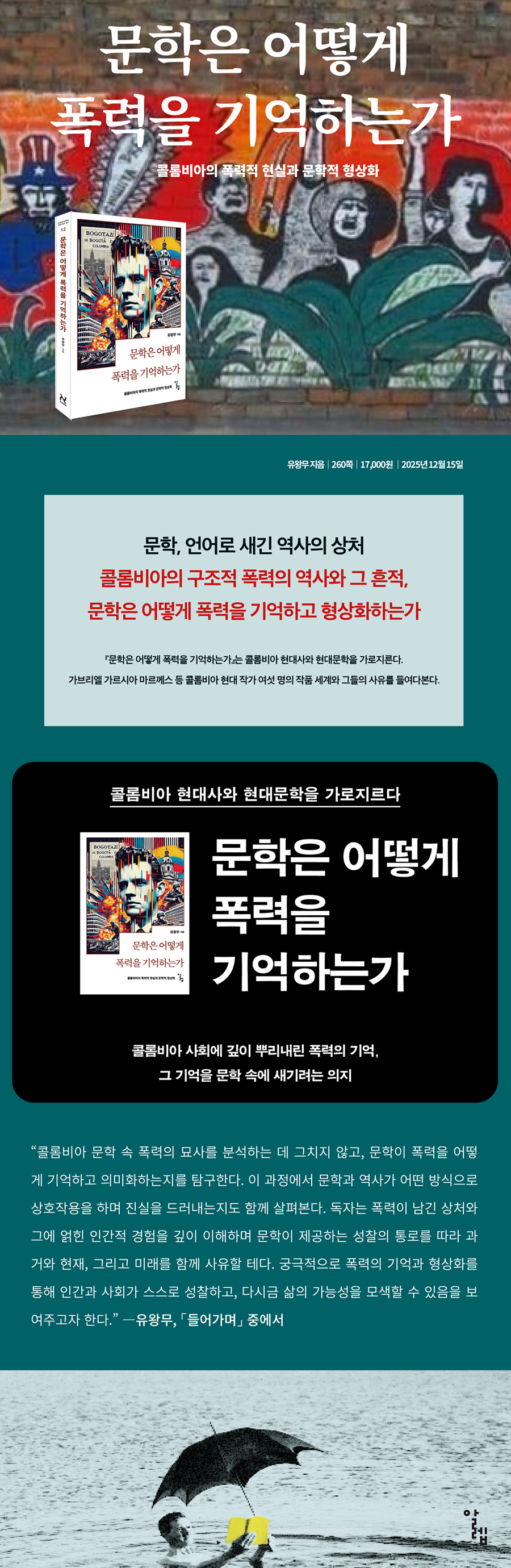 ?µé¾î°¡¸ç: ÄÝ·Òºñ¾ÆÀÇ ¿ª»ç, »óó, ±×¸®°í ¼»ç, 6ÂÊ °¡¸£½Ã¾Æ ¸¶¸£²²½º´Â ¶óƾ¾Æ¸Þ¸®Ä«ÀÇ ¿ª»ç¸¦ Æø·ÂÀÇ ±¸Á¶·Î ÀνÄÇÏ¸ç ¡º³«¿±¡», ¡º¾Æ¹«µµ ´ë·É¿¡°Ô ÆíÁöÇÏÁö ¾Ê´Ù¡», ¡º¹é³âÀÇ °íµ¶¡»À» ÅëÇØ ºÎÁ¶¸®ÇÑ Çö½Ç°ú Àΰ£ÀÇ °íµ¶, ±×¸®°í »çȸ üÁ¦¿¡ ´ëÇÑ ºñÆÇÀû ÀνÄÀ» ¹®ÇÐÀûÀ¸·Î Çü»óÈÇß´Ù. ±×´Â ´Ü¼øÇÑ ¿ª»çÀû »ç½ÇÀÇ ÀçÇöÀÌ ¾Æ´Ï¶ó °³Àΰú ¹ÎÁßÀÇ ÀÚ°¢, Áý¿äÇÑ »ý¸í·Â, ±×¸®°í Áý´ÜÀÇ ±â¾ïÀ» ÅëÇØ ¿ª»çÀû Àǹ̸¦ ÀçÁ¶¸íÇϰí, ÀÚÀ¯¡¤Æòµî¡¤Á¤ÀÇ¡¤Àΰ£ Á¸¾öÀ» ÁöÇâÇÏ´Â »çȸ üÁ¦ÀÇ °¡´É¼ºÀ» ¹®ÇÐ ¾È¿¡¼ Á¦½ÃÇÑ´Ù. ±Ã±ØÀûÀ¸·Î ±×ÀÇ ¹®ÇÐÀº ¶óƾ¾Æ¸Þ¸®Ä«ÀÇ Çö½ÇÀ» ³Ñ¾î¼± º¸ÆíÀû Àΰ£ Á¶°Ç¿¡ ´ëÇÑ ¼ºÂûÀÌ¸ç ¹®ÇÐÀ» ÅëÇÑ ÀúÇ×°ú Ä¡À¯ÀÇ ¹ÌÇÐÀû ½ÇõÀÌ´Ù. ?Á¦1Àå ¿ª»ç¼Ò¼³¿¡ ³ªÅ¸³ Æø·ÂÀÇ ±¸Á¶È¿Í ¹®ÇÐÀû Àç»ý, 51ÂÊ ¹Ù¿¹È£´Â ÄÝ·Òºñ¾Æ¸¦ ¿ÏÀüÈ÷ Æ÷±âÇÏÁö ¾Ê´Â´Ù. ±×ÀÇ ºñÆÇÀº ³Ã¼Ò³ª Çø¿À¿¡¼ ºñ·ÔµÈ °ÍÀÌ ¾Æ´Ï¶ó ±íÀº ¾ÖÁ¤À» ¹ÙÅÁÀ¸·Î ÇÑ´Ù. ±×´Â Çö½Ç¿¡ ´ëÇÑ °øÅëµÈ Àνİú ÀÌÇØ¸¦ ´ëÁß¿¡ ½É¾îÁÖ´Â ÀÏÀ̾߸»·Î ÄÝ·Òºñ¾Æ, ³ª¾Æ°¡ ¶óƾ¾Æ¸Þ¸®Ä«ÀÇ Æø·ÂÀûÀÌ°í ºÎÁ¶¸®ÇÑ Çö½ÇÀ» º¯È½ÃŰ´Â ù°ÉÀ½À̶ó°í È®½ÅÇÑ´Ù. µû¶ó¼ ¡ºÃ»ºÎ »ìÀÎÀÚÀÇ ¼º¸ð¡»´Â ´Ü¼øÇÑ °í¹ß¹®ÇÐÀÌ ¾Æ´Ï¶ó Àΰ£Àû °¡Ä¡¿¡ ´ëÇÑ ¼¶¼¼ÇÑ Å½»ö°ú ÇÔ²² »çȸÀû º¯È¸¦ Ã˱¸ÇÏ´Â ¹®ÇÐÀû ½ÇõÀ¸·Î ÀÌÇØµÉ ¼ö ÀÖ´Ù. ?Á¦2Àå Æø·ÂÀÇ ¾ð¾î¿Í ÀúÇ×ÀÇ ¹ÌÇÐ, 89-90ÂÊ ÀÛ°¡ ¶ó¿ì¶ó ·¹½º¶ß·¹»Ç´Â ÀÛǰ ¡º±¤±â¡»¸¦ ÅëÇØ ´ç½Ã ÄÝ·Òºñ¾Æ »çȸÀÇ ºÎÁ¶¸®¿Í È¥¶õÀ» ºñÆÇÀûÀ¸·Î Á¶¸íÇÑ´Ù. ƯÈ÷ ¸¶¾à°ú °Ô¸±¶ó ¹®Á¦·Î ¹«Áú¼°¡ ½ÉÇß´ø ½Ã´ëÀû ¹è°æÀ» ¹Ý¿µÇÏ¸ç ¹®ÇÐÀÌ »çȸ¸¦ ÇâÇØ °³ÀÔÇÒ µµ±¸ÀÓÀ» °Á¶ÇÑ´Ù. ±×³à´Â Àΰ£, »çȸ, ¼¼°è¸¦ Æø·Â°ú ±¤±â·Î ÈÛ½ÎÀÎ Çö½Ç ¼Ó¿¡¼ ¹Ù¶óº¸°í, À̸¦ ¼»çÀûÀ¸·Î °í¹ßÇÑ´Ù. ?Á¦3Àå ±¤±â ¼¸° Çö´ë»çÀÇ ¾îµÎ¿î °Å¿ï, 127ÂÊ ¼Ò¼³ ¡ºÀúÅỿ¡¼ ÀÛ°¡ ¼¼»¾´Ù »ç¹«µð¿À´Â ÄÝ·Òºñ¾Æ°¡ »ê¾÷ÀÚº»ÁÖÀÇ »çȸ·Î ¼º¼÷ÇØ °¡´Â °úÁ¤¿¡¼ ±âÁ¸ÀÇ ¡®ÈûÀÇ ¹®È¡¯¸¦ ±Øº¹ÇØ¾ß ÇÑ´Ù´Â ÀǽÄÀ» µå·¯³½´Ù. ±×´Â °ú°ÅÀÇ Æø·Â°ú ´ë¸³À» ¹Ýº¹ÇÏ´Â »çȸ ±¸Á¶ ´ë½Å, ´ëÈ¿Í »ç¶û¿¡ ±âÃÊÇÑ ¡®À̼ºÀÇ ¹®È¡¯¸¦ »õ·Î¿î ´ë¾ÈÀ¸·Î Á¦½ÃÇÑ´Ù. ±× Àü¸ÁÀº ¼Ò¼³ÀÇ ¸¶Áö¸· Àå ¡¸¾ÆÀ̵é(Los Hijos)¡¹¿¡ µîÀåÇÏ´Â Á¦3¼¼´ëÀÇ ÀÚ°¢À» ÅëÇØ ±¸Ã¼ÈµÈ´Ù. À̵éÀº óÀ½¿¡´Â Áõ¿À ¶§¹®¿¡ Æø·ÂÀ» ¼±ÅÃÇÏÁö¸¸ °ð ±×°ÍÀÌ ÆÄ±«Àû ÇѰ迡 ºÒ°úÇÏ´Ù´Â Á¡À» ±ú´Ý°í, °¨Á¤°ú ¿å¸ÁÀ» ½º½º·Î ÀýÁ¦Çϸç ÇÕ¸®Àû ÇൿÀ» ¼±ÅÃÇÑ´Ù. ÀÌ´Â ±ÇÀ§ÁÖÀÇ¿Í ¹èŸÁÖÀǸ¦ ³Ñ¾î¼°í, À̼º°ú ´Ù¿ø¼ºÀÇ °¡Ä¡¸¦ ¼ö¿ëÇÏ´Â º¯ÈµÈ ŵµ¸¦ »ó¡ÇÑ´Ù. ?Á¦4Àå Àüȯ ½Ã´ëÀÇ °¥µî ±¸Á¶¿Í ¹Ì·¡Àû ÇÔÀÇ, 167ÂÊ ¿¡º§¸®¿À ·Î¼¼·Î´Â ¡º±º´ëµé¡»À» ÅëÇØ ÀüÀïÀÌ Àΰ£ÀÇ »î¿¡ ¹ÌÄ¡´Â ½ÇÁúÀûÀÎ ¿µÇâÀ» ±íÀÌ ÀÖ°Ô ±×·Á³½´Ù. ±×´Â ´Ü¼øÈ÷ ÀüÀïÀÇ ¼ø°£À» ¹¦»çÇÏ´Â µ¥ ±×Ä¡Áö ¾Ê°í, Æø·ÂÀÌ Àΰ£ÀÇ Åº»ý ÀÌÀüºÎÅÍ Á¸ÀçÇϸç Á×À½ ÀÌÈÄ¿¡µµ ³¡³ªÁö ¾Ê´Â´Ù´Â »ç½ÇÀ» »ó±â½Ã۸ç ÀüÀï ¼Ó »îÀÇ ÂüȤÇÔÀ» °Á¶ÇÑ´Ù. ±³À°, ÀÇ·á, Á¾±³Ã³·³ Àΰ£ÀûÀÎ »îÀ» À¯ÁöÇÏ´Â µ¥ ÇʼöÀûÀÎ ±â¹ÝÀÌ È²ÆóÇØÁø Çö½ÇÀº ¹Ì·¡¿Í Èñ¸ÁÀÌ »ç¶óÁ³À½À» º¸¿©ÁØ´Ù. »î¿¡ ´ëÇÑ Á¸ÁßÀº ¹°·Ð, Á×À½¿¡ ´ëÇÑ ÃÖ¼ÒÇÑÀÇ ¿¹ÀÇÁ¶Â÷ ½ÇÁ¾µÈ ÀÌ ¸ð½ÀÀº ¿À´Ã³¯ ÄÝ·Òºñ¾ÆÀÇ Çö½ÇÀ» »ó¡ÇÑ´Ù. ?Á¦5Àå Æø·ÂÀÇ ÀÏ»óÈ¿Í ¹®ÇÐÀû Áõ¾ð, 206ÂÊ ¼Ò¶Ç ¾Æºü¸®½Ã¿ÀÀÇ ¡ºÁãµéÀÇ ¹Ý¶õ¡»Àº ƯÁ¤ Áö¿ªÀÇ À̾߱⸸À» ´ã´Â °ÍÀÌ ¾Æ´Ï´Ù. ÀÌ ÀÛǰÀº ¶ï¹ß¸®³ª ÄÝ·Òºñ¾Æ, ȤÀº ¶óƾ¾Æ¸Þ¸®Ä«¸¸À» ¹è°æÀ¸·Î ÇÑ °ÍÀÌ ¾Æ´Ï¶ó ¼¼°è °÷°÷¿¡¼ ¹ú¾îÁö´Â ³ëµ¿ÀÚµéÀÇ Çö½ÇÀ» ¹Ý¿µÇÑ º¸ÆíÀûÀÎ À̾߱âÀÌ´Ù. ÄÝ·Òºñ¾Æ, Ä¥·¹, Áß±¹ µî ¼¼°è °÷°÷ÀÇ Åº±¤¿¡¼ ¹Ýº¹µÇ´Â »ç°í¿Í Âü»çµéÀº ÀÌ ÀÛǰÀÌ Æ¯Á¤ÇÑ Áö¸®Àû À§Ä¡¿¡¸¸ ±¹ÇѵÇÁö ¾ÊÀ½À» º¸¿©ÁØ´Ù. °á±¹ ÀÌ ¼Ò¼³Àº Àü ¼¼°èÀûÀ¸·Î °øÅëµÈ ¹®Á¦¸¦ ´Ù·ç¸ç Àΰ£ÀÇ »î°ú ³ëµ¿, ±×¸®°í ±× ¼Ó¿¡¼ ¹ß»ýÇÏ´Â ºÒÀÇ¿¡ ´ëÇÑ º¸ÆíÀûÀÎ ¸Þ½ÃÁö¸¦ ´ã´Â´Ù. ?Á¦6Àå, ±¤»ê ³ëµ¿ÀÚÀÇ »î°ú »çȸ ±¸Á¶¿¡ ´ëÇÑ ºñÆÇÀû °íÂû, 246ÂÊ ÃâÆÇ»ç ¼Æò¹®ÇÐ, ¾ð¾î·Î »õ±ä ¿ª»çÀÇ »óó: ¹®ÇÐÀº ¾î¶»°Ô Æø·ÂÀ» ±â¾ïÇϰí Çü»óÈÇϴ°¡