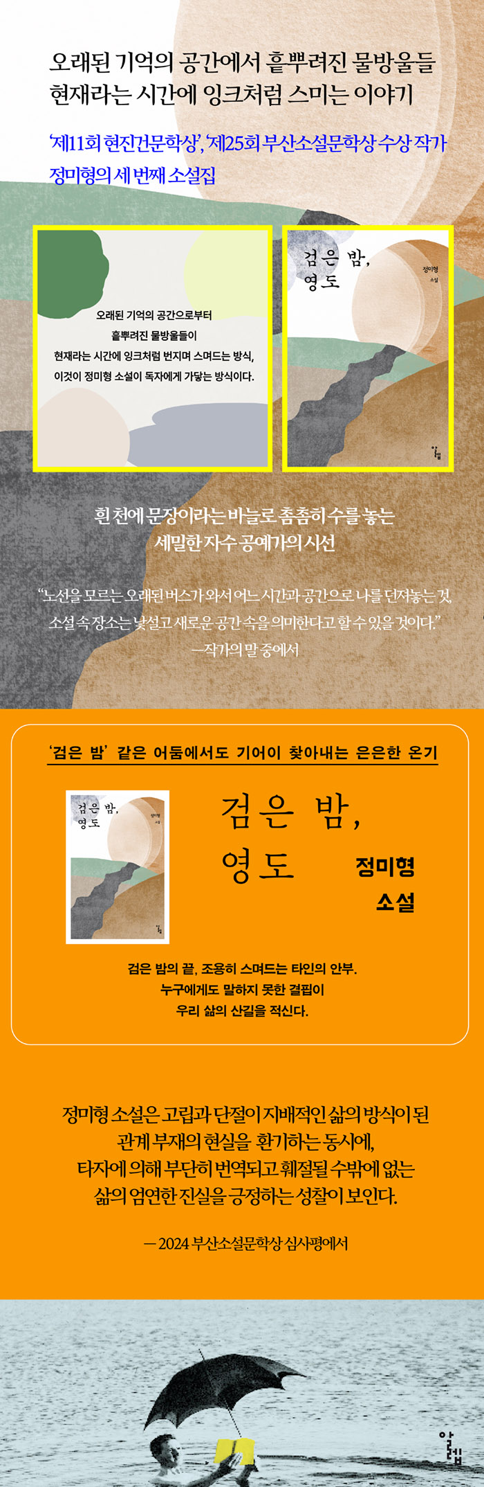 ¡º°ËÀº ¹ã, ¿µµµ¡»´Â ¡°ÀÌÁß È¤Àº ´ÙÁß½ÃÁ¡À¸·Î ¼»ç¸¦ ²ø¾î°¡¸é¼µµ ¸Å²öÇÏ°Ô ¸¶¹«¸®Çß°í, ¼¼´ë¸¦ ´Þ¸®ÇÏ´Â °¡Á· ±¸¼º¿øÀÇ »î¿¡ ´ëÇÑ Á¤³ä°ú ÀǽÄÀ» Àΰ£ÇÐÀû ±íÀÌ·Î ÀÌÇØÇß´Ù¡±°í Æò°¡¹ÞÀº ¡¸³²¿ø ¾îµò°¡¿¡¡¹¸¦ Æ÷ÇÔÇØ 2020³âºÎÅÍ 2024³â±îÁö ÁýÇÊÇÑ 7ÆíÀÇ ´ÜÆíÀÌ ´ã°å´Ù. ½ÇÁ¦ Áö¸íÀÎ ¿µµµ, ³²¿ø, ¾ð¾çÀÇ ±¸Ã¼ÀûÀÎ Àå¼Ò¸¦ ¹è°æÀ¸·Î Çϸ鼵µ, ÀØÈù ½Ã°£¿¡¼ ´Ù½Ã±Ý Âù¶õÇϰí Á¶¿ëÈ÷ ºñÃß´Â »îÀÇ µÞ¸ð½ÀÀ» ´ã¾Æ³»´Â Á¤¹ÌÇü ¼Ò¼³°¡ ƯÀ¯ÀÇ ½Ã¼±ÀÌ ºûÀ» ¹ßÇÑ´Ù. ¼Ò¼³ÀÌ ÇÒ ¼ö ÀÖ´Â ÃÖ°íÀÌÀÚ ÃÖ¼±ÀÇ À§·Î°¡ µ¶Àڵ鿡°Ô Çö½Ç°¨ ÀÖ°Ô ´Ù°¡¿À´Â ¼Ò¼³µéÀÌ´Ù.